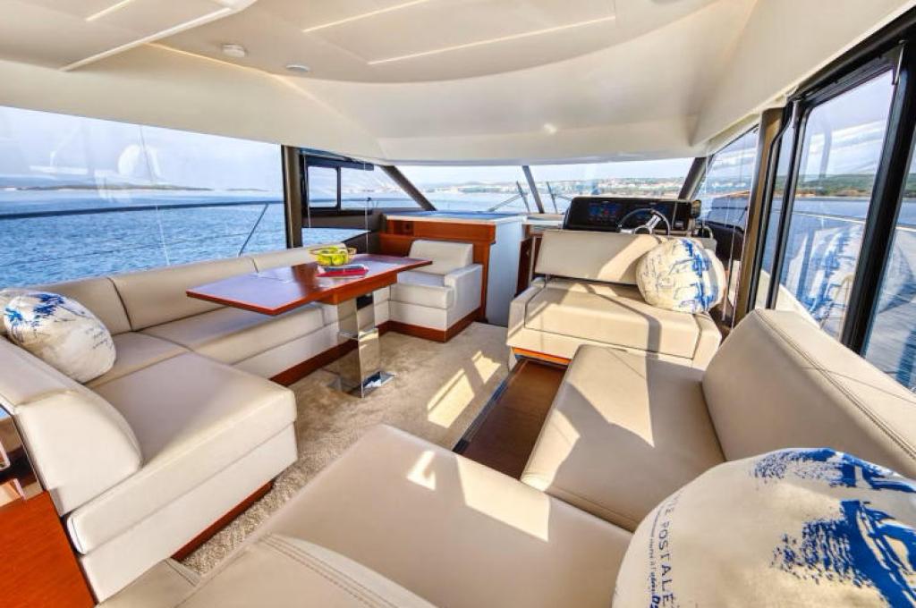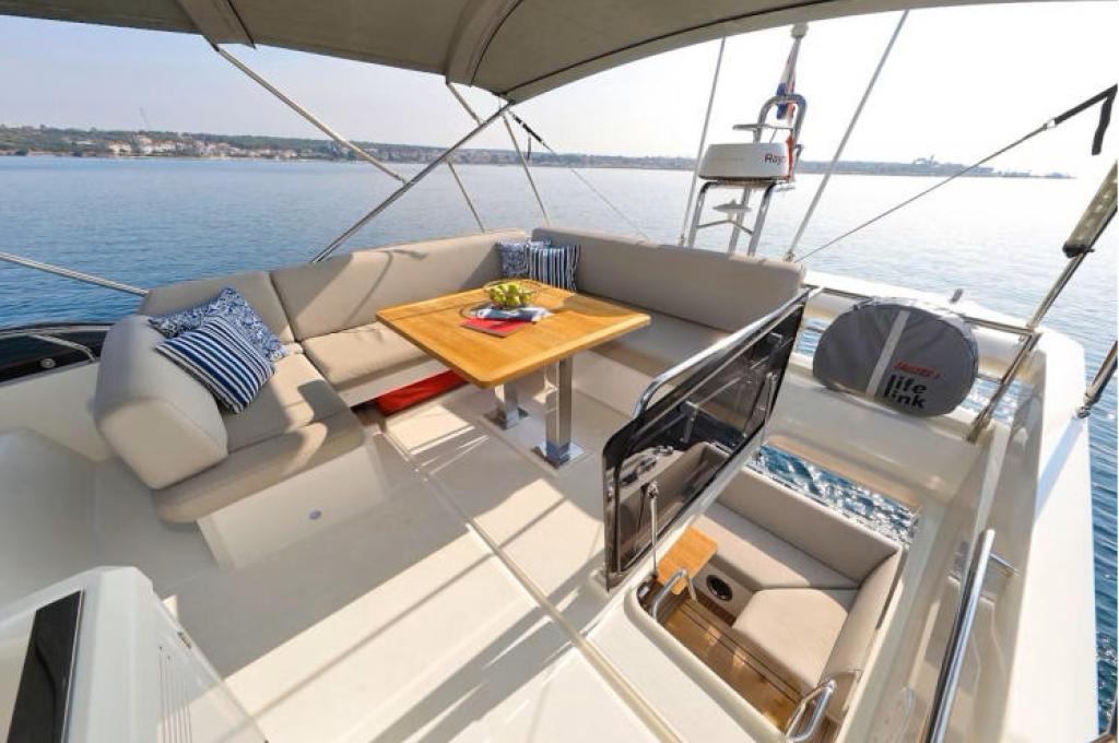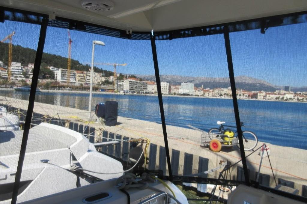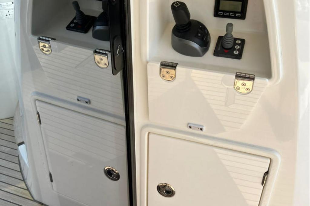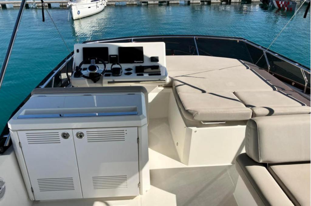 | Outside | Anchor chain counter, Bathing platform, Bimini top, Cockpit speakers, Cockpit cushions, Cockpit table, electr. winch, Fender, Anchor winch remote control, Mooring lines, Flybridge, hydraul. Gangway, Refrigerator on flybridge, Teak in cockpit |