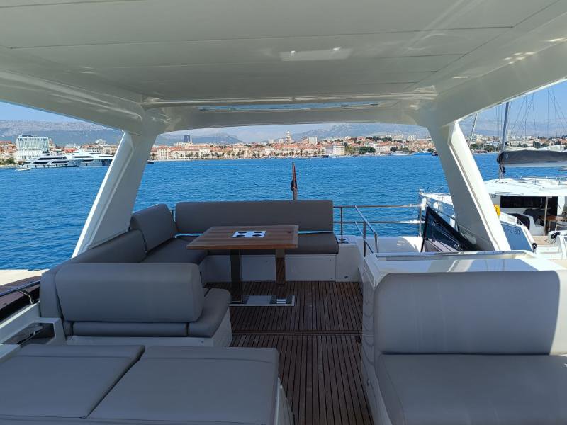 | Outside | Anchor with chain, Bathing platform, Cockpit speakers, Foldable cockpit table, Deck cushions, Mooring lines, Flybridge, Hardtop, hydraul. Gangway, Jetski, Refrigerator on flybridge, Teak on Flybridge, LED submarine lights |