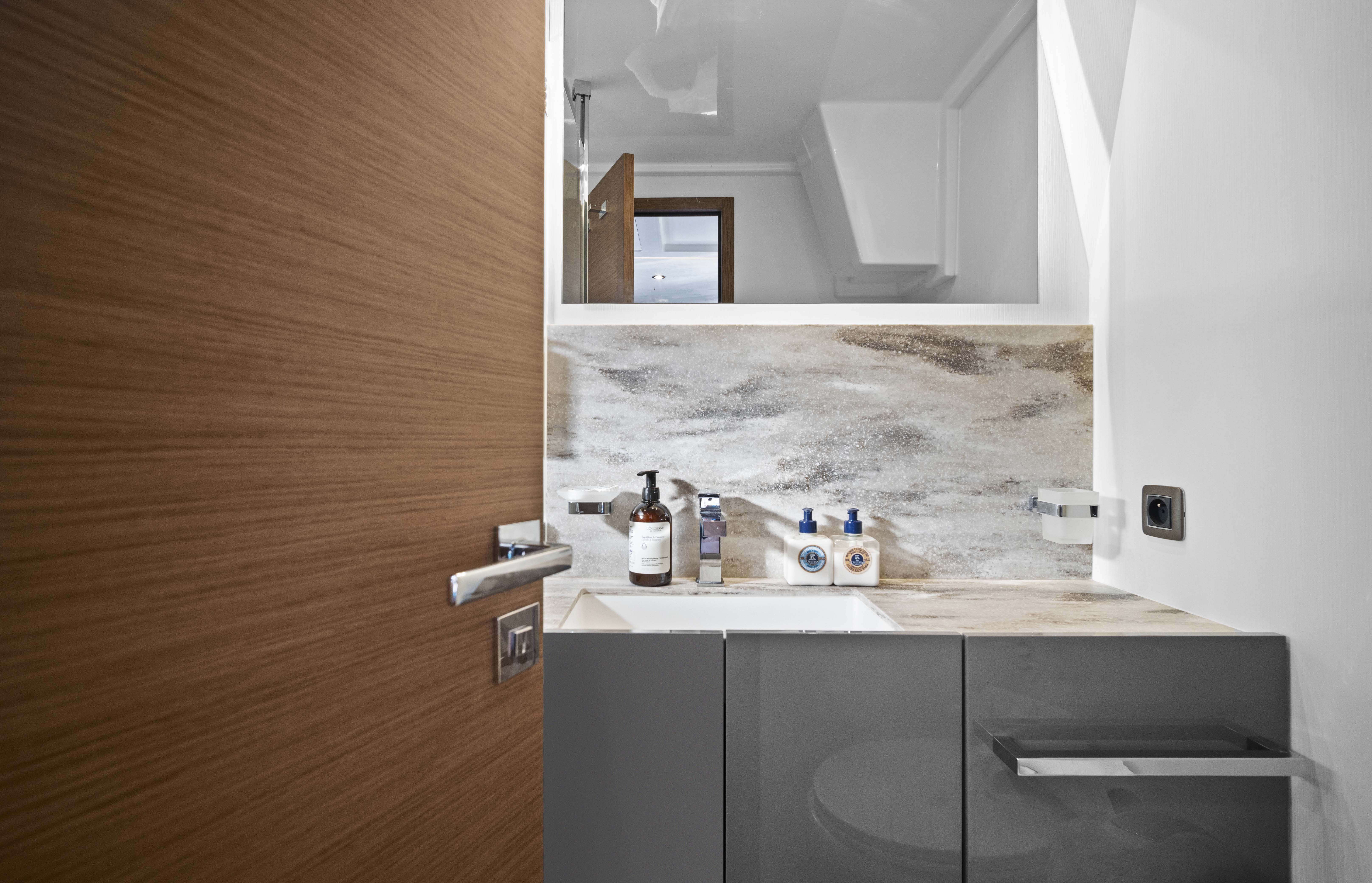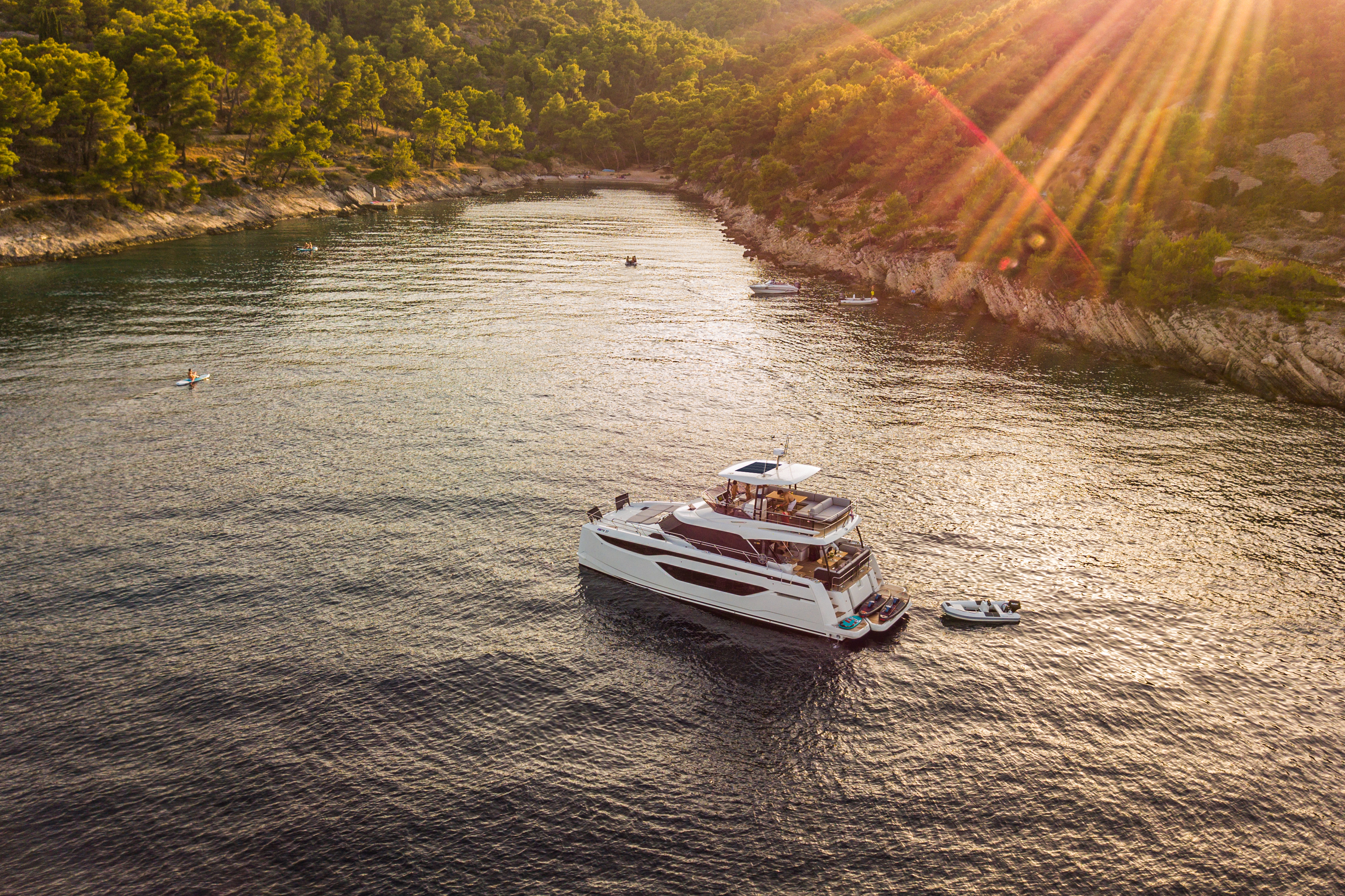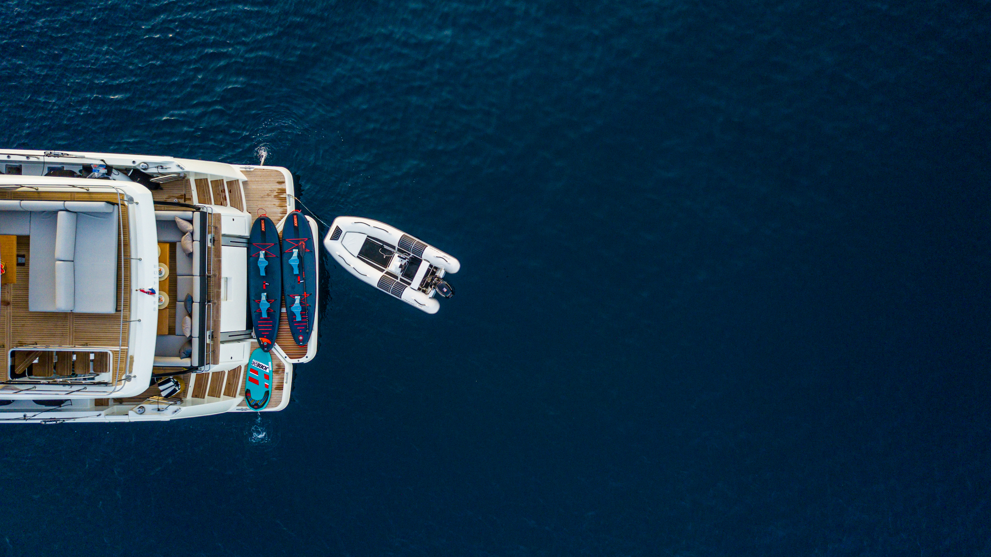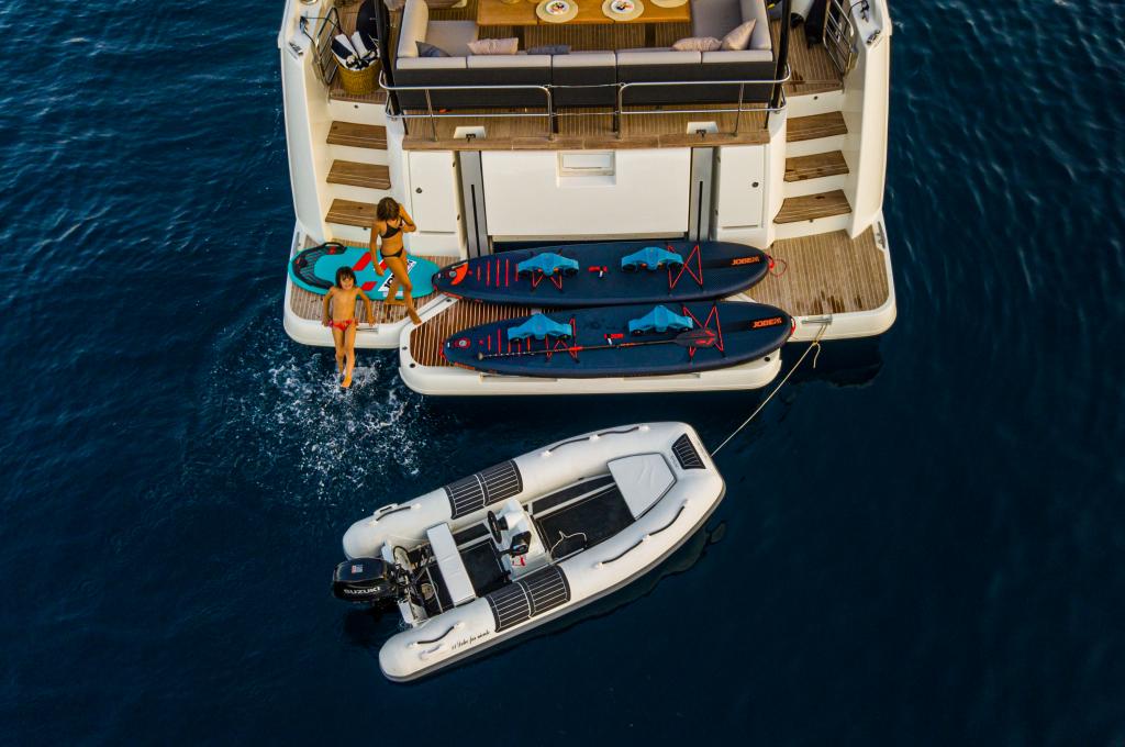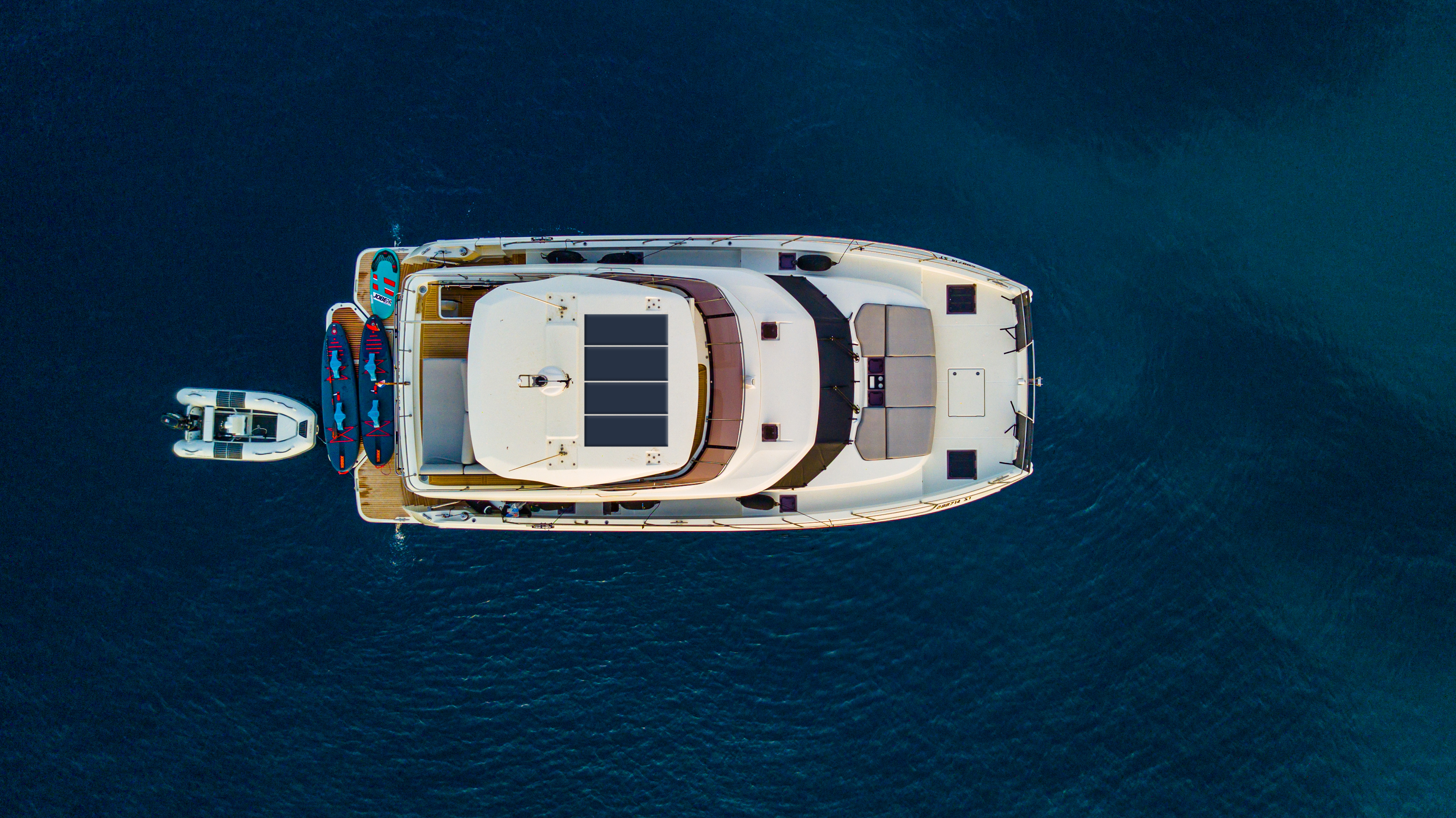 | Outside | Bathing platform (hydr.), Cockpit speakers, Deck cushions, electr. winch, Hardtop, hydraul. Gangway, Refrigerator on flybridge, Snorkeling gear, Teak in cockpit, Teak deck, LED submarine lights |