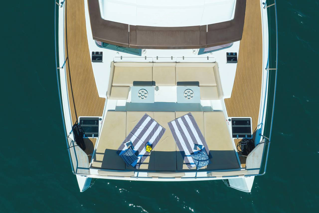 | Outside | 12V - connection, Anchor with chain, Bathing ladder, Bathing platform, Bimini top, Cockpit shower, Cockpit cushions, Cockpit table, Deck cushions, Electr. anchor windlass, BBQ, Solar panels |