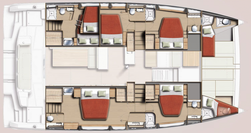 | Inside | Oven, Ice cube machine, Gas oven, Freezer, Generator, Dishwasher, Heating, Inverter 12V/220V, Coffee machine, Airconditioning (independent from shore power), Refrigerator, Battery charger, Microwave oven, Pantry equipment, Radio with MP3, Safe for valuables, TV, fans in cabins, Watermaker, WC (electr.), Wine fridge |