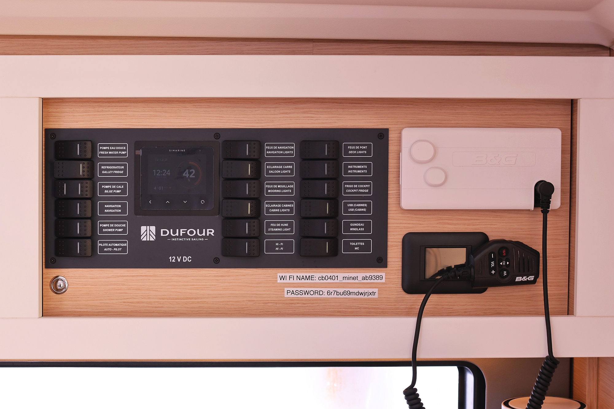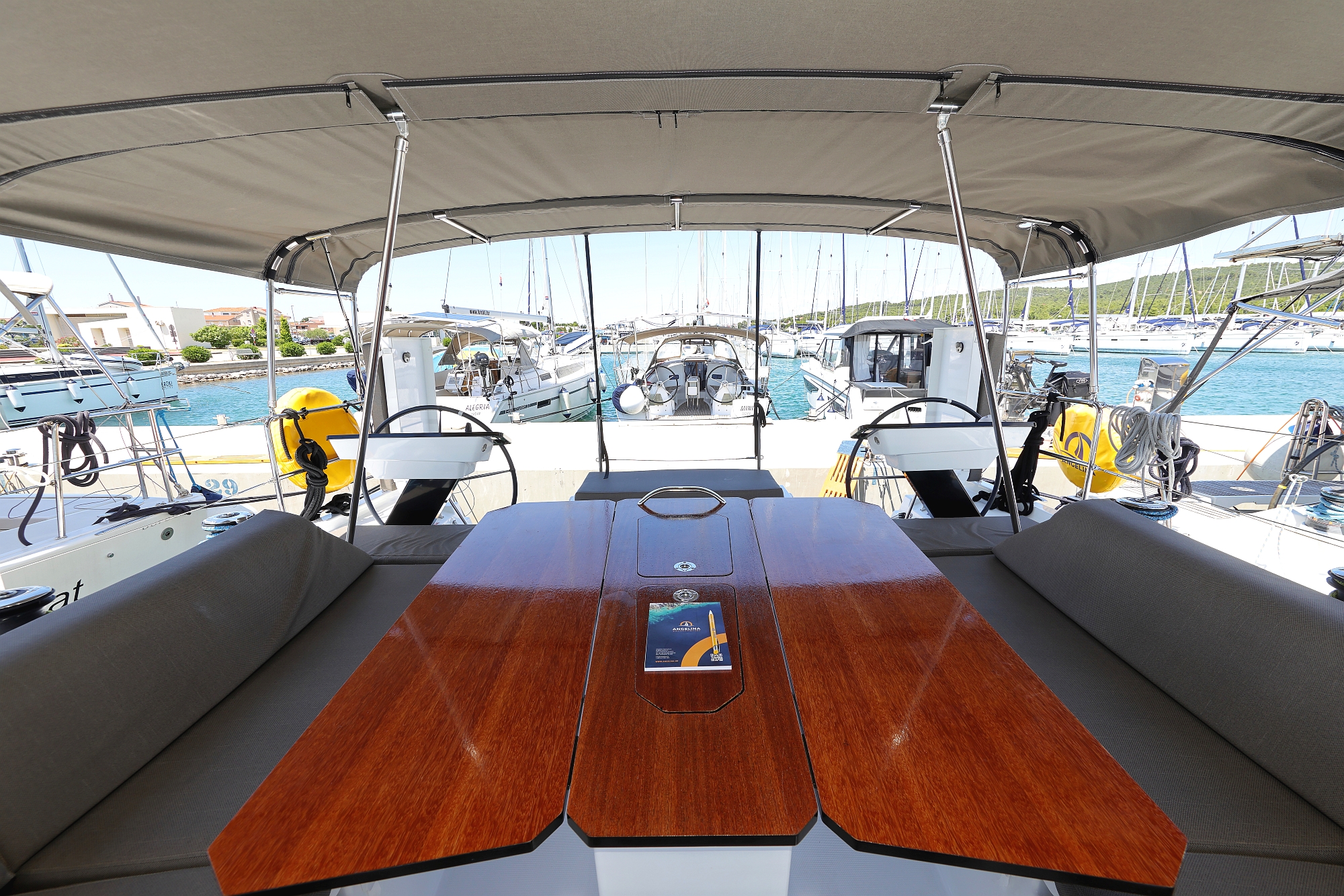 | Outside | 220V shore connection, Bathing platform, Bimini top, Boat hook, Cockpit shower, Cockpit speakers, Cockpit cushions, Cockpit table, Fender, Mooring lines, Gangway, BBQ, Solar panels, Sprayhood, Water hose, Windex, Winches |