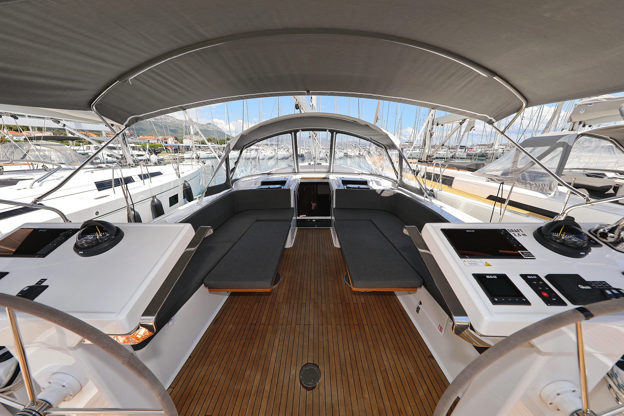 | Outside | Bathing platform, Bimini top, Cockpit speakers, Cockpit cushions, Cockpit table, Deck cushions, Electr. main sail winch, Solar panels, Sprayhood, Teak in cockpit |