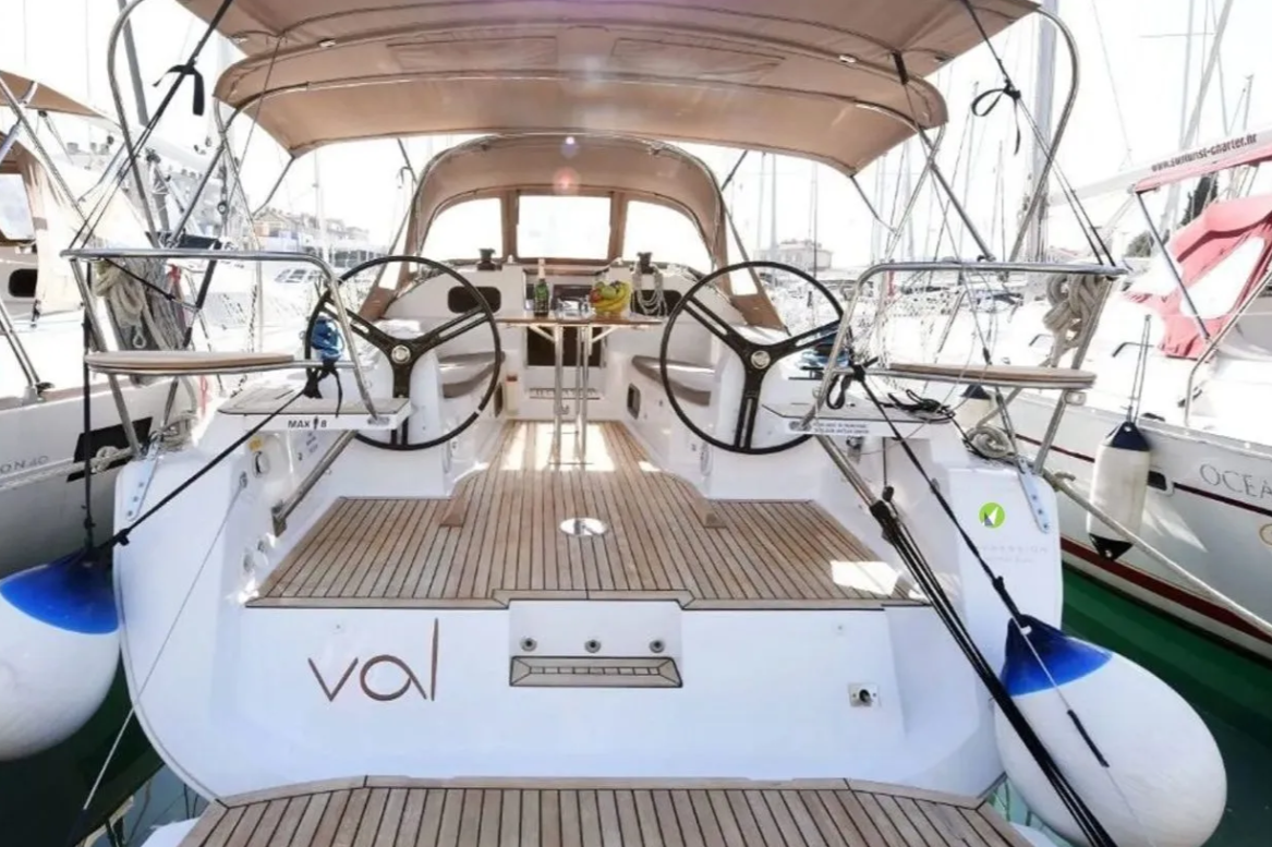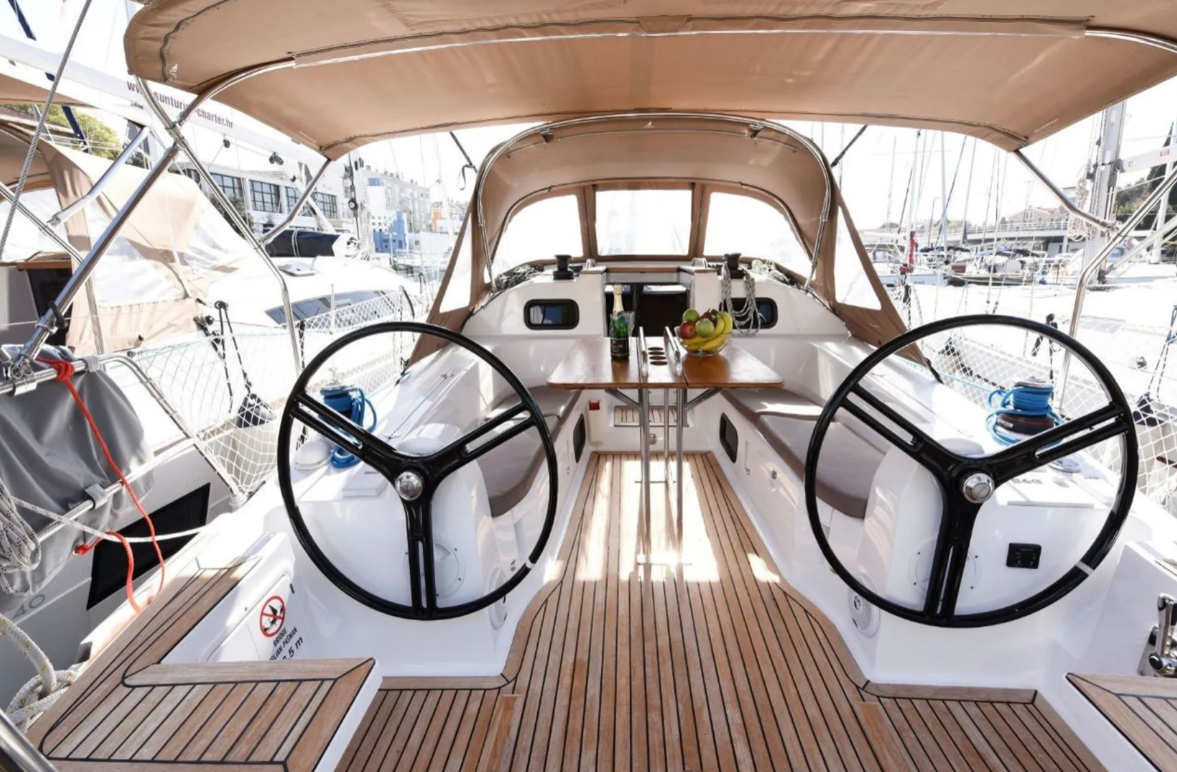 12V - connection, Anchor with chain, Bathing ladder, Bathing platform, Bimini top, Cockpit shower, Cockpit speakers, Cockpit table, Deck lights, Deck cushions, Electr. anchor windlass, Gangway, Solar panels, Sun deck, Sprayhood, Teak in cockpit, Windex |