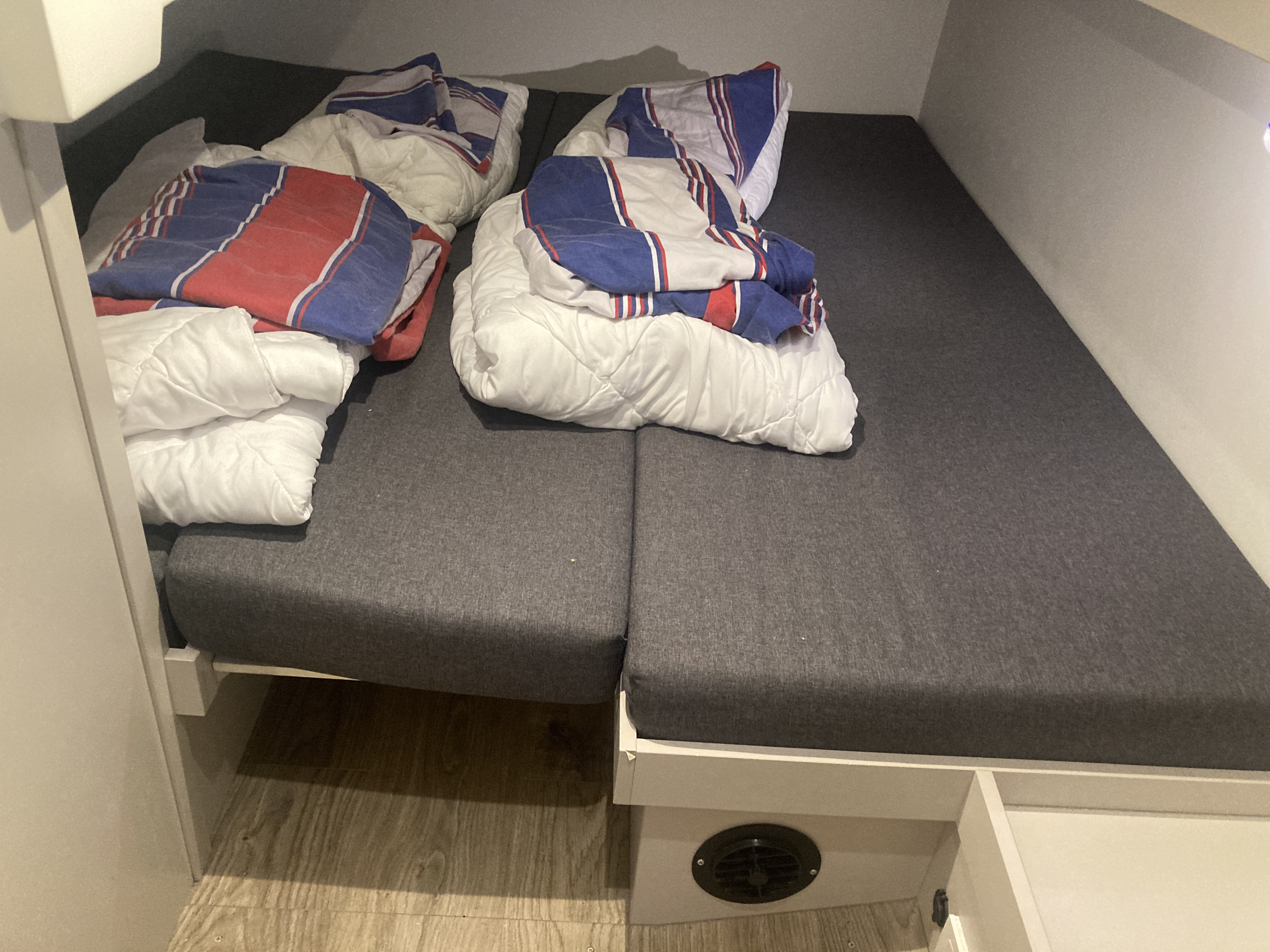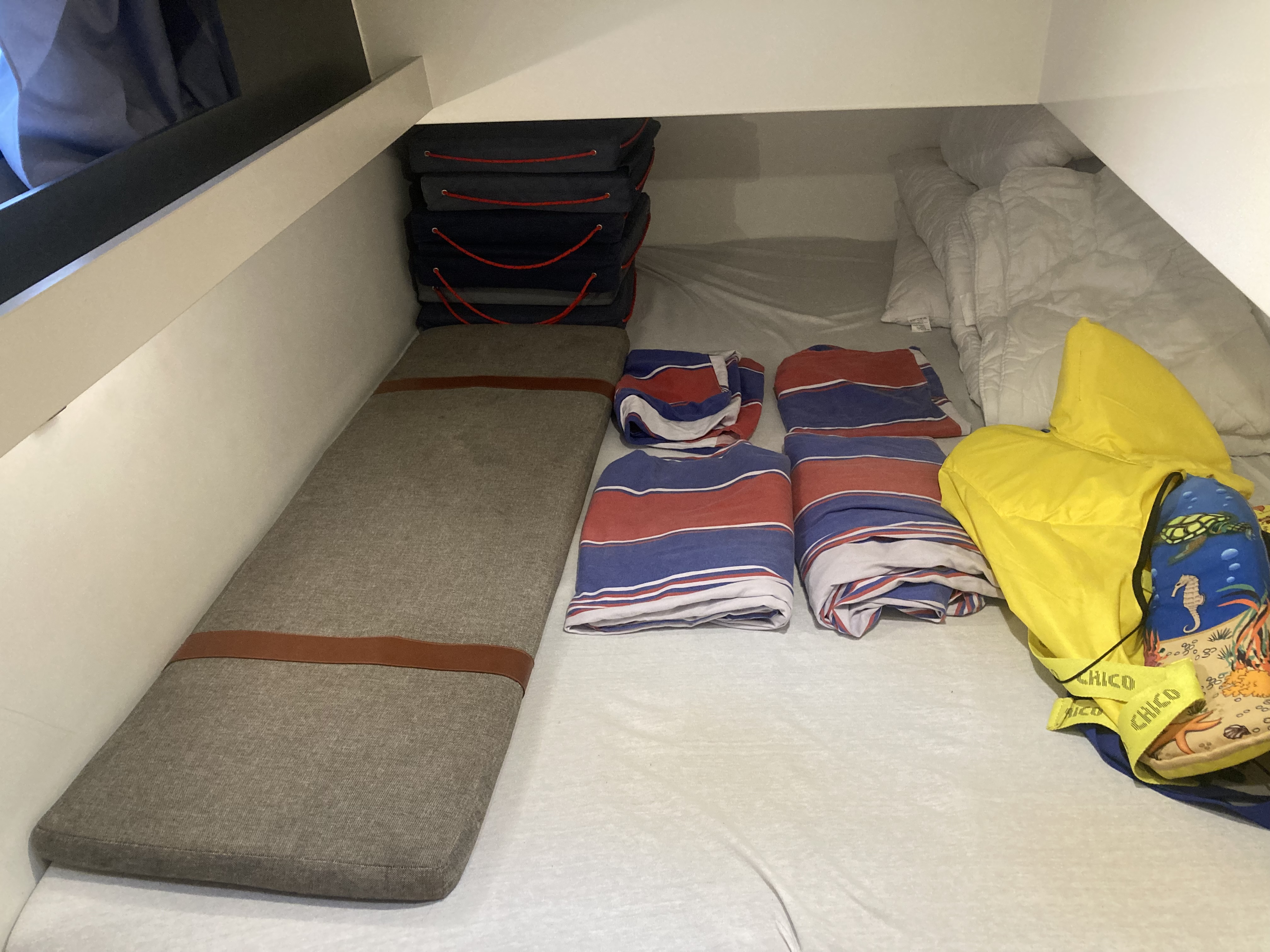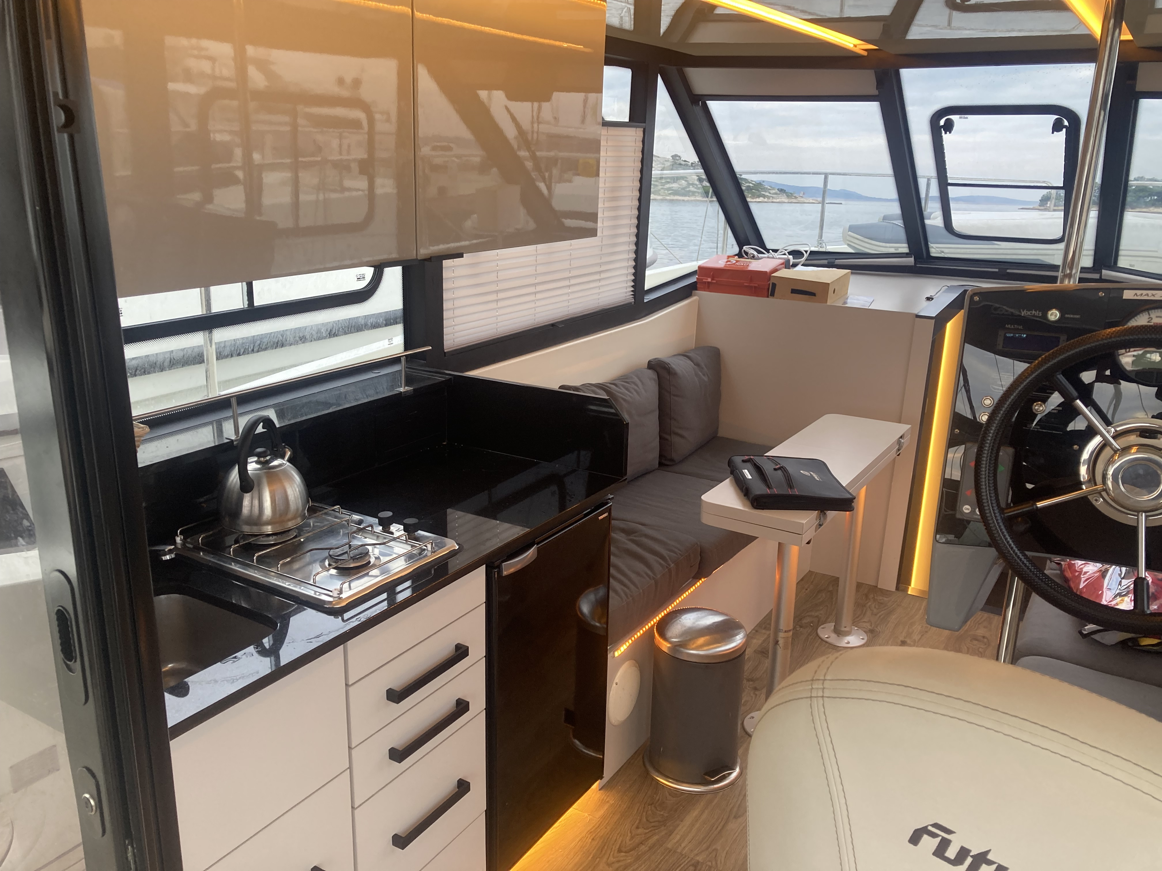Die Batterien für die Bordelektronik (Kühlschrank, Licht, Toiletten) waren definitiv tot. Der Bestuhlung für den Esstisch draußen war sehr stark durch das Salzwasser angegriffen. Aber man konnte es nutzen.