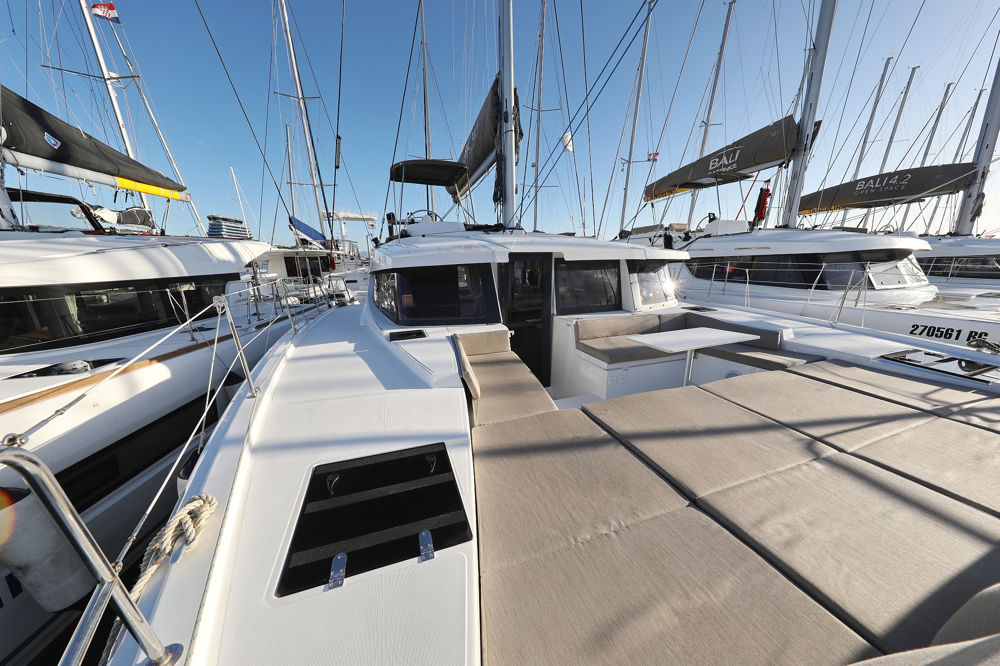 | Outside | 12V - connection, 220V shore connection, Anchor with chain, Boat hook, Cockpit shower, Cockpit speakers, Cockpit cushions, Cockpit table, Deck cushions, Electr. anchor windlass, electr. winch, Fender, Mooring lines, Gangway, BBQ, Hardtop, Solar panels, Sun deck, Water hose, Winches |