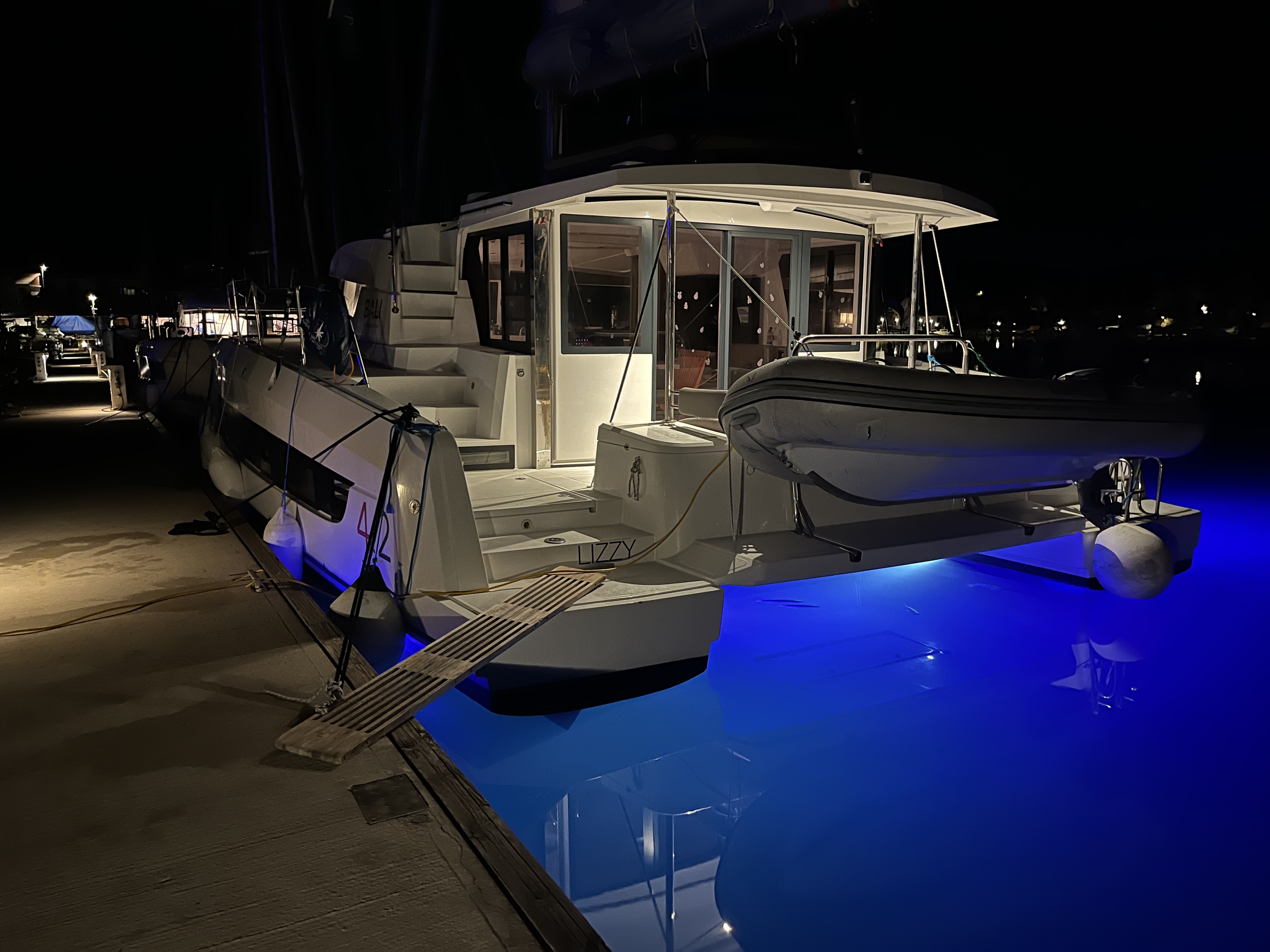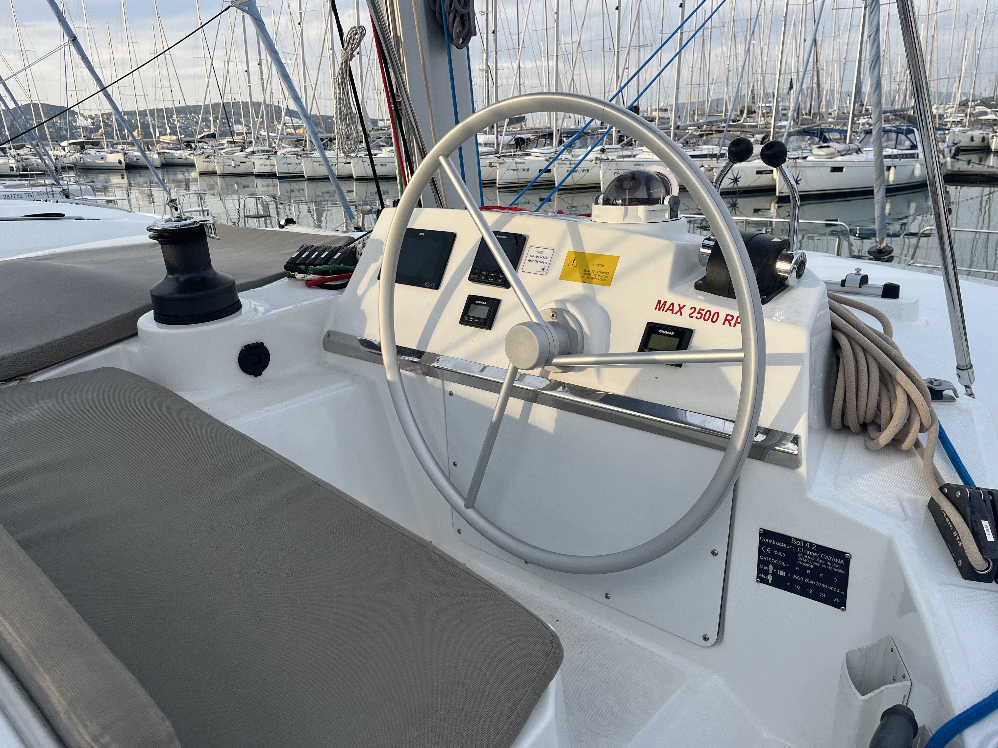| Outside | Anchor with chain, Anchor chain counter, Bathing ladder, Jerrycan of petrol, Bimini top, Boat hook, Cockpit shower, Cockpit cushions, Cockpit table, Cover brush, Electr. anchor windlass, electr. winch, Fender, Mooring lines, Gangway, Ball fender, Plastic bucket, Snorkeling gear, Teak in cockpit, LED submarine lights, Wire (shroud) cutter, Water hose, Windex, Winches |