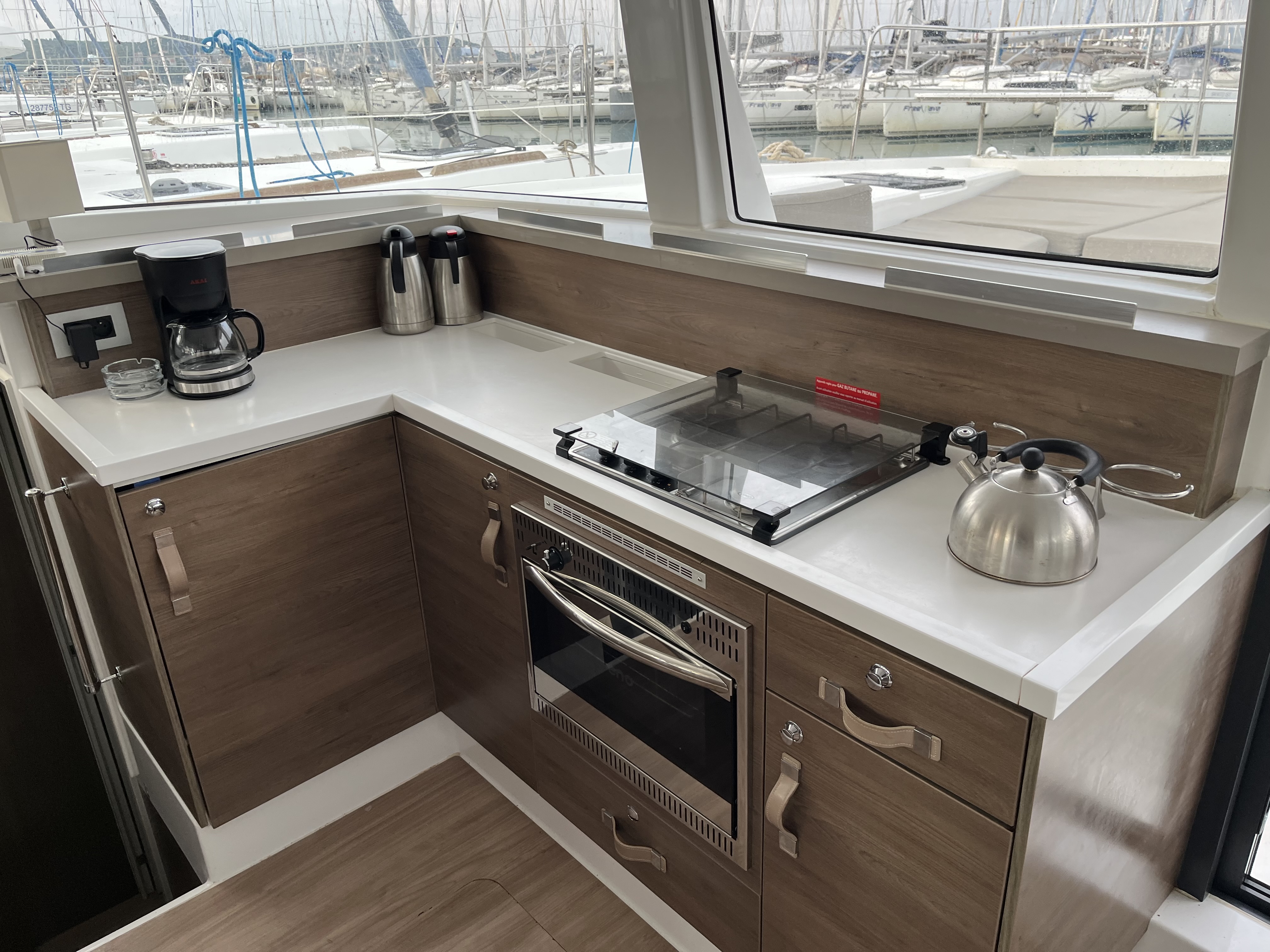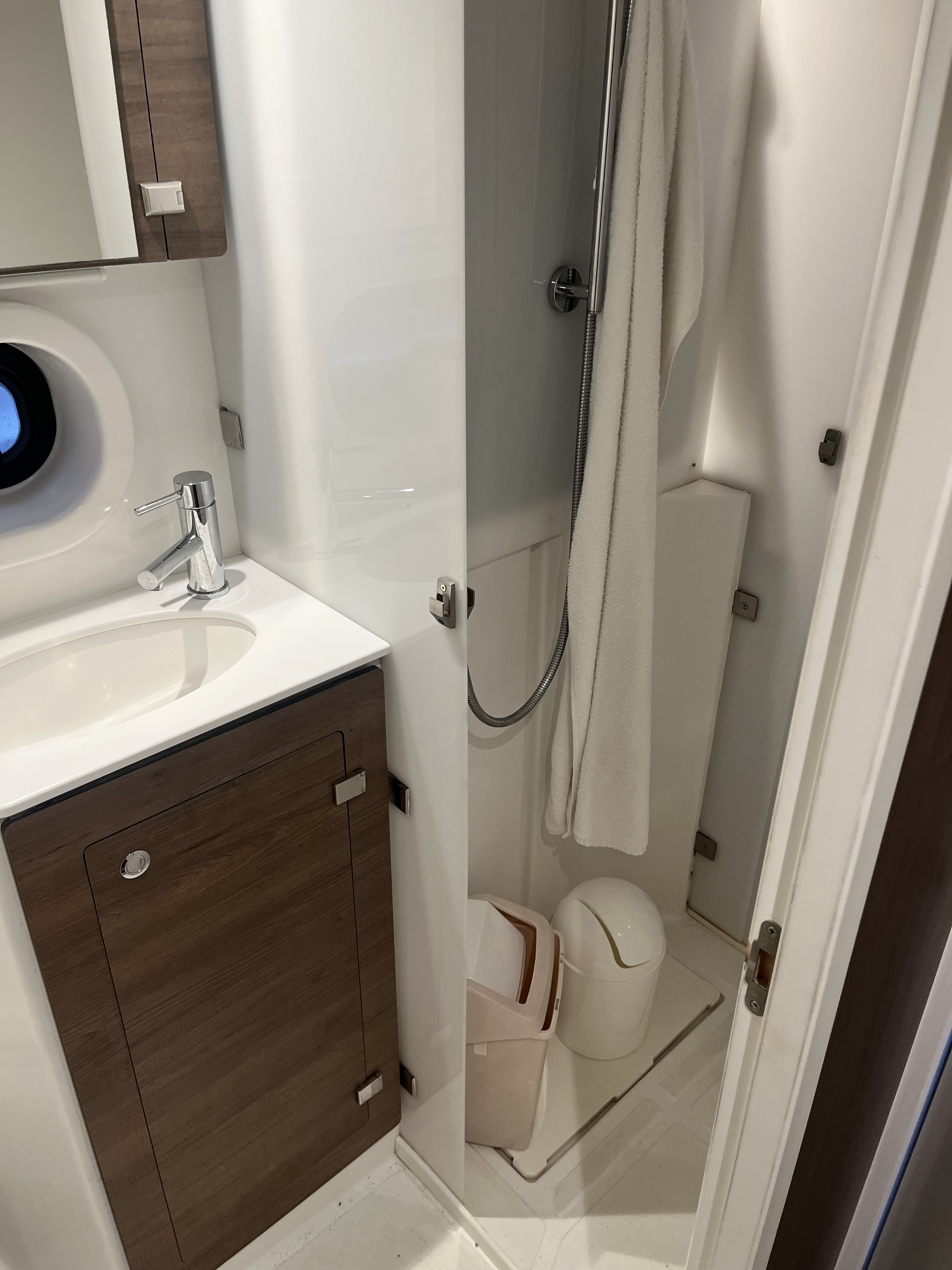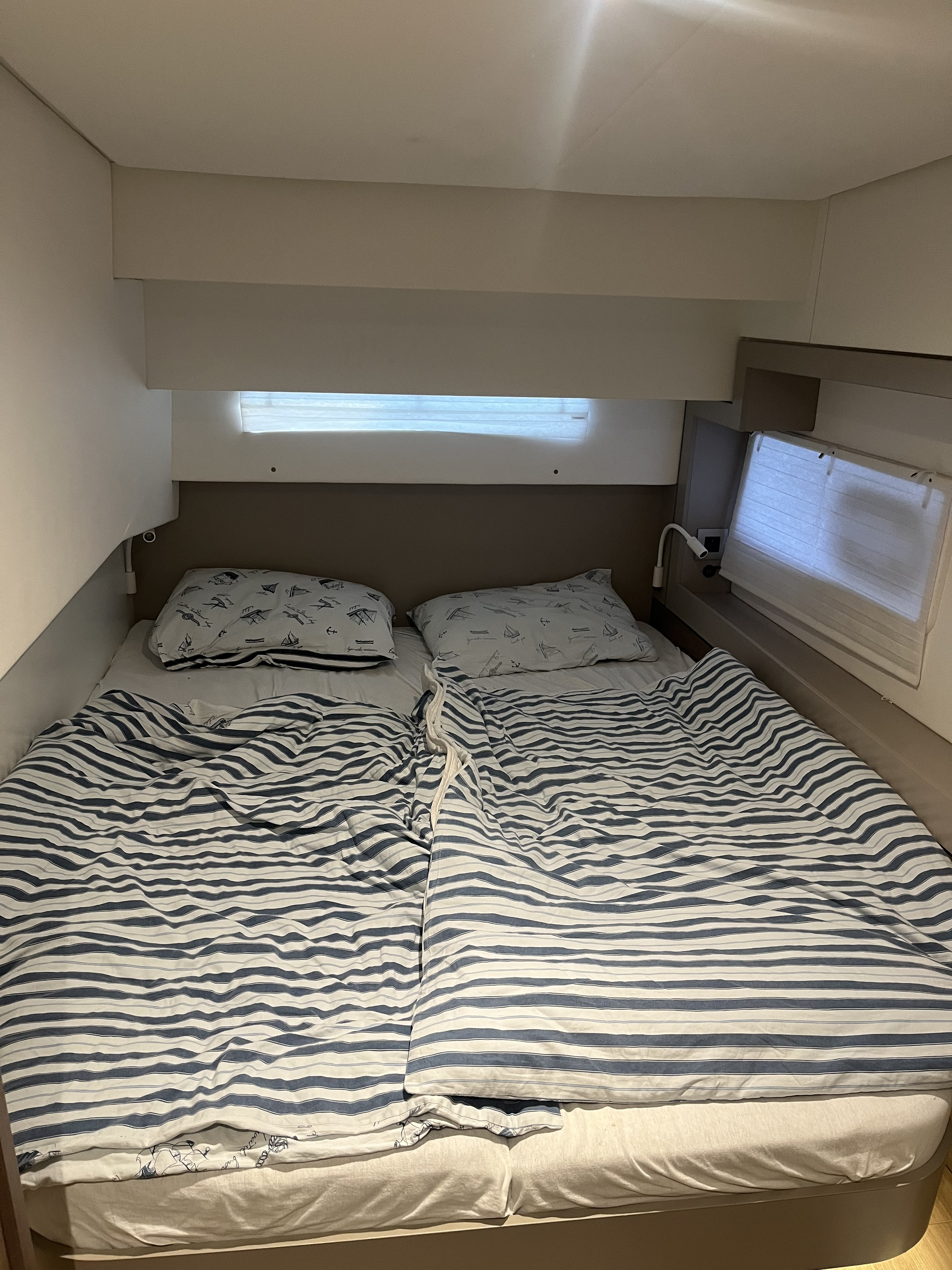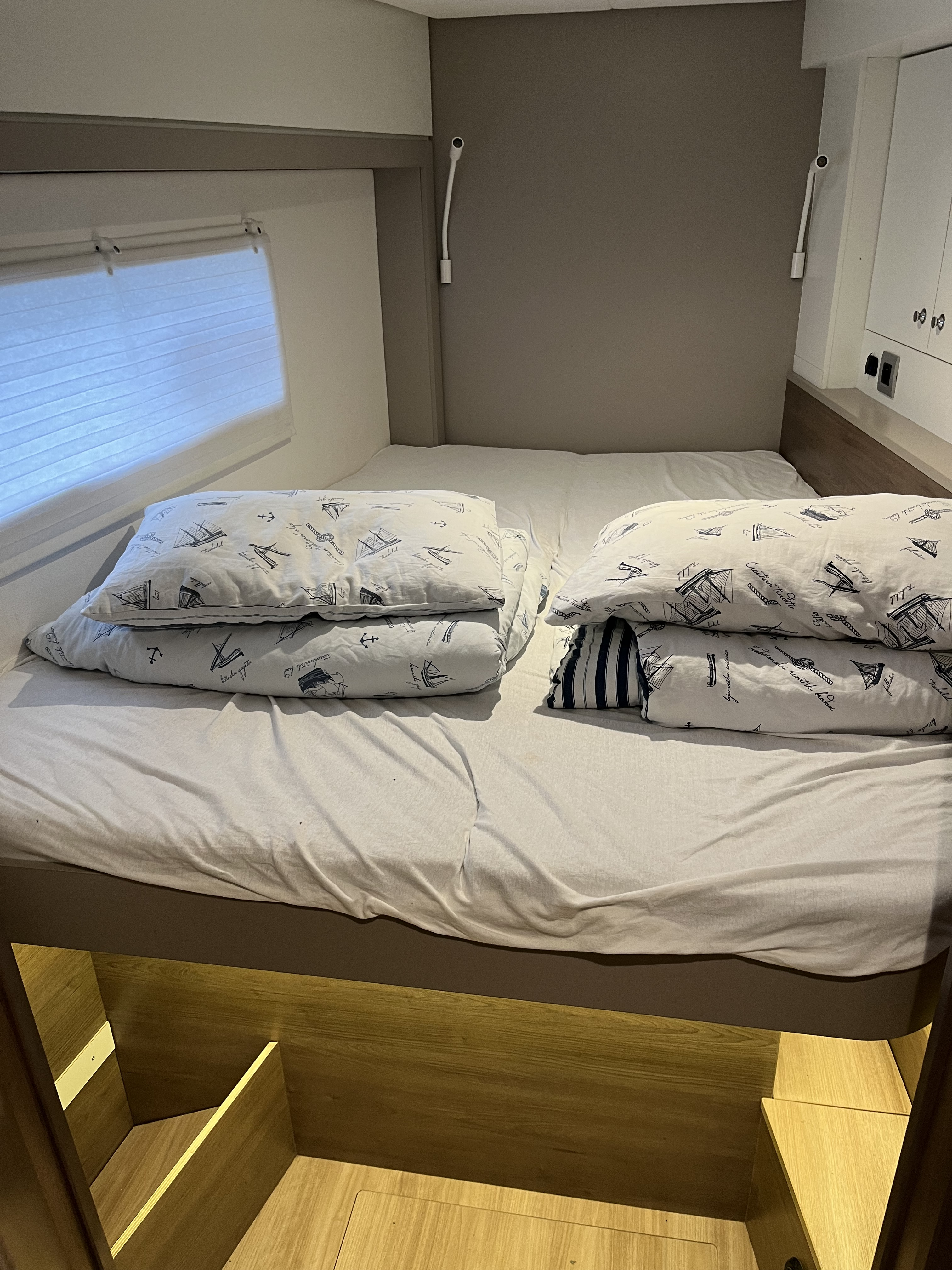 | Inside | Oven, Black water tank, Freshwater pump, Fusion sound system , Gas oven, Freezer, Heating, Inverter 12V/220V, Coat hangers, Toilet brush, Refrigerator, Shore power cable, Mosquito nets, Pantry equipment, Radio, USB Socket, fans in cabins, Kettle, WC pump |