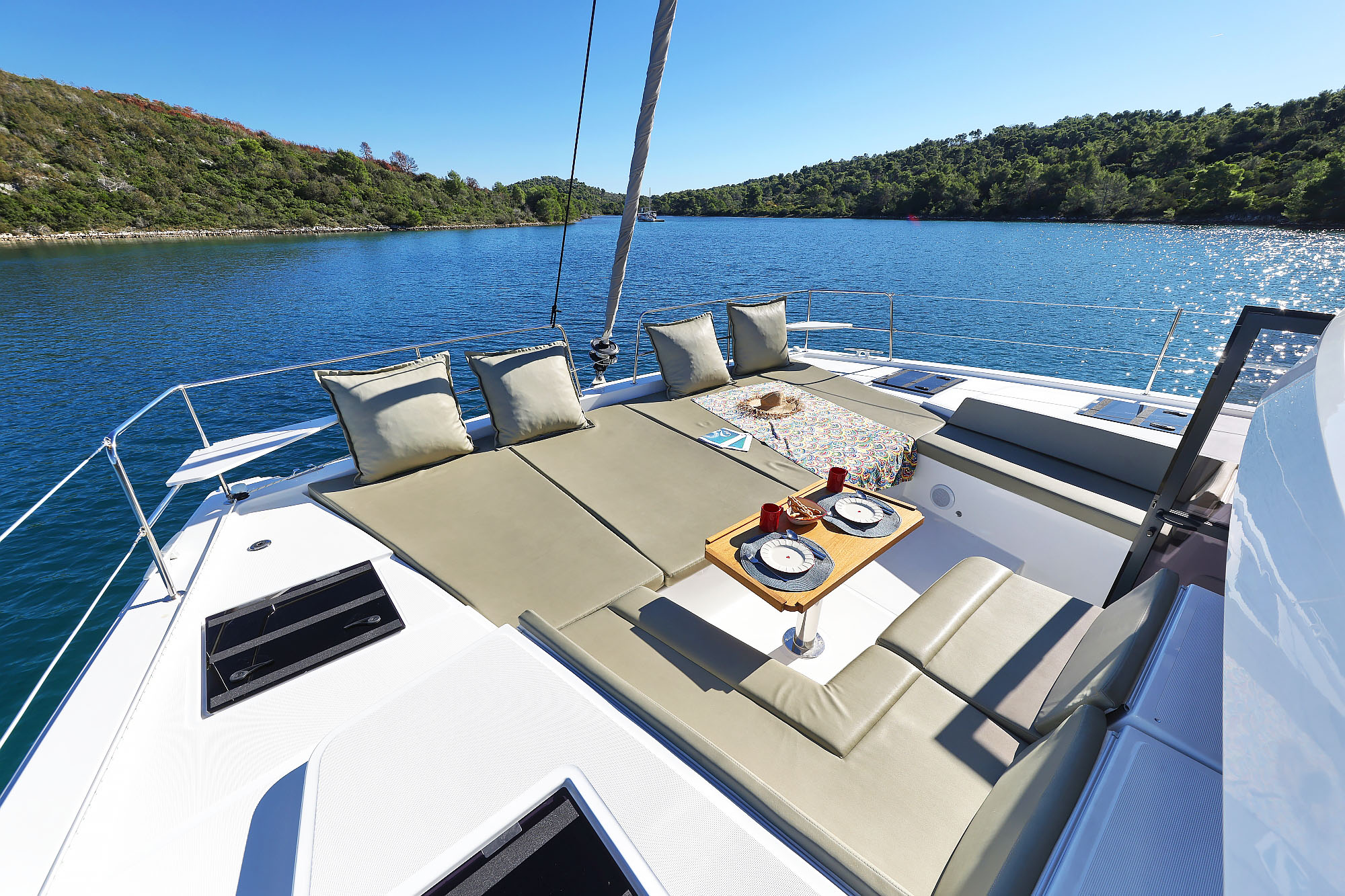 | Outside | Bathing platform, Bimini top, Cockpit shower, Cockpit speakers, Cockpit cushions, Cockpit table, Deck cushions, BBQ, Solar panels, Sun deck, Teak in cockpit |