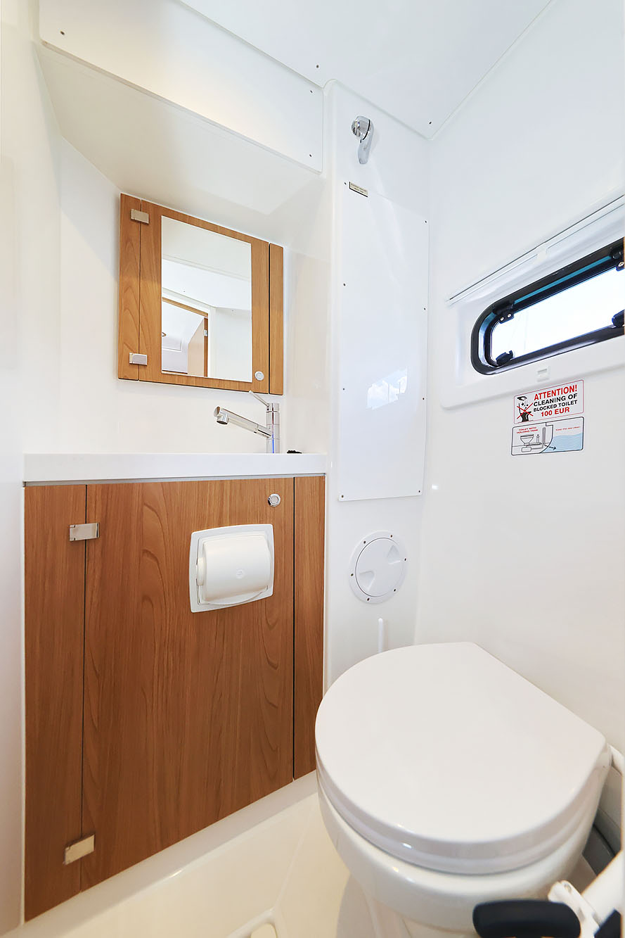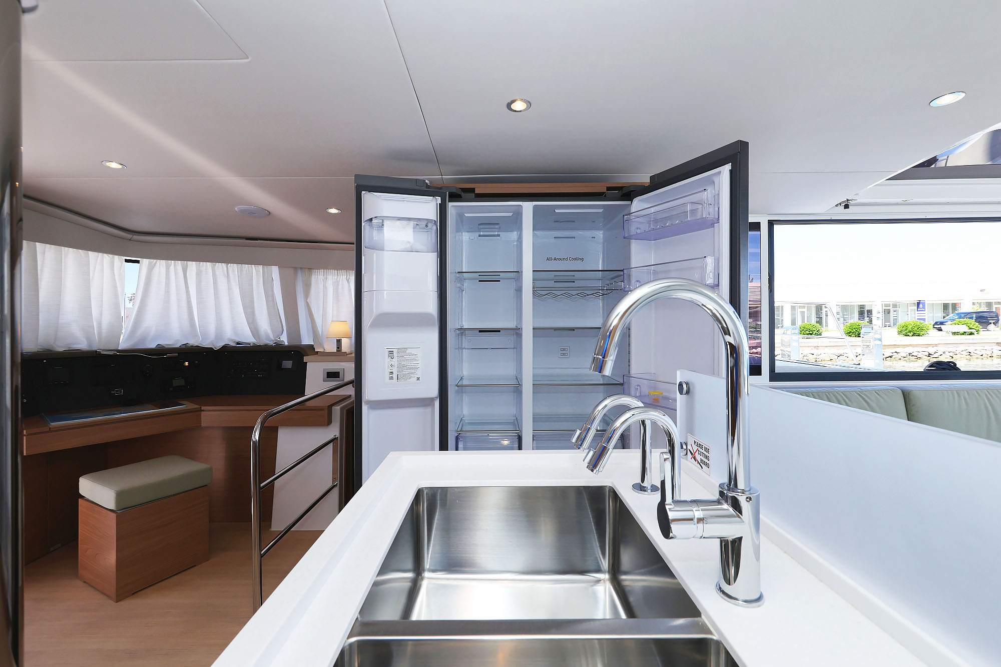 | Inside | Oven, Gas oven, Freezer, Generator, Dishwasher, Heating, Inverter 12V/220V, Coffee machine, Airconditioning (independent from shore power), Refrigerator, Battery charger, Microwave oven, Pantry equipment, Radio with MP3, TV, fans in cabins, Warm water, Watermaker, WC (electr.) |