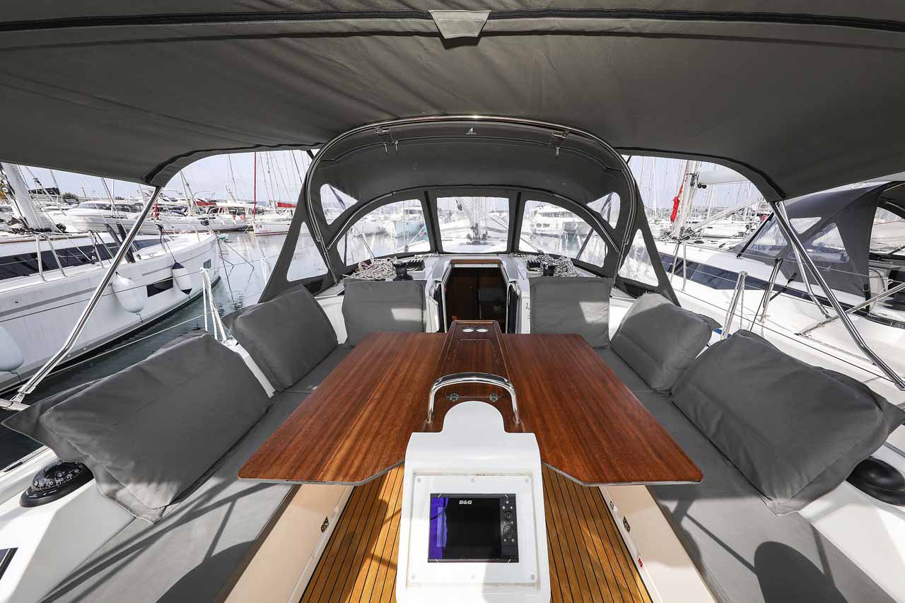 | Outside | 220V shore connection, Anchor with chain, Anchor winch, Bimini top, Boat hook, Cockpit shower, Cockpit speakers, Cockpit cushions, Cockpit table, Jerry cans for diesel, Electr. anchor windlass, Folding propeller, Fender, Mooring lines, Gangway, Ball fender, Plastic bucket, Solar panels, Sprayhood, Teak in cockpit, Wire (shroud) cutter, Canister for water, Water hose, Windex |