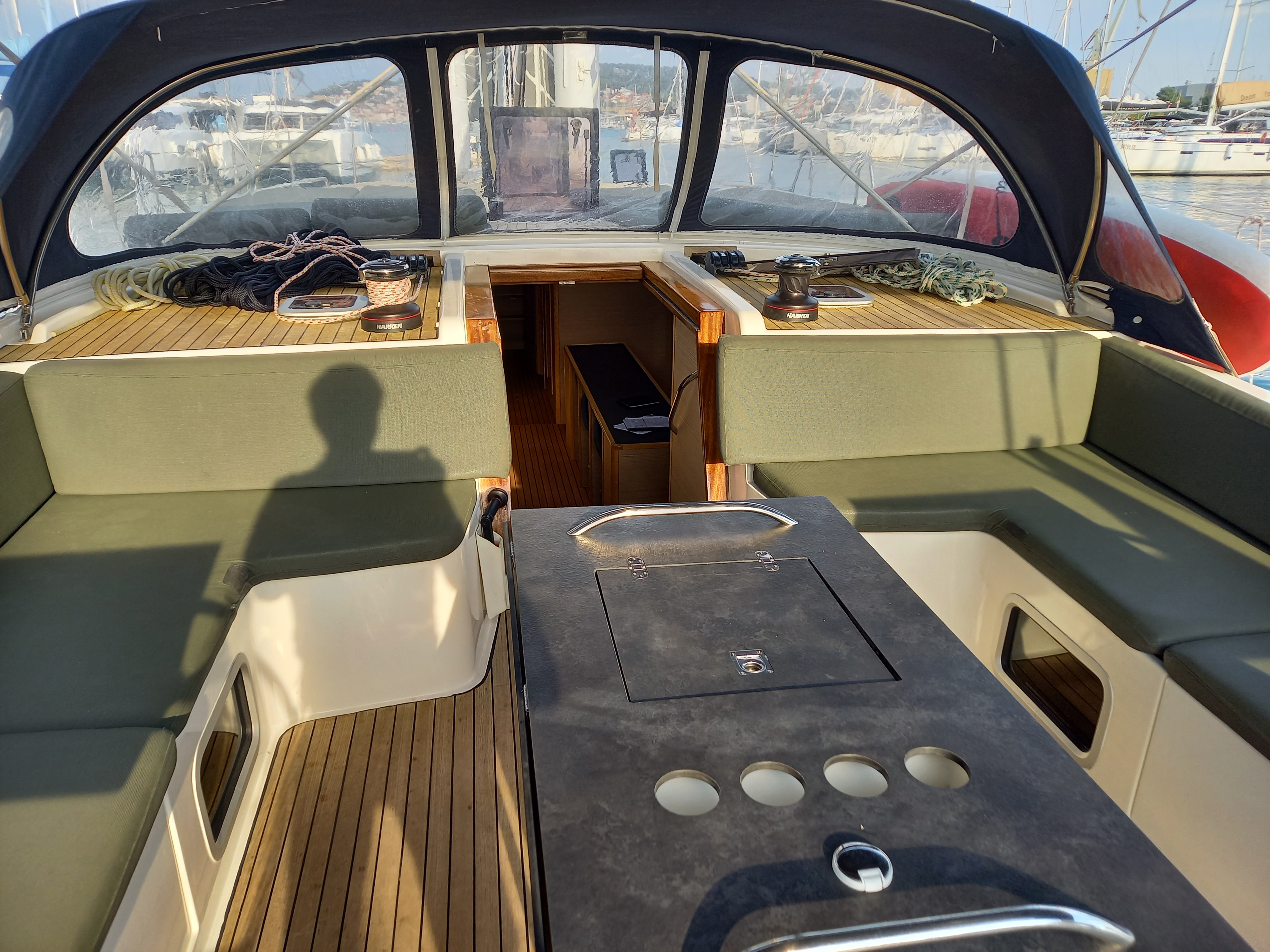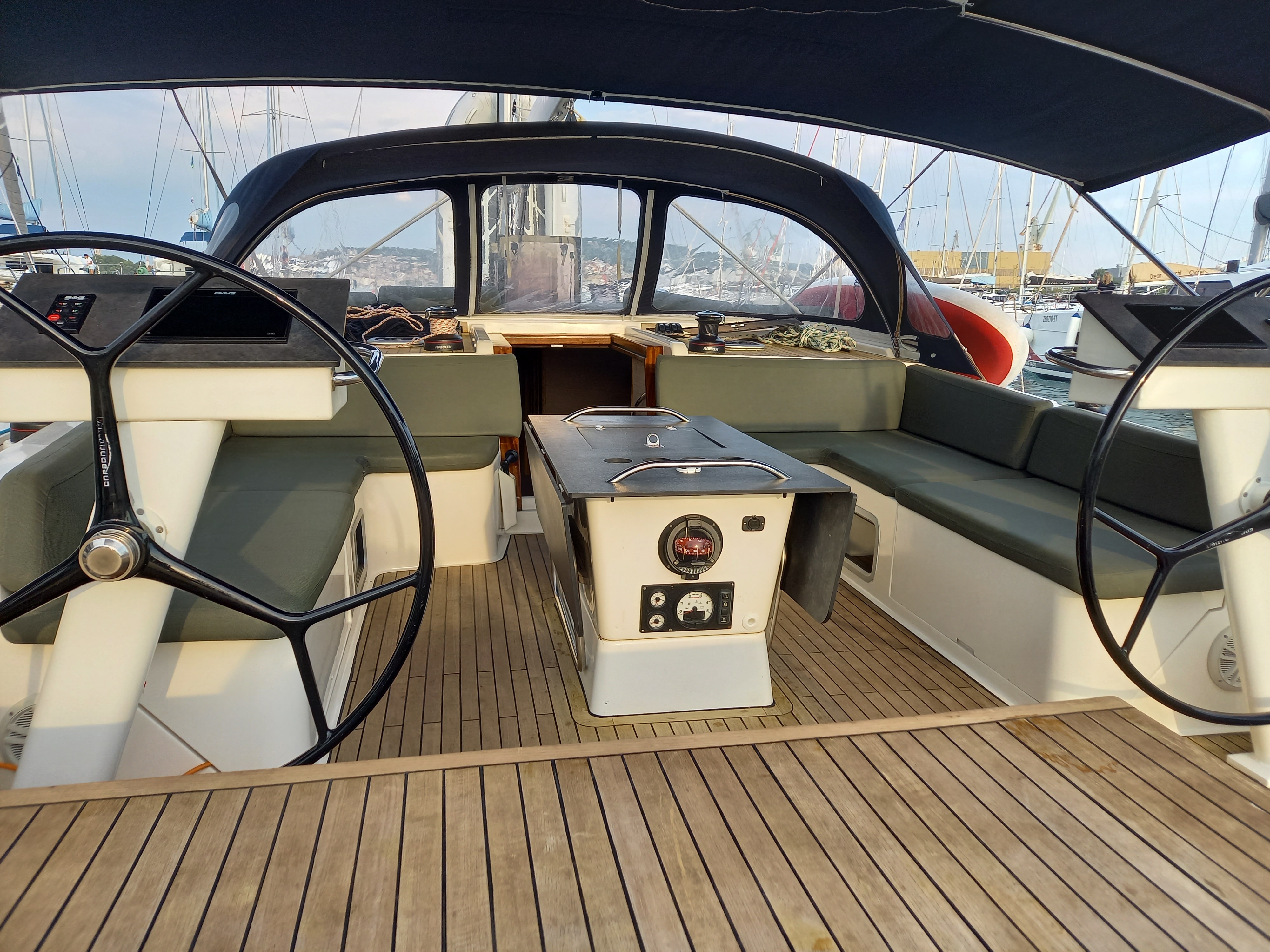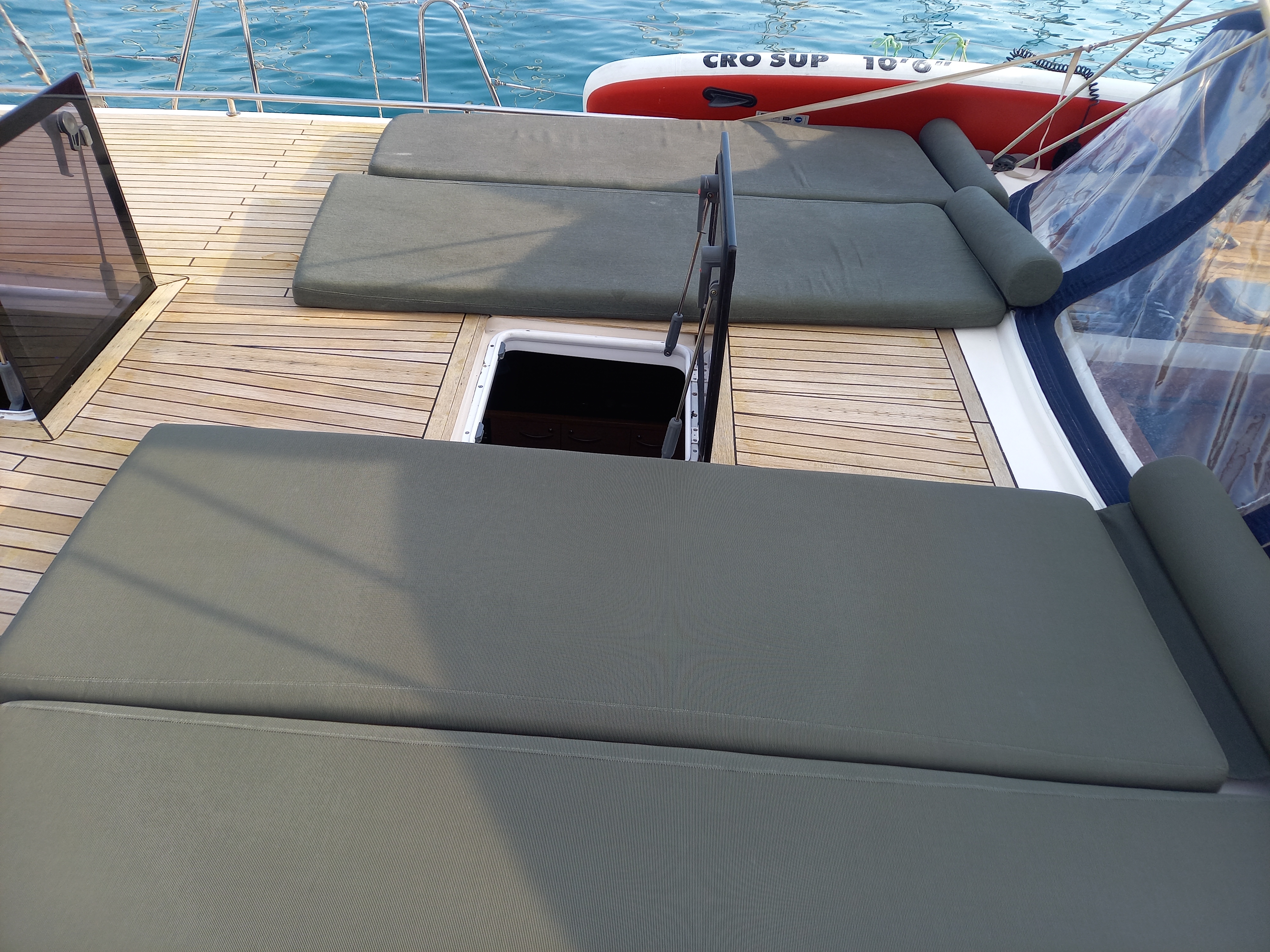 | Outside | 220V shore connection, Anchor with chain, Anchor with rope , Bimini top, Boat hook, Cockpit shower, Refrigerator in cockpit, Cockpit speakers, Cockpit cushions, Cockpit table, Cover brush, Jerry cans for diesel, Electr. anchor windlass, Fender, Mooring lines, Gangway, BBQ, Ball fender, Solar panels, Sprayhood, Canister for water, Water hose, Winches |
