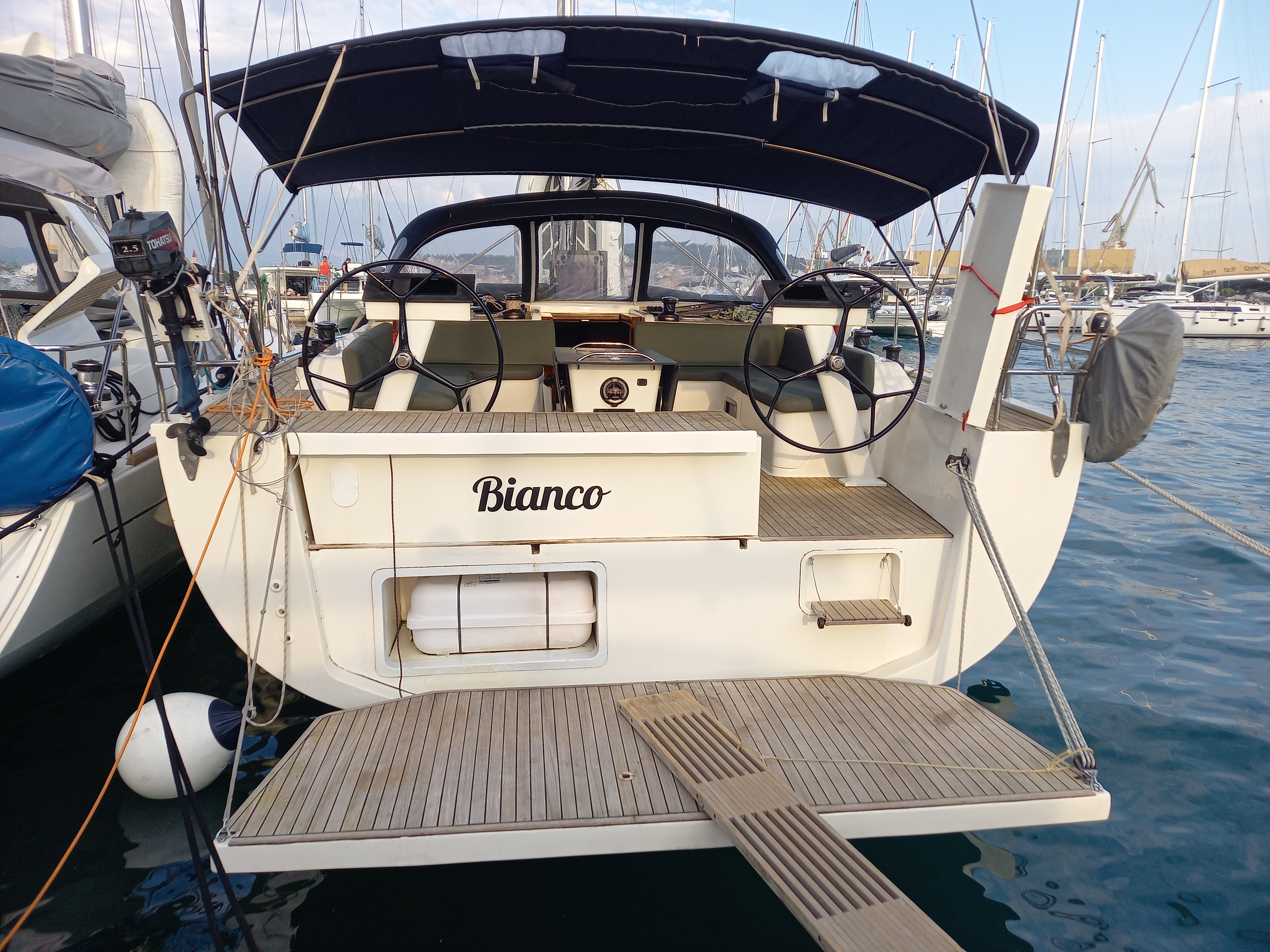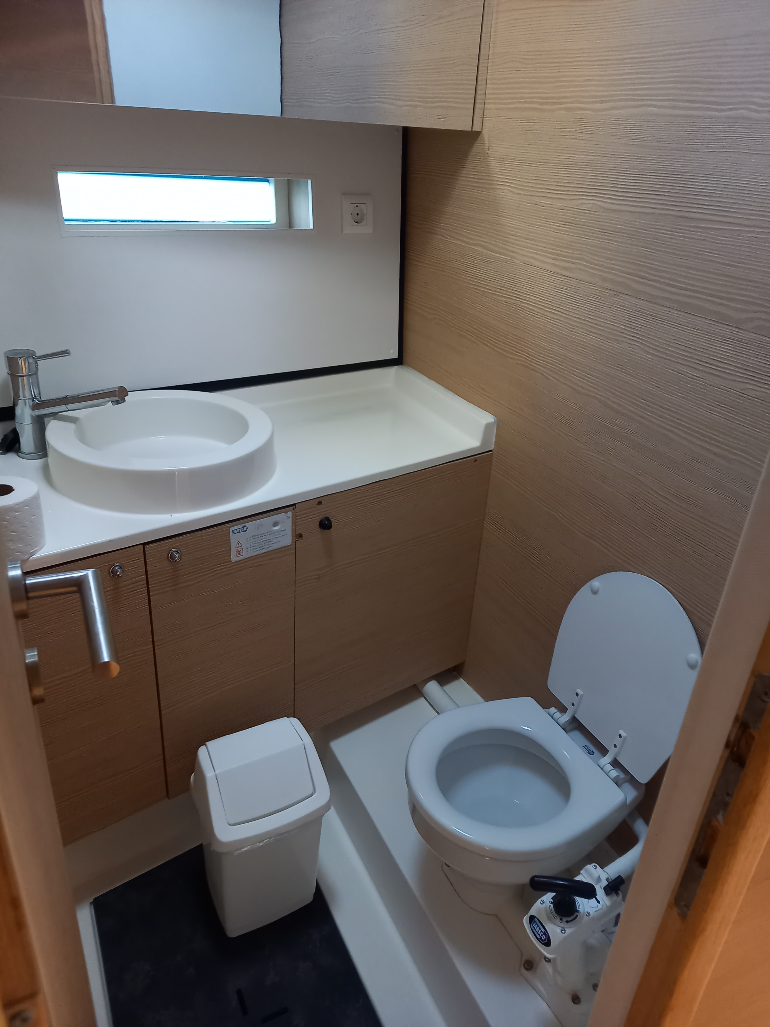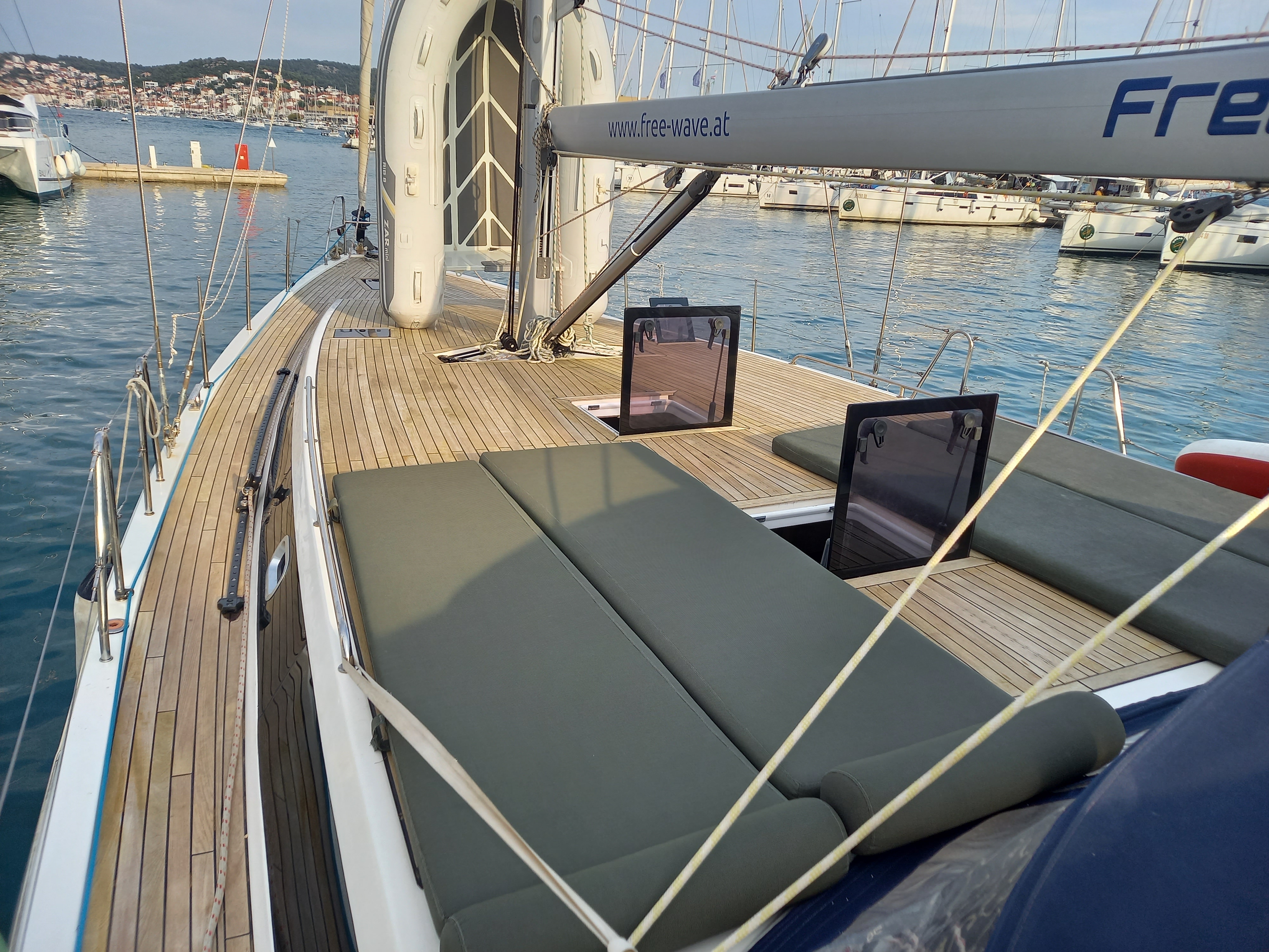 | Outside | 220V shore connection, Anchor with chain, Anchor with rope , Bimini top, Boat hook, Cockpit shower, Refrigerator in cockpit, Cockpit speakers, Cockpit cushions, Cockpit table, Cover brush, Jerry cans for diesel, Electr. anchor windlass, Fender, Mooring lines, Gangway, BBQ, Ball fender, Solar panels, Sprayhood, Canister for water, Water hose, Winches |