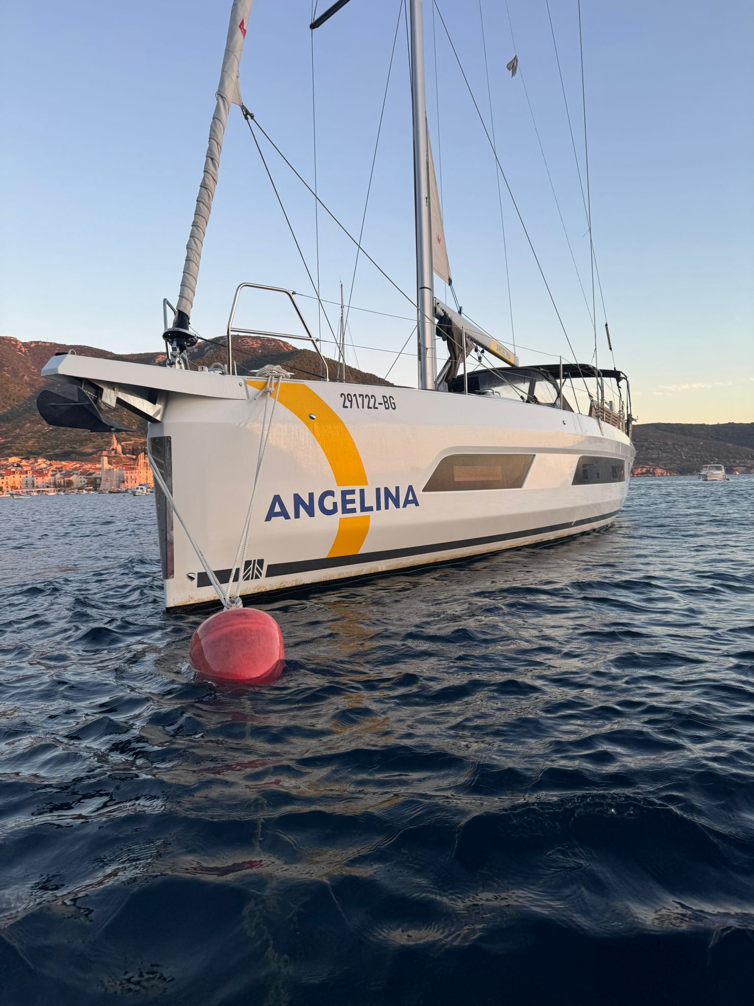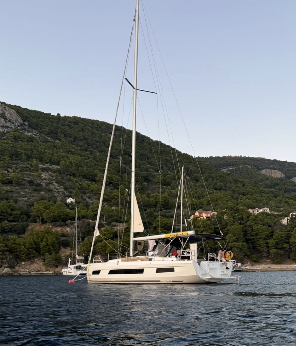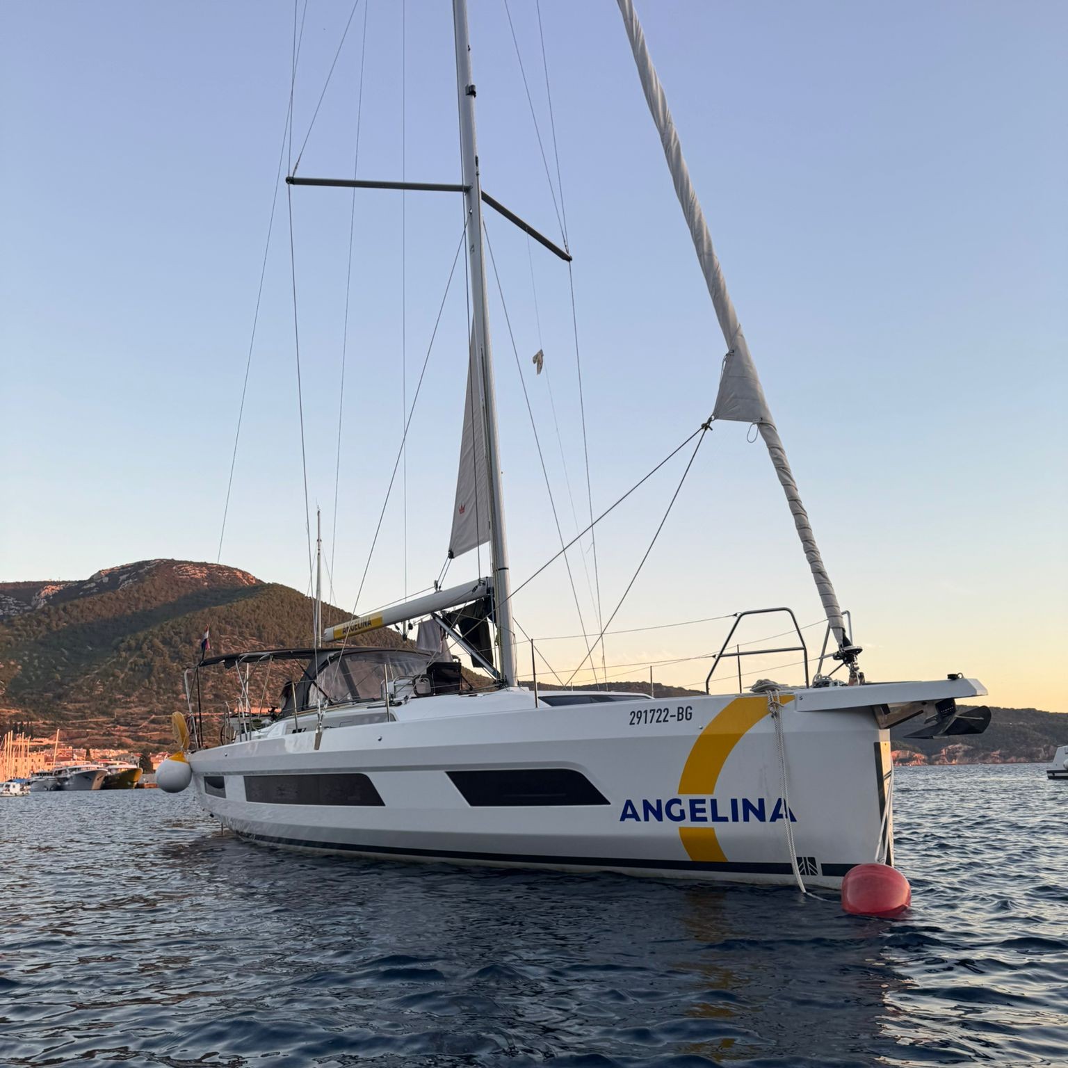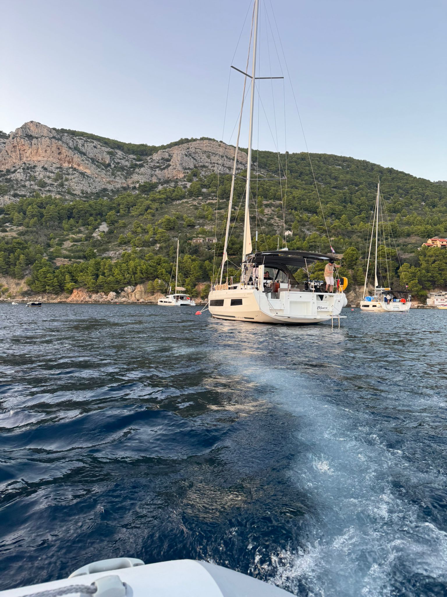 | Outside | 220V shore connection, Bathing platform, Bimini top, Boat hook, Cockpit shower, Cockpit speakers, Cockpit cushions, Cockpit table, Fender, Mooring lines, Gangway, BBQ, Solar panels, Sprayhood, Water hose, Windex, Winches |