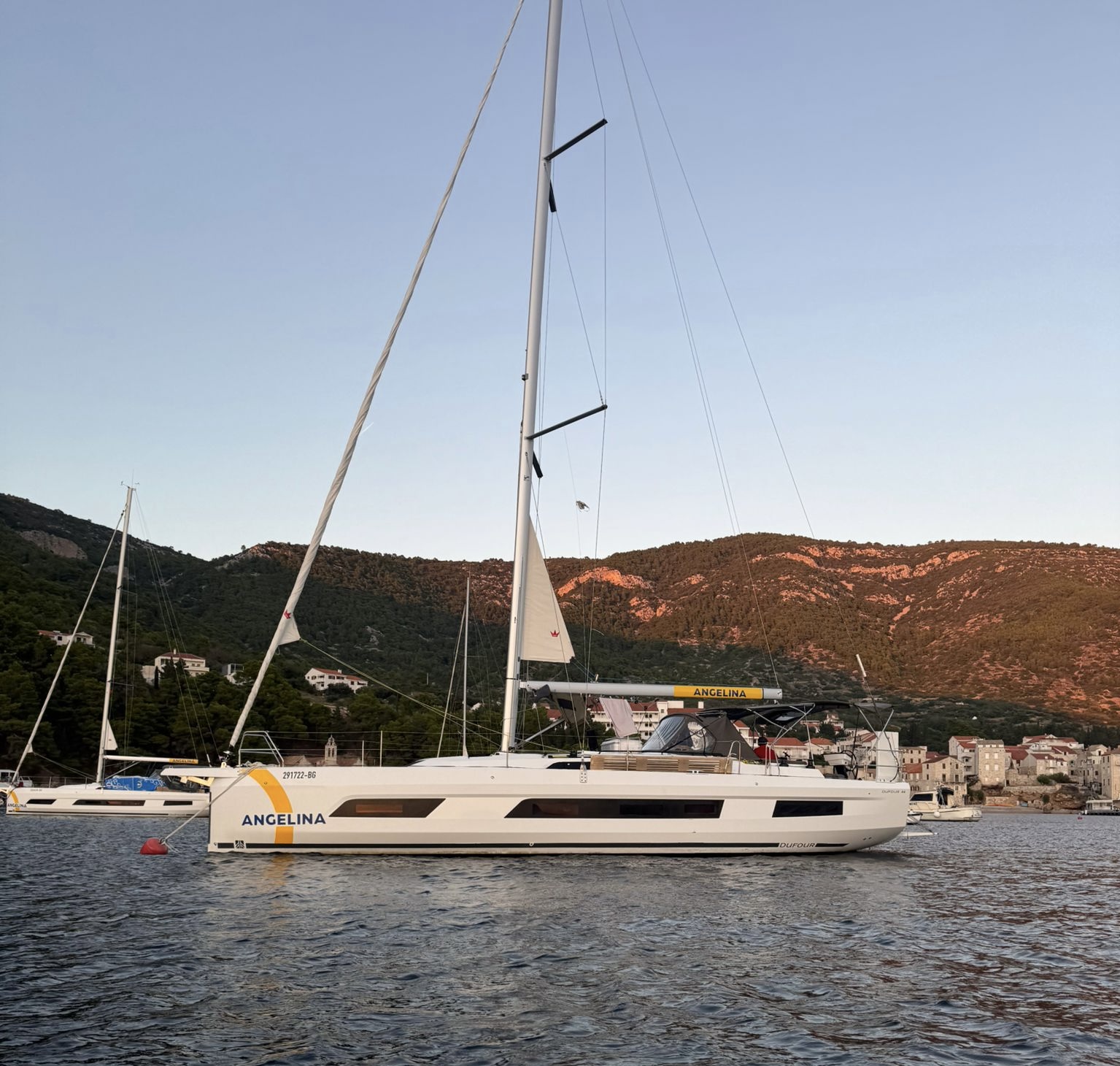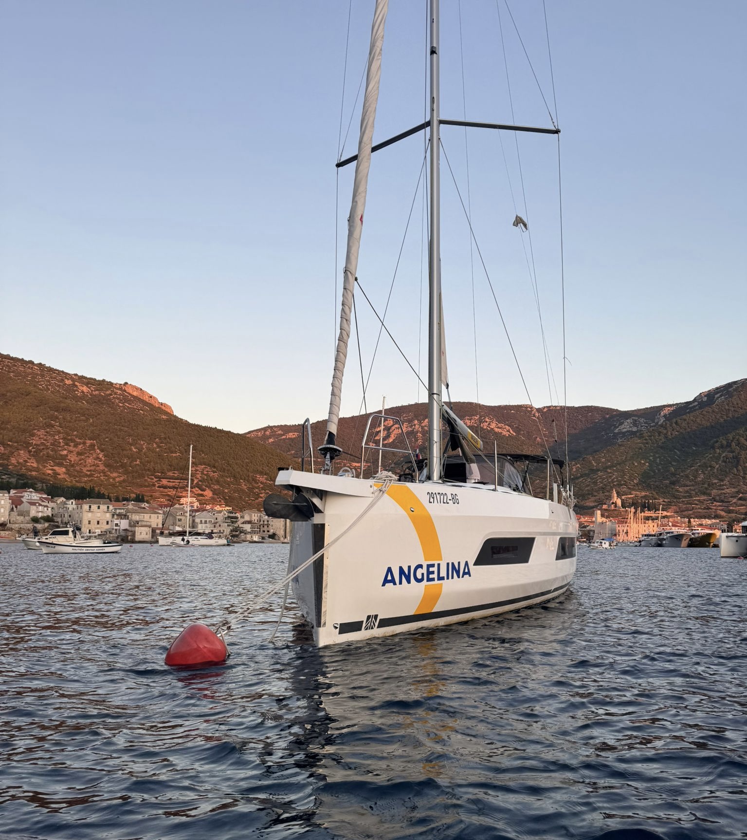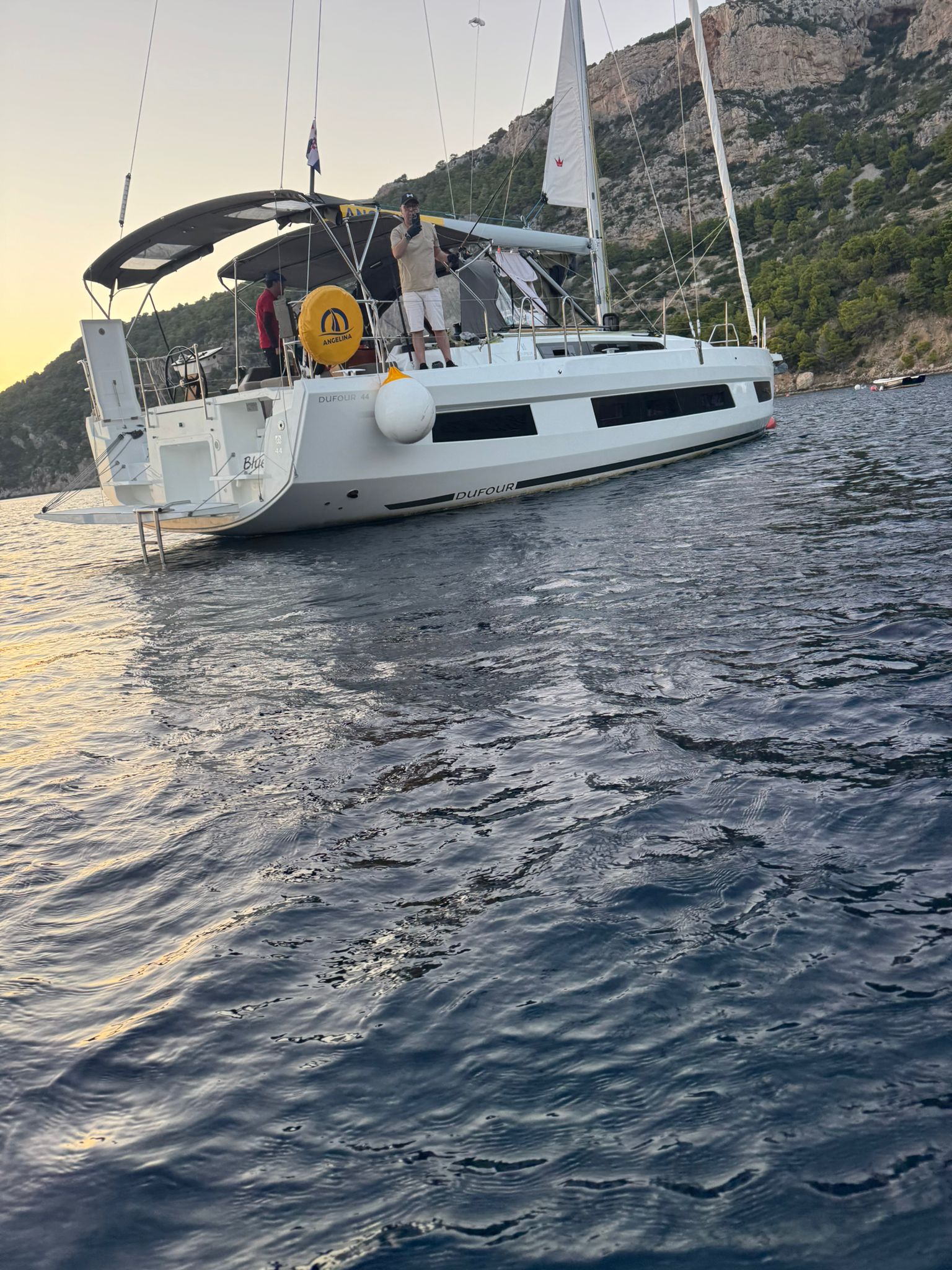 | Outside | 220V shore connection, Bathing platform, Bimini top, Boat hook, Cockpit shower, Cockpit speakers, Cockpit cushions, Cockpit table, Fender, Mooring lines, Gangway, BBQ, Solar panels, Sprayhood, Water hose, Windex, Winches |