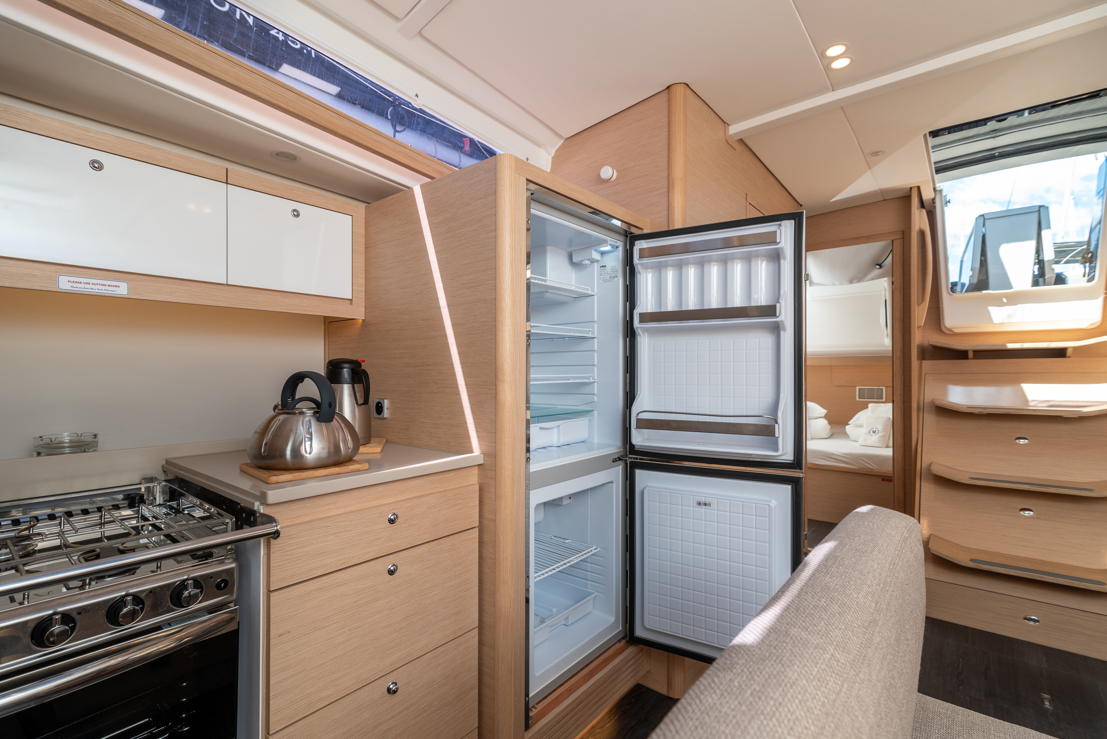 | Inside | 220V sockets, Oven, Black water tank, Gas oven, Generator, Heating, Inverter 12V/220V, Airconditioning (independent from shore power), Refrigerator, Battery charger, Speakers in saloon, LED interior lights, Mosquito nets, Pantry equipment, Radio, Convertible salon table, Warm water, WC (electr.) |