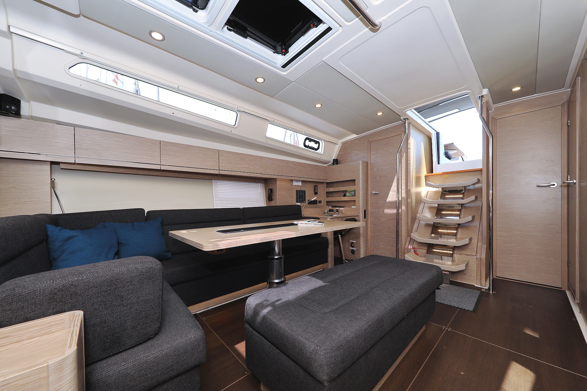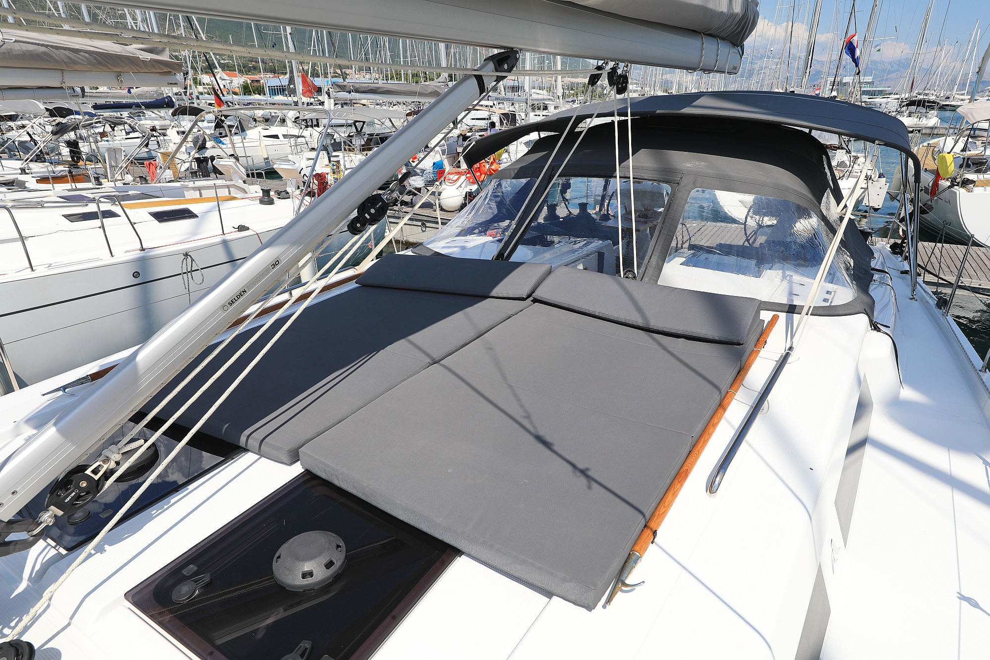 | Outside | Bathing platform (hydr.), Bimini top, Cockpit shower, Cockpit speakers, Cockpit cushions, Cockpit table, Deck cushions, Electr. anchor windlass, Folding propeller, Sprayhood, Teak in cockpit |