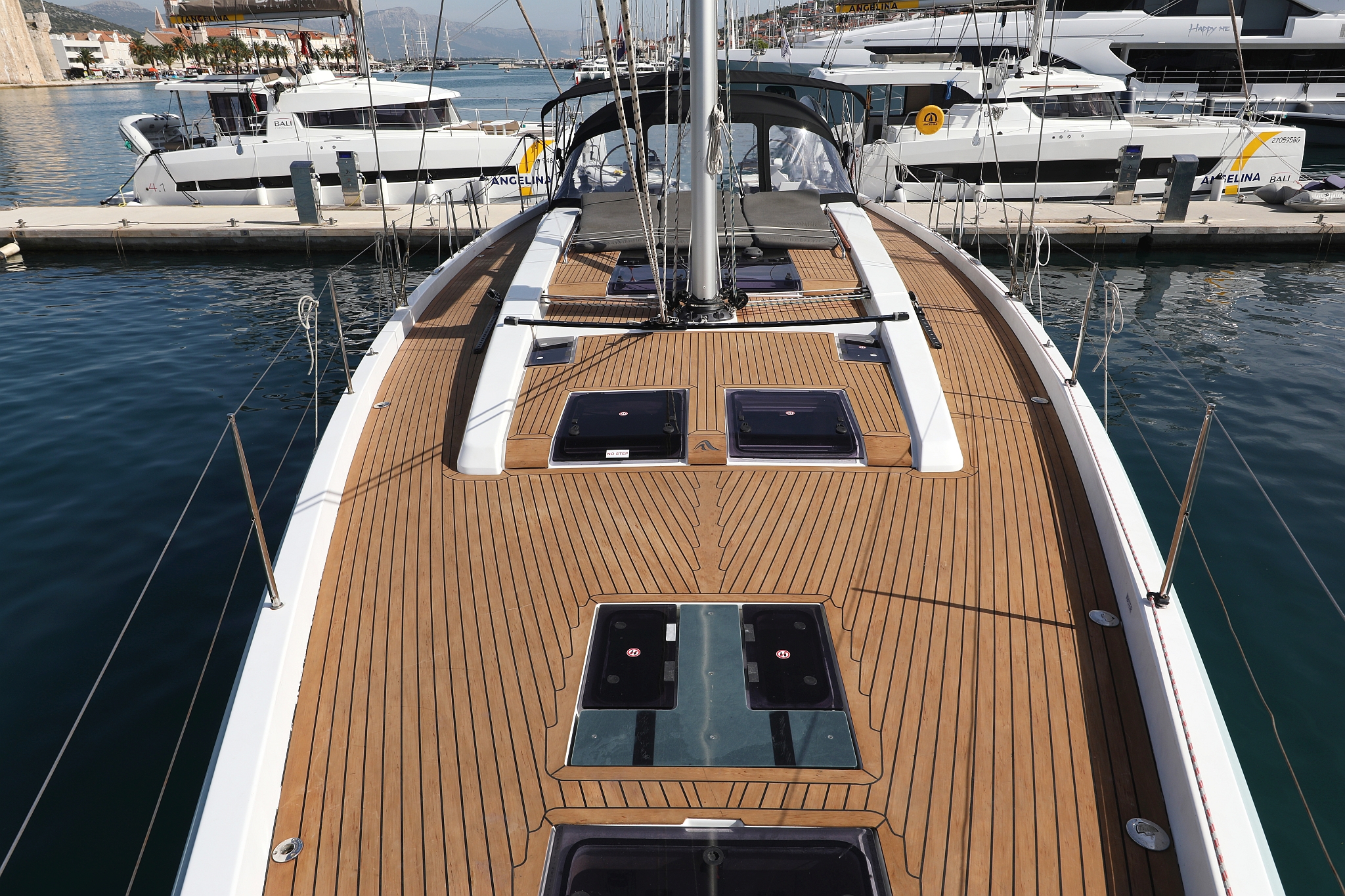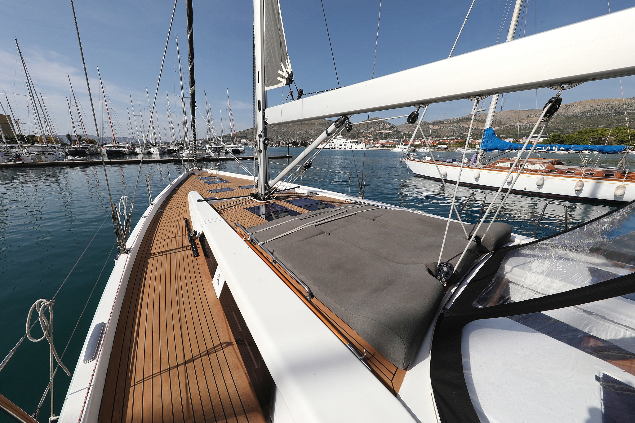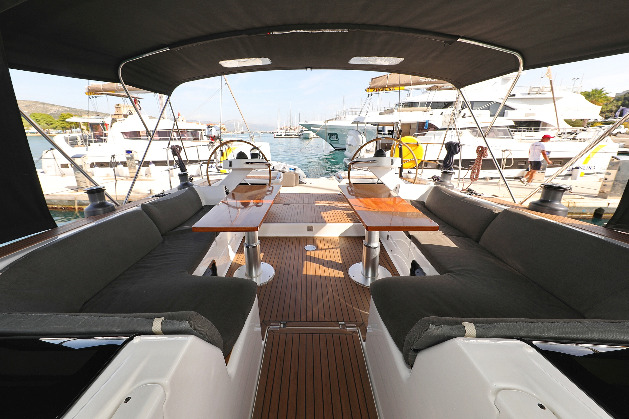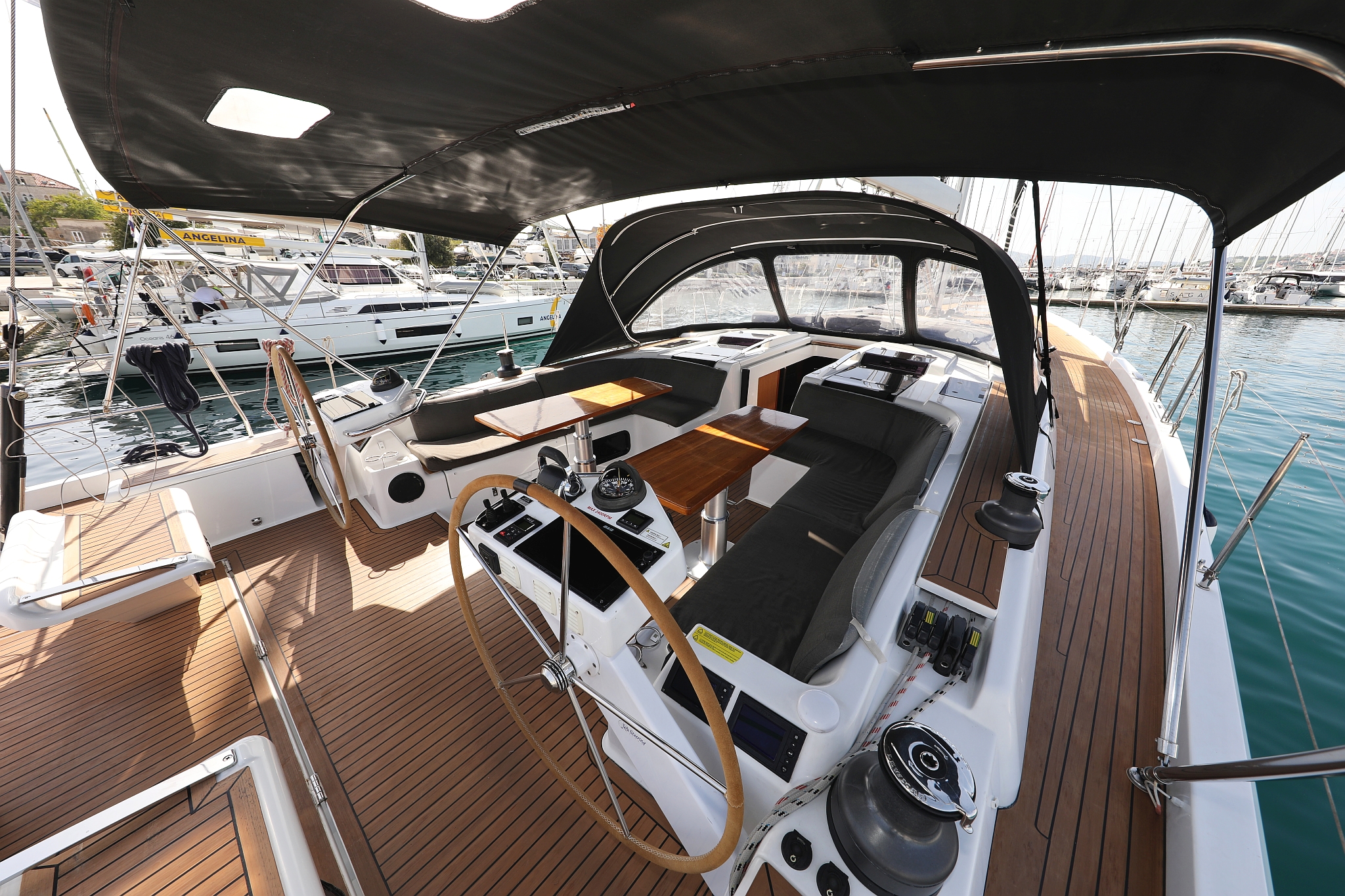 | Outside | 220V shore connection, Bathing platform, Bimini top, Cockpit shower, Cockpit speakers, Cockpit light, Cockpit cushions, Cockpit table, Electr. anchor windlass, Electr. genoa winch, Electr. main sail winch, Fender, Gangway, Ball fender, Sprayhood, Teak in cockpit, Teak deck, LED submarine lights, Winches |