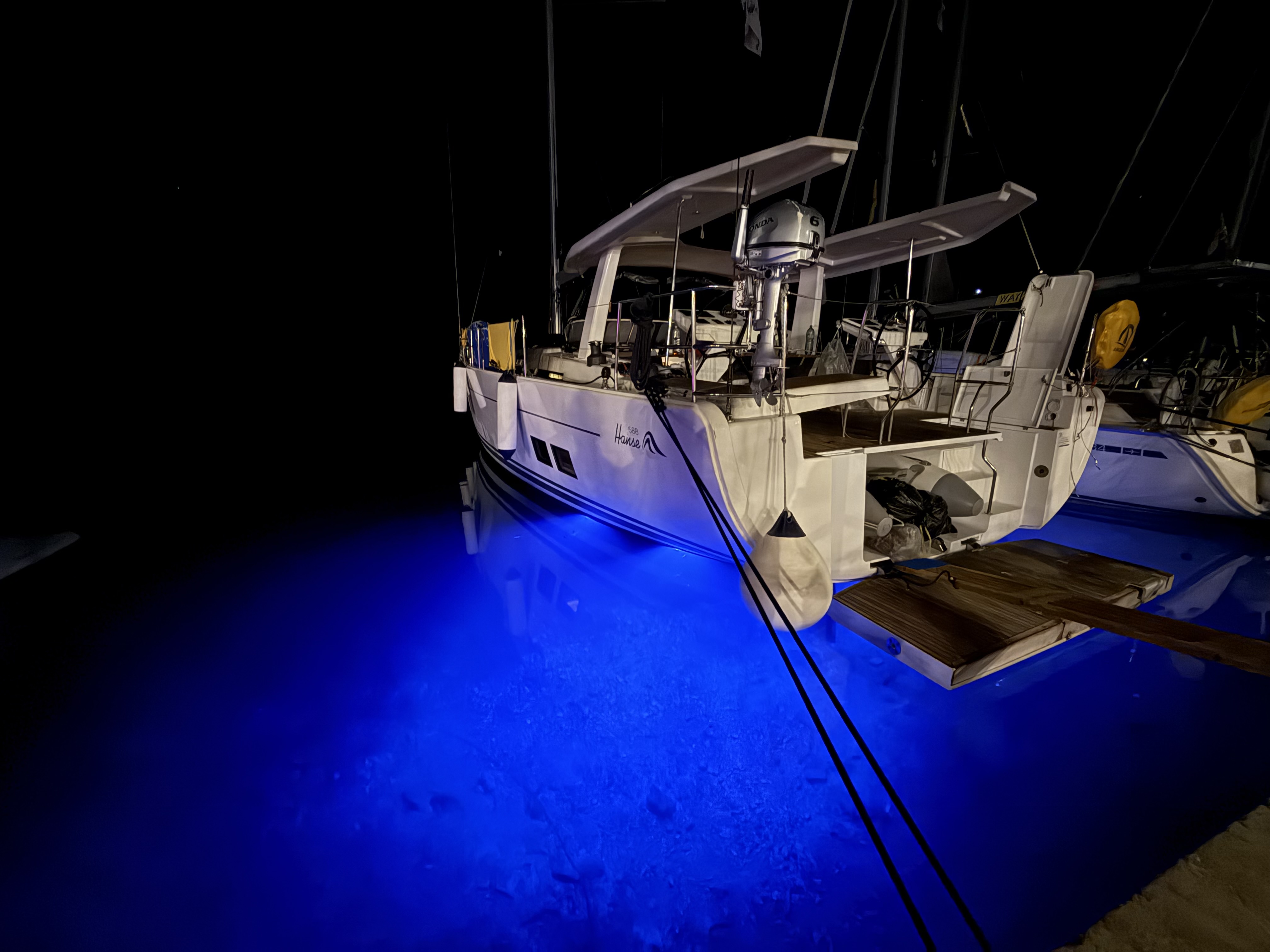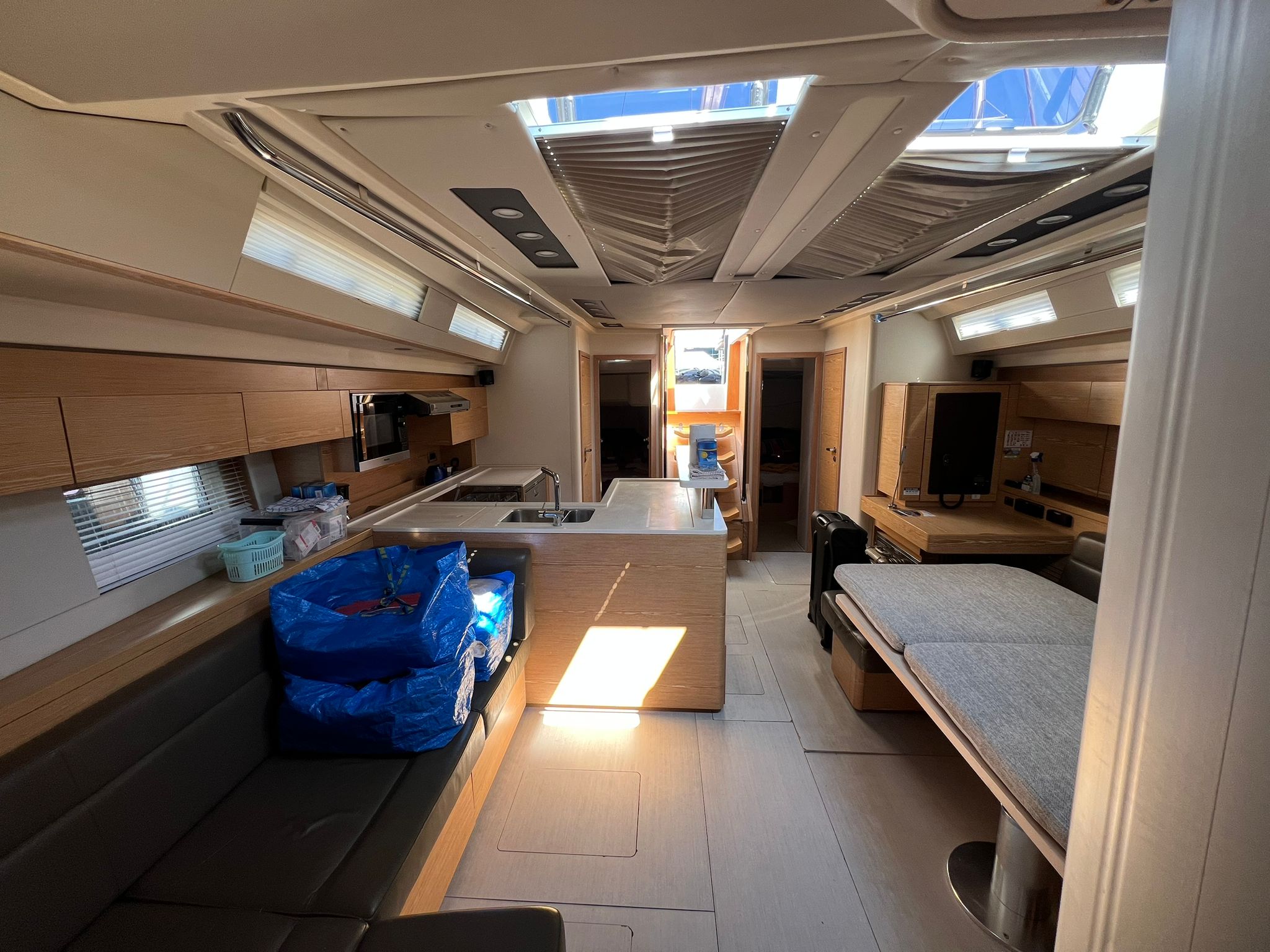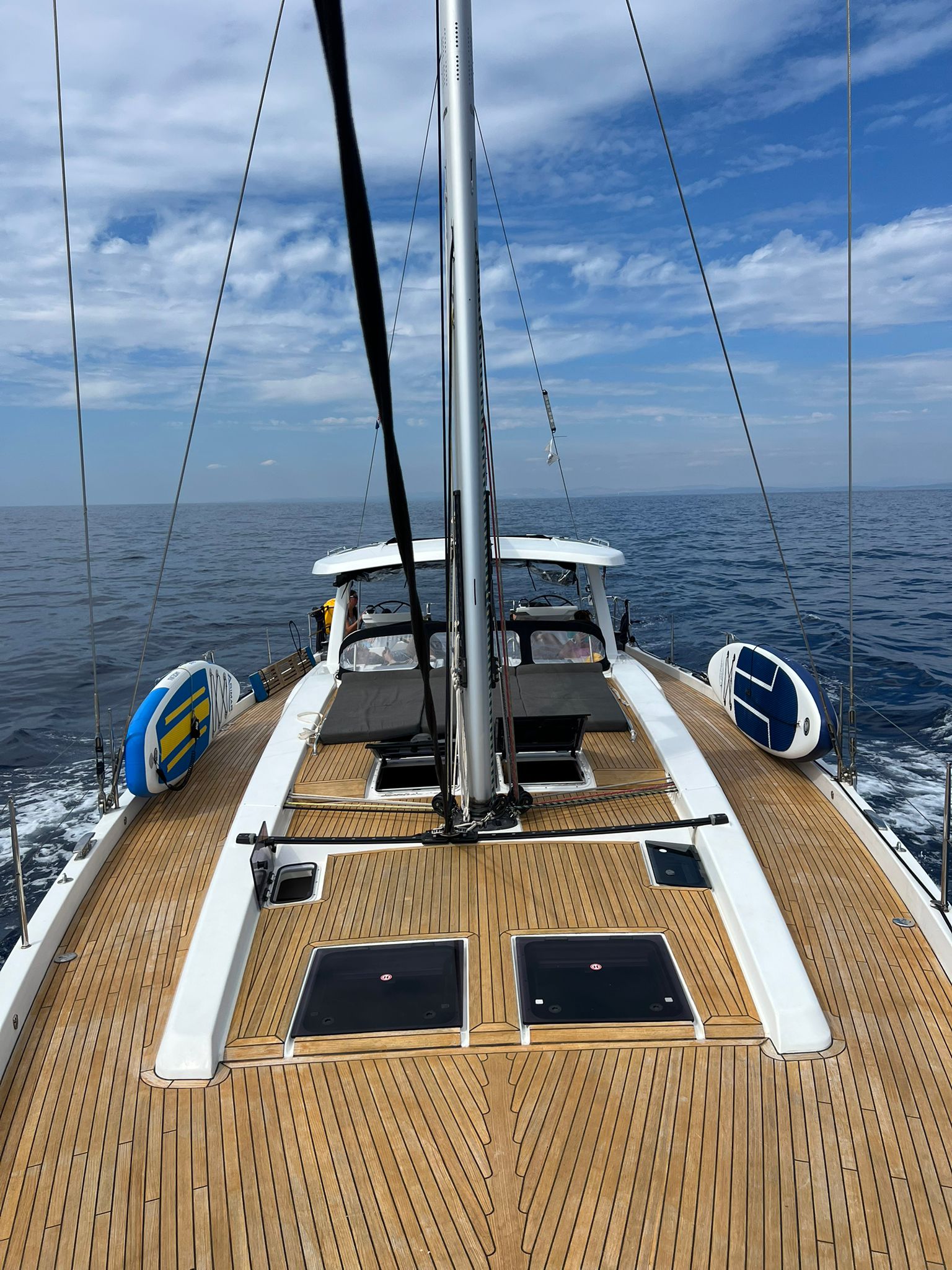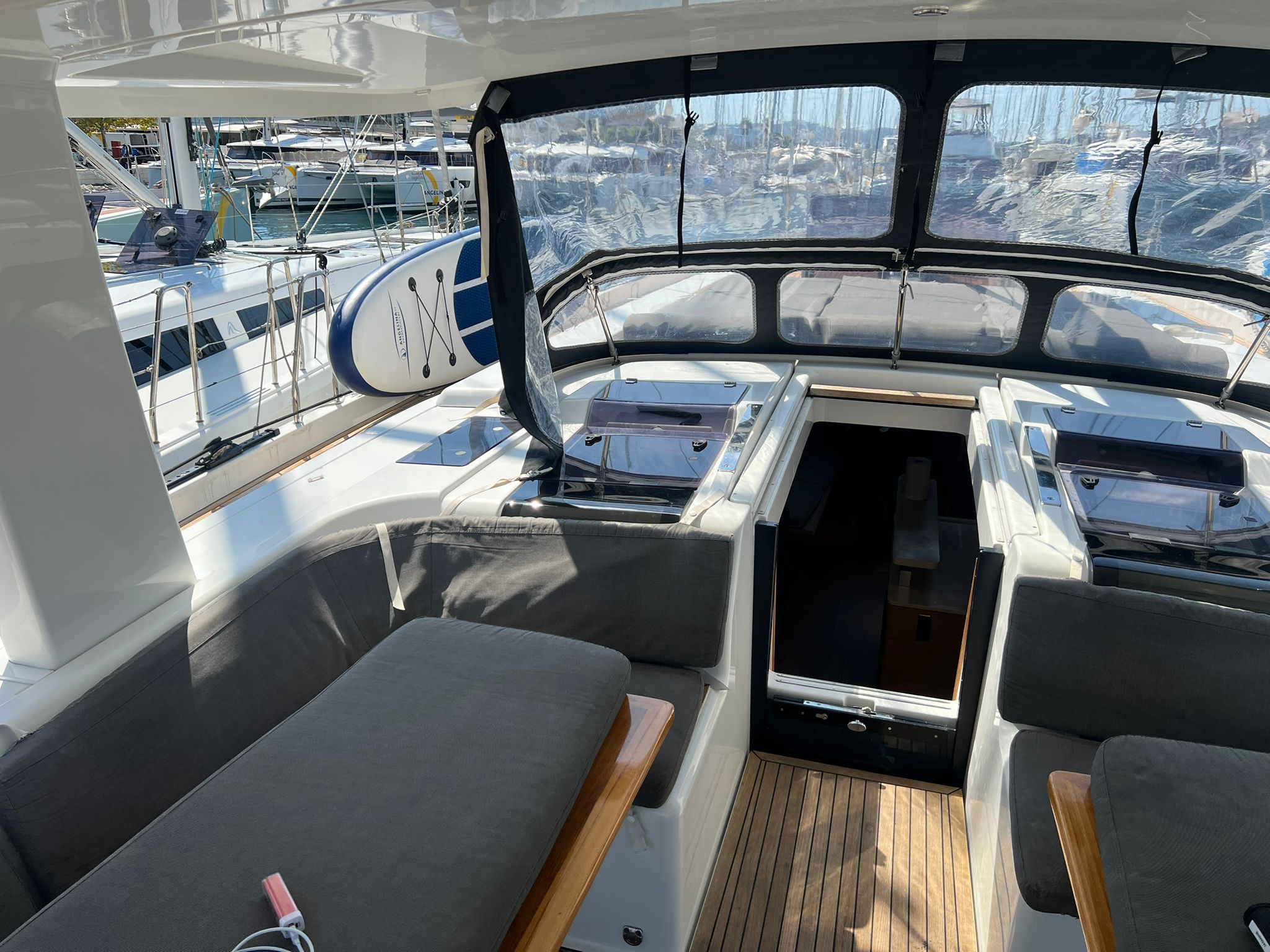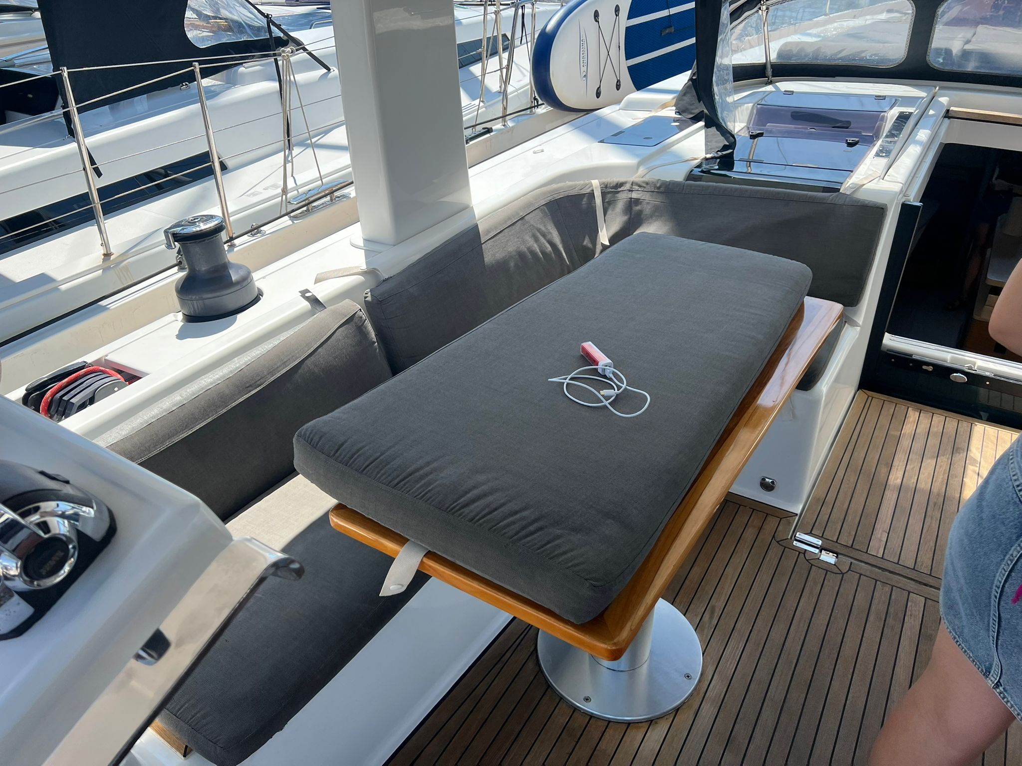 | Outside | 220V shore connection, Bathing platform, Boat hook, Cockpit shower hot/cold, Refrigerator in cockpit, Cockpit speakers, Cockpit cushions, Cockpit table, Lowerable cockpit table, Deck cushions, Electr. anchor windlass, electr. winch, Fender, Mooring lines, Gangway, Hardtop, Anchor Jambo, Solar panels, Sprayhood, Teak deck, LED submarine lights, Water hose, Winches |