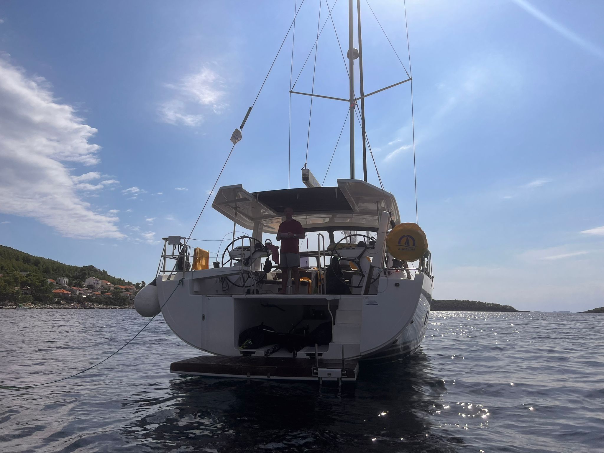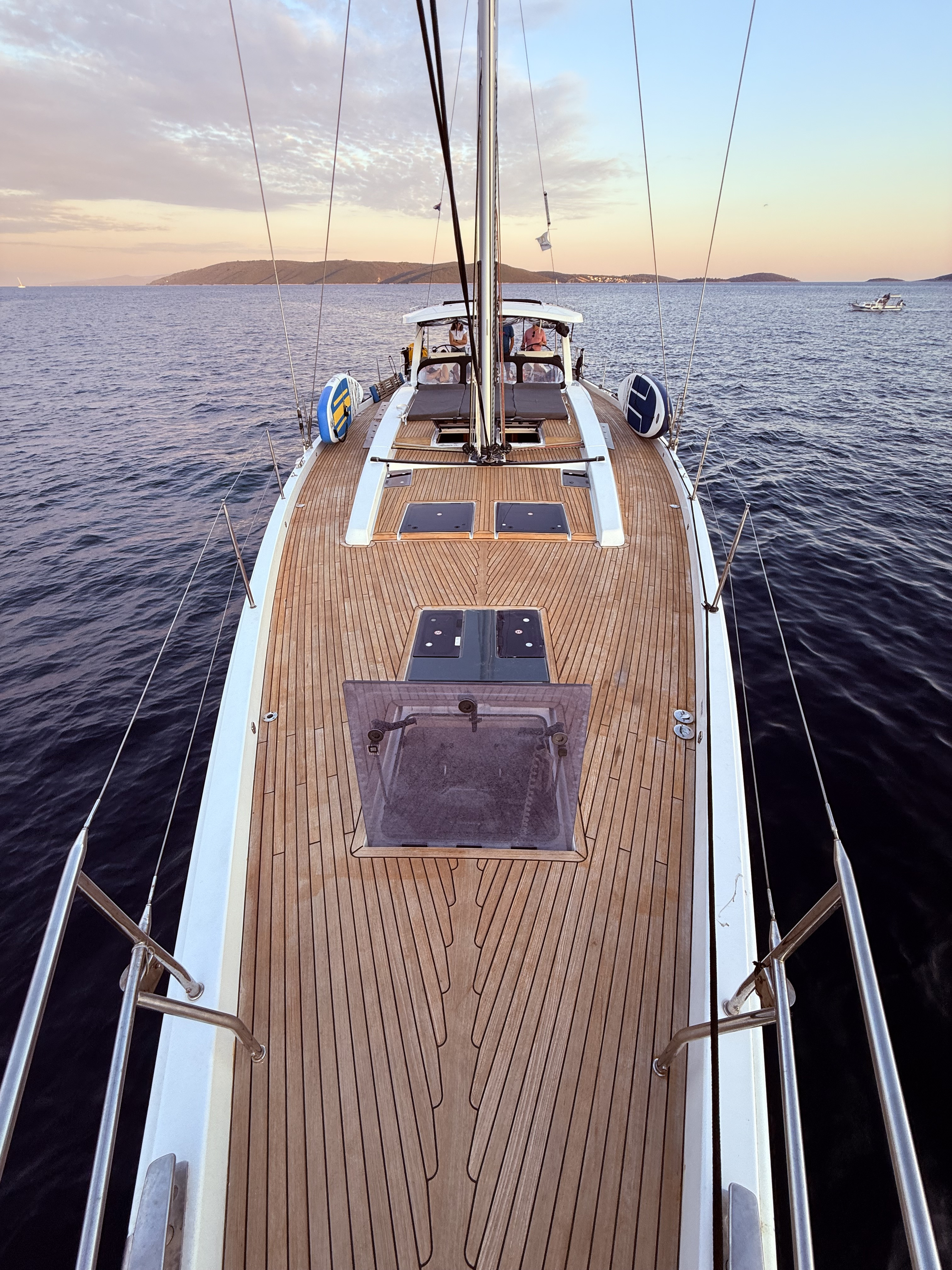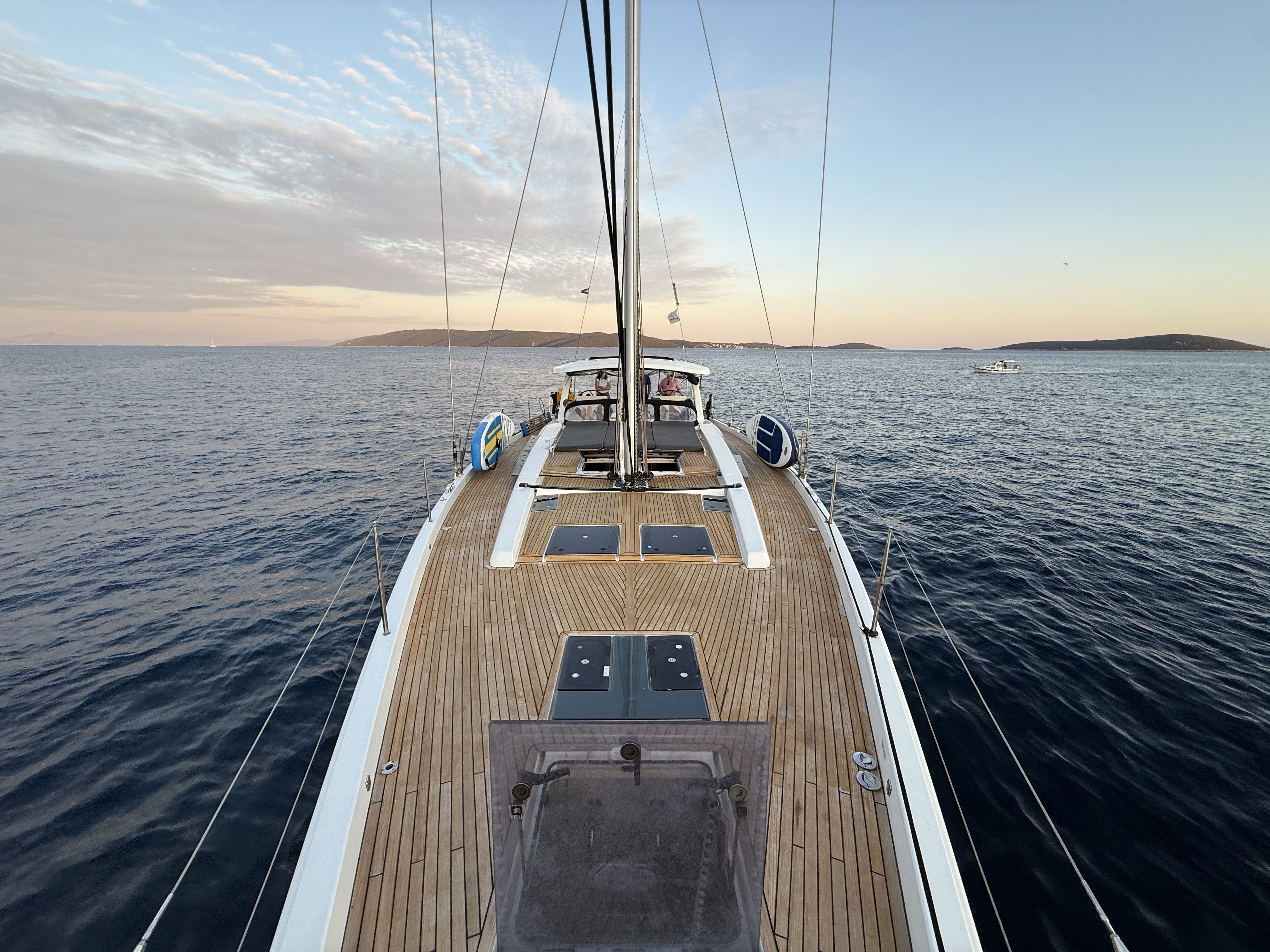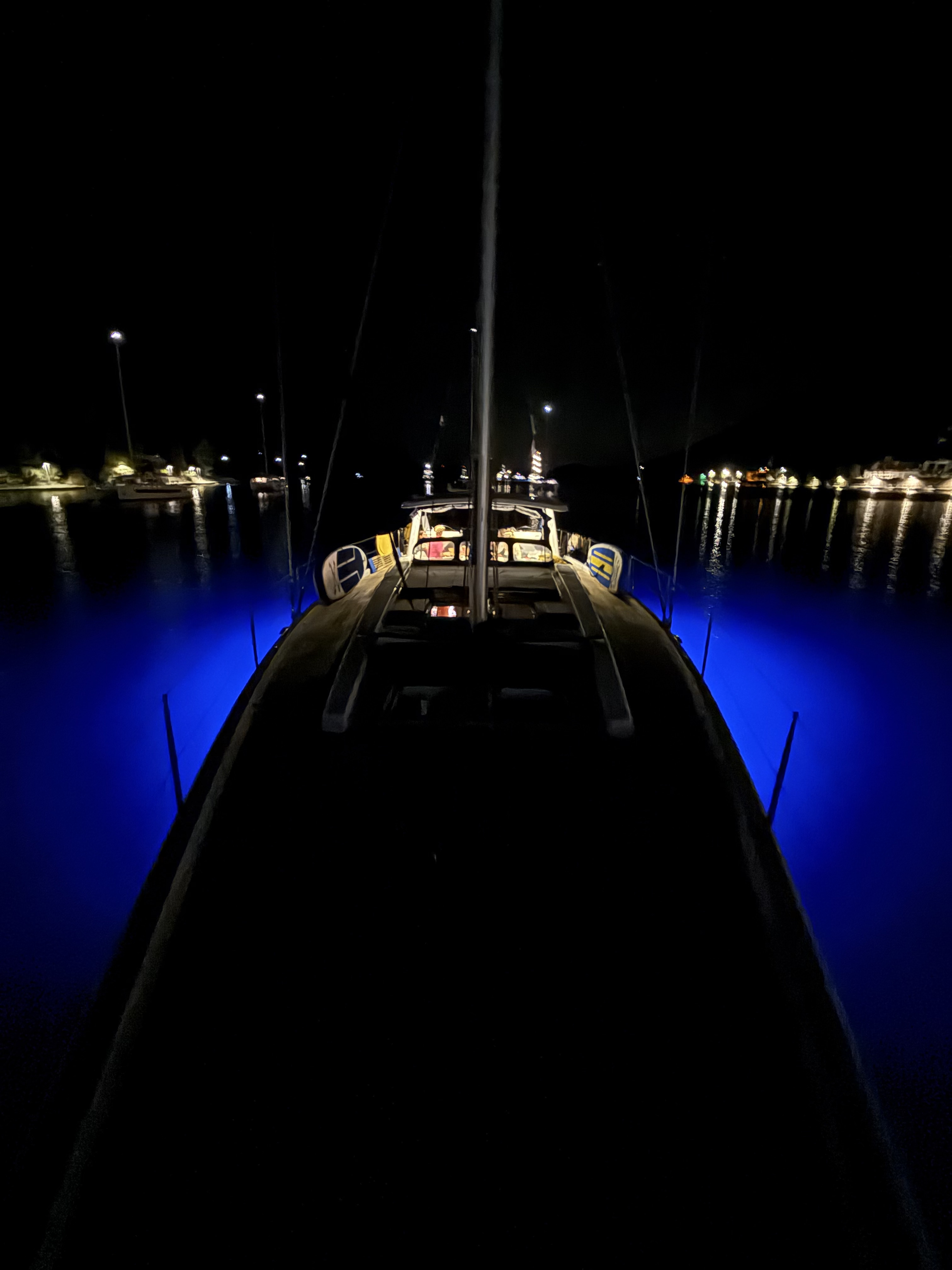 | Outside | 220V shore connection, Bathing platform, Boat hook, Cockpit shower hot/cold, Refrigerator in cockpit, Cockpit speakers, Cockpit cushions, Cockpit table, Lowerable cockpit table, Deck cushions, Electr. anchor windlass, electr. winch, Fender, Mooring lines, Gangway, Hardtop, Anchor Jambo, Solar panels, Sprayhood, Teak deck, LED submarine lights, Water hose, Winches |
