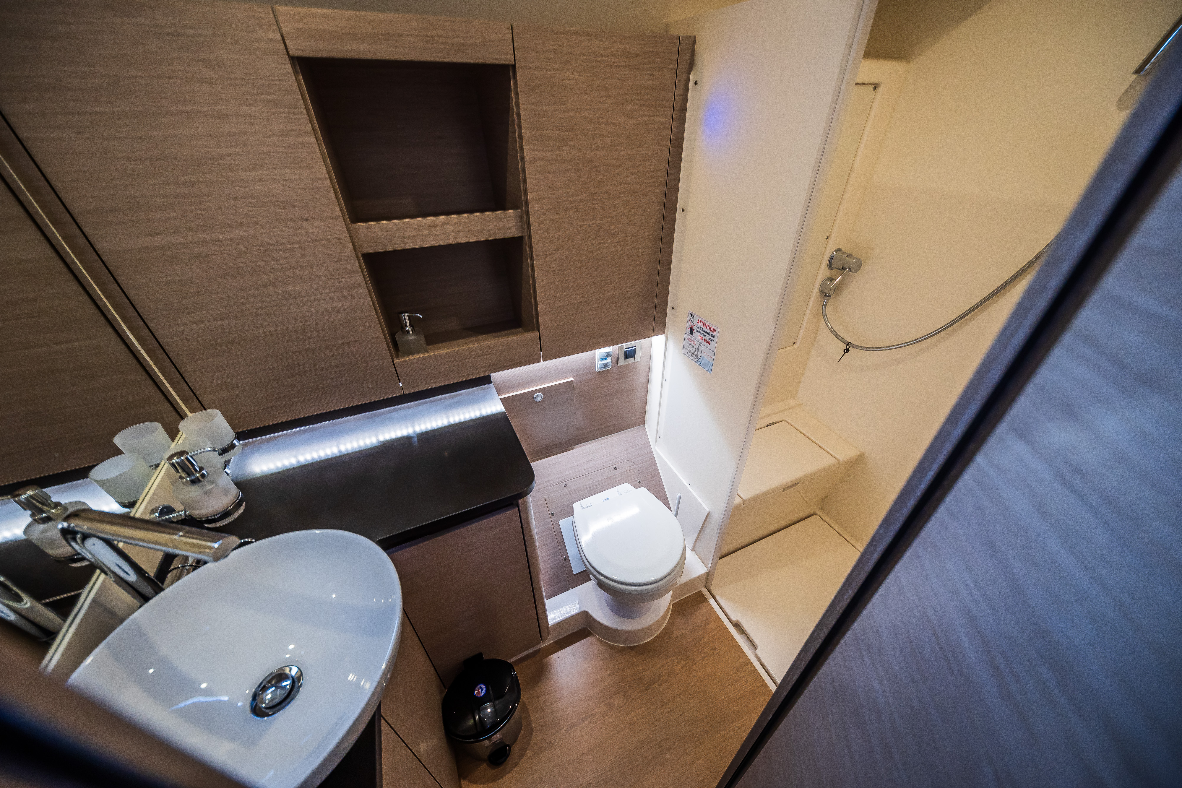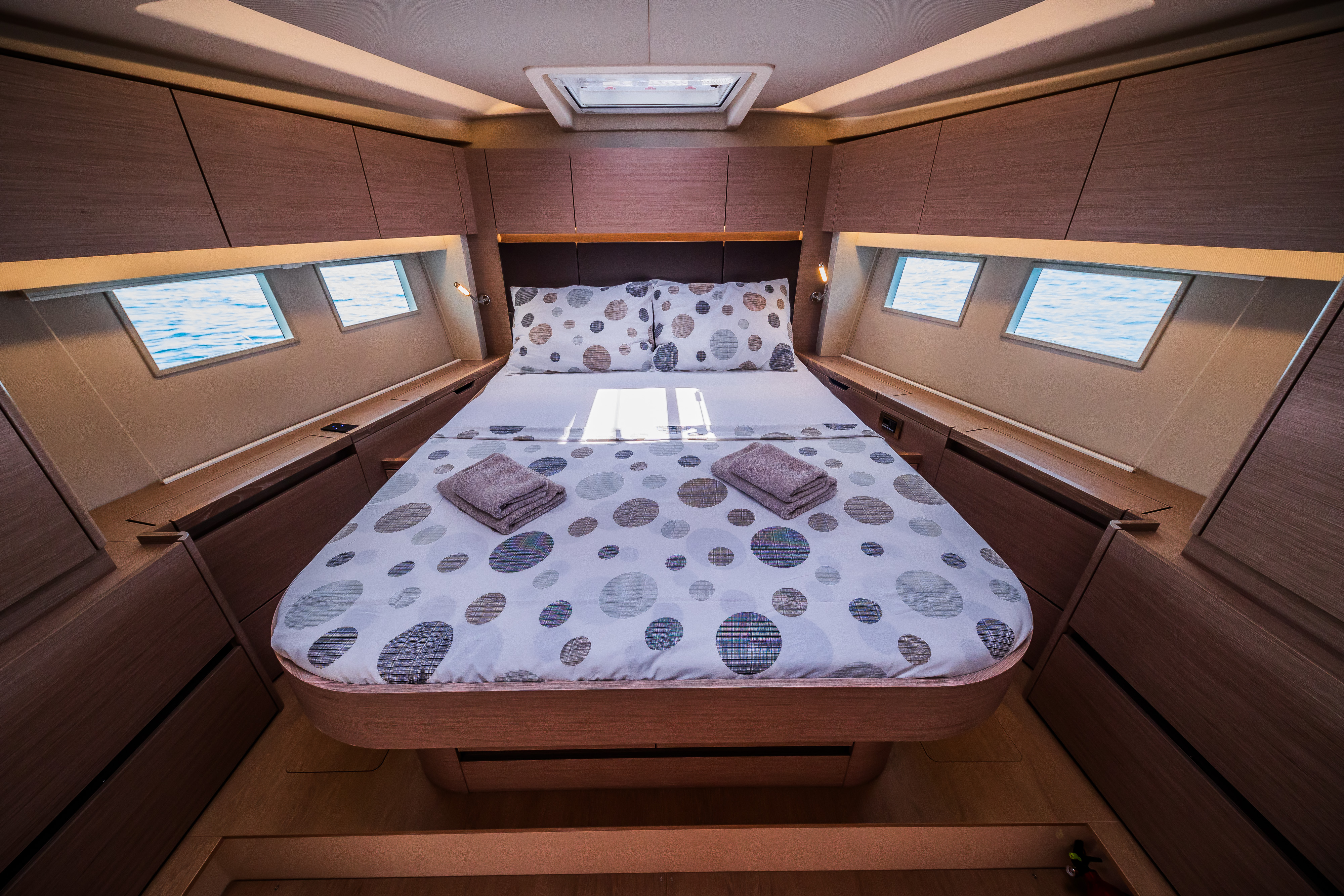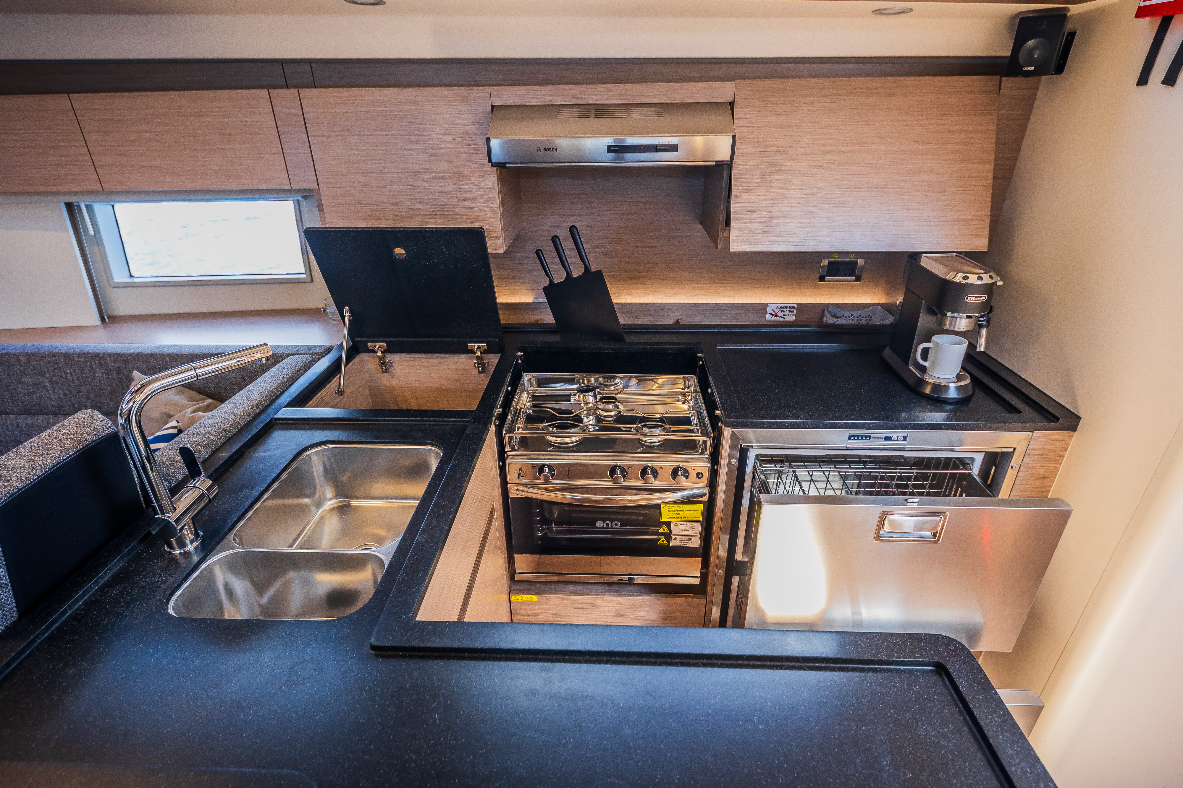 | Inside | Gas stove with oven, Freezer, Generator, Heating, Inverter 12V/220V, Airconditioning (independent from shore power), Refrigerator, Battery charger, Pantry equipment, Radio with CD player, TV, Warm water, Watermaker, WC (electr.) |