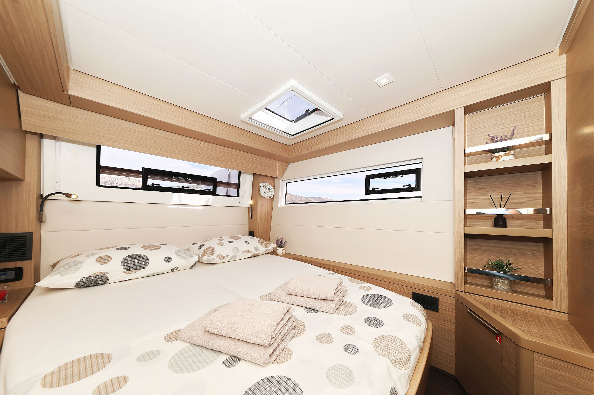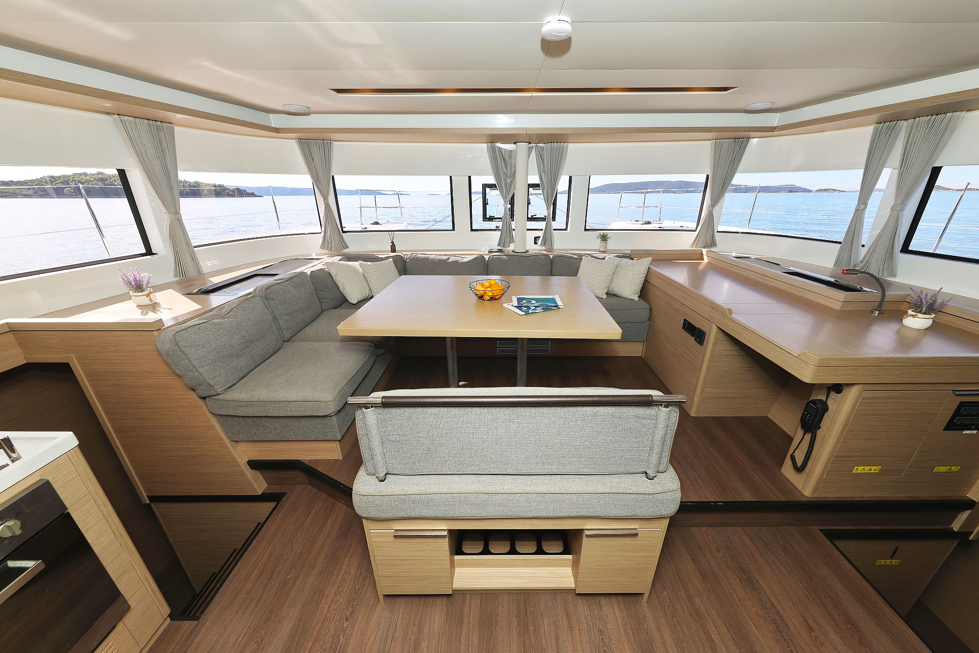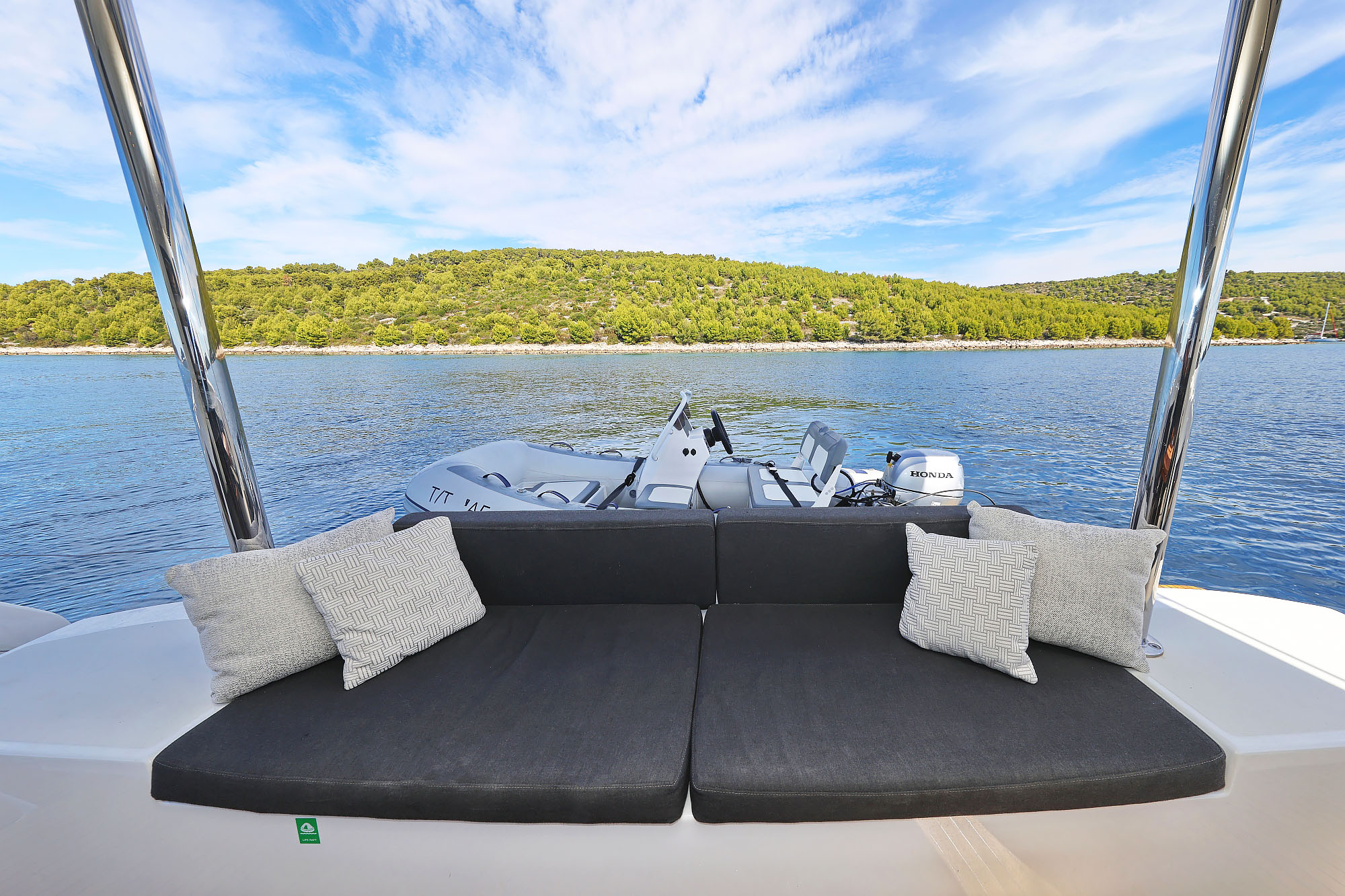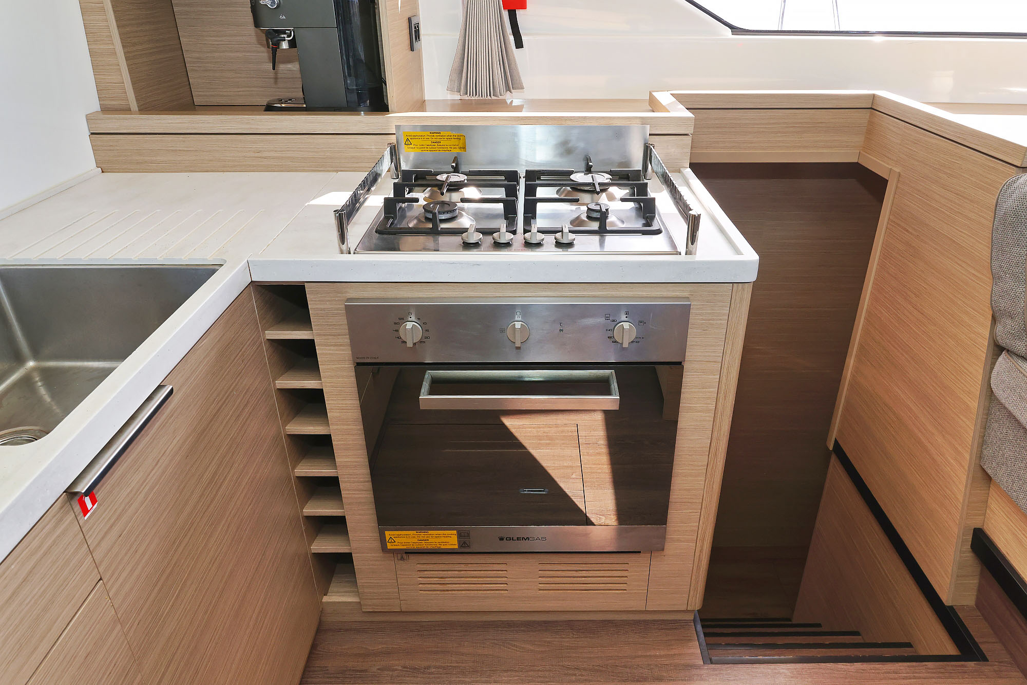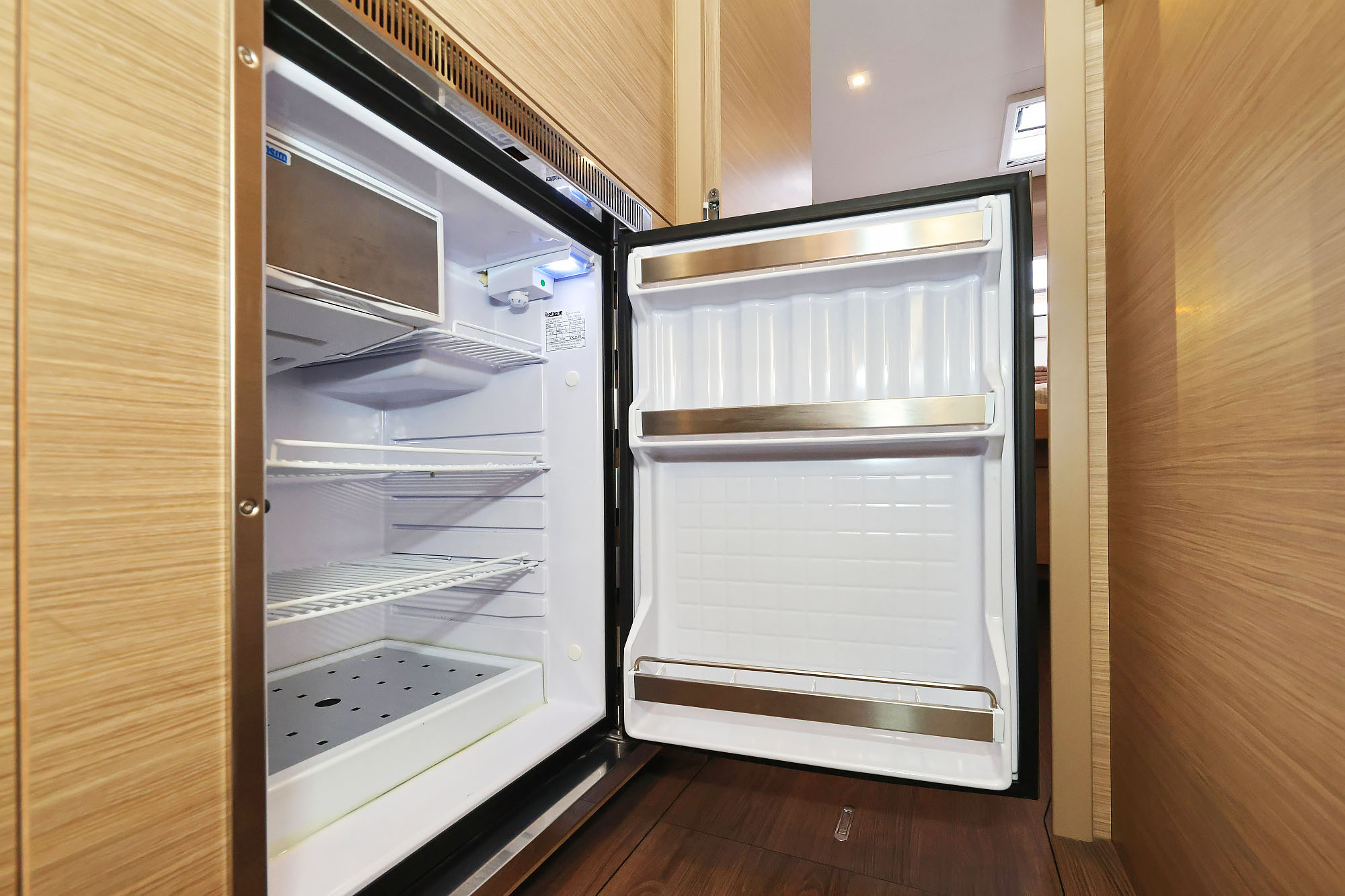 | Inside | 2nd refrigerator, Oven, Ice cube machine, Fusion sound system , Gas oven, Freezer, Generator, Dishwasher, Heating, Coffee machine, Airconditioning (independent from shore power), Refrigerator, Battery charger, Pantry equipment, Convertible salon table, TV, Cabin & dining area fan , Warm water, Watermaker, WC (electr.) |