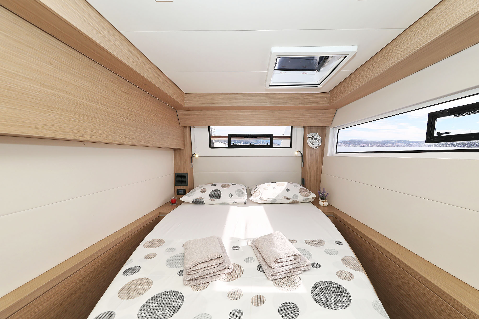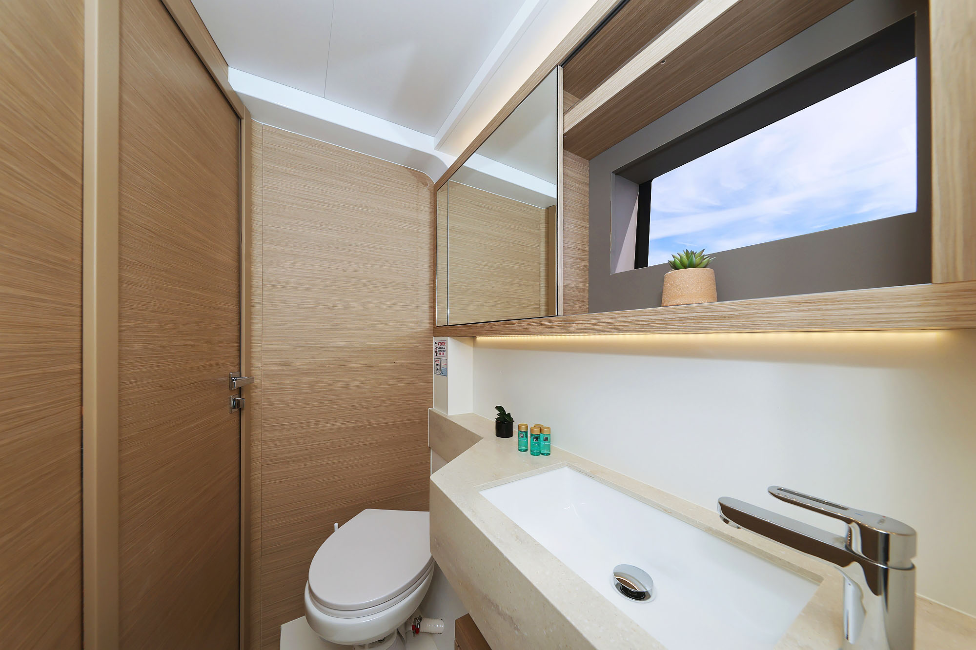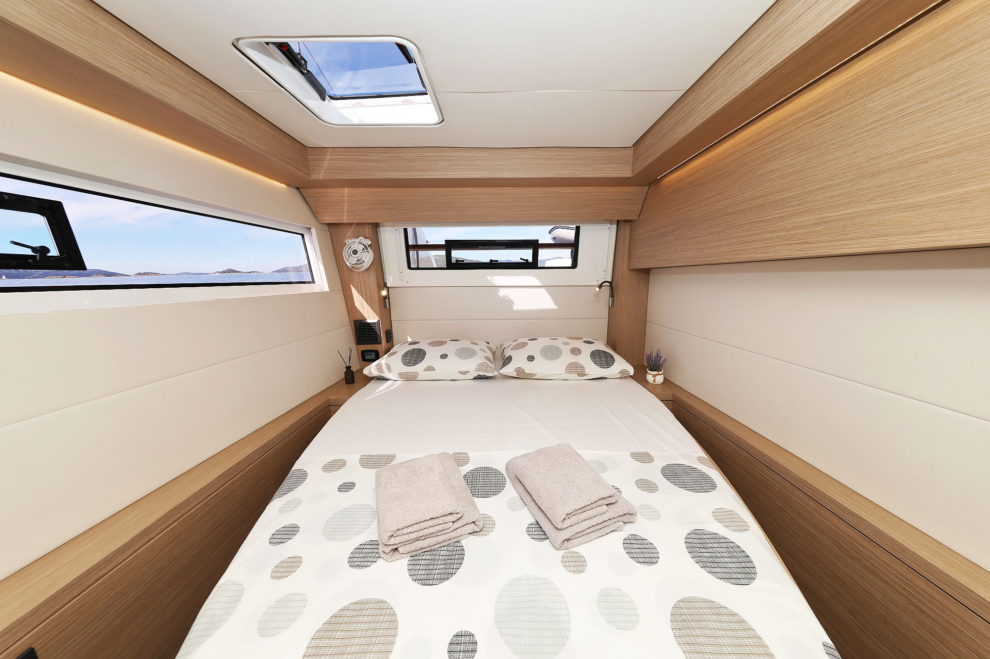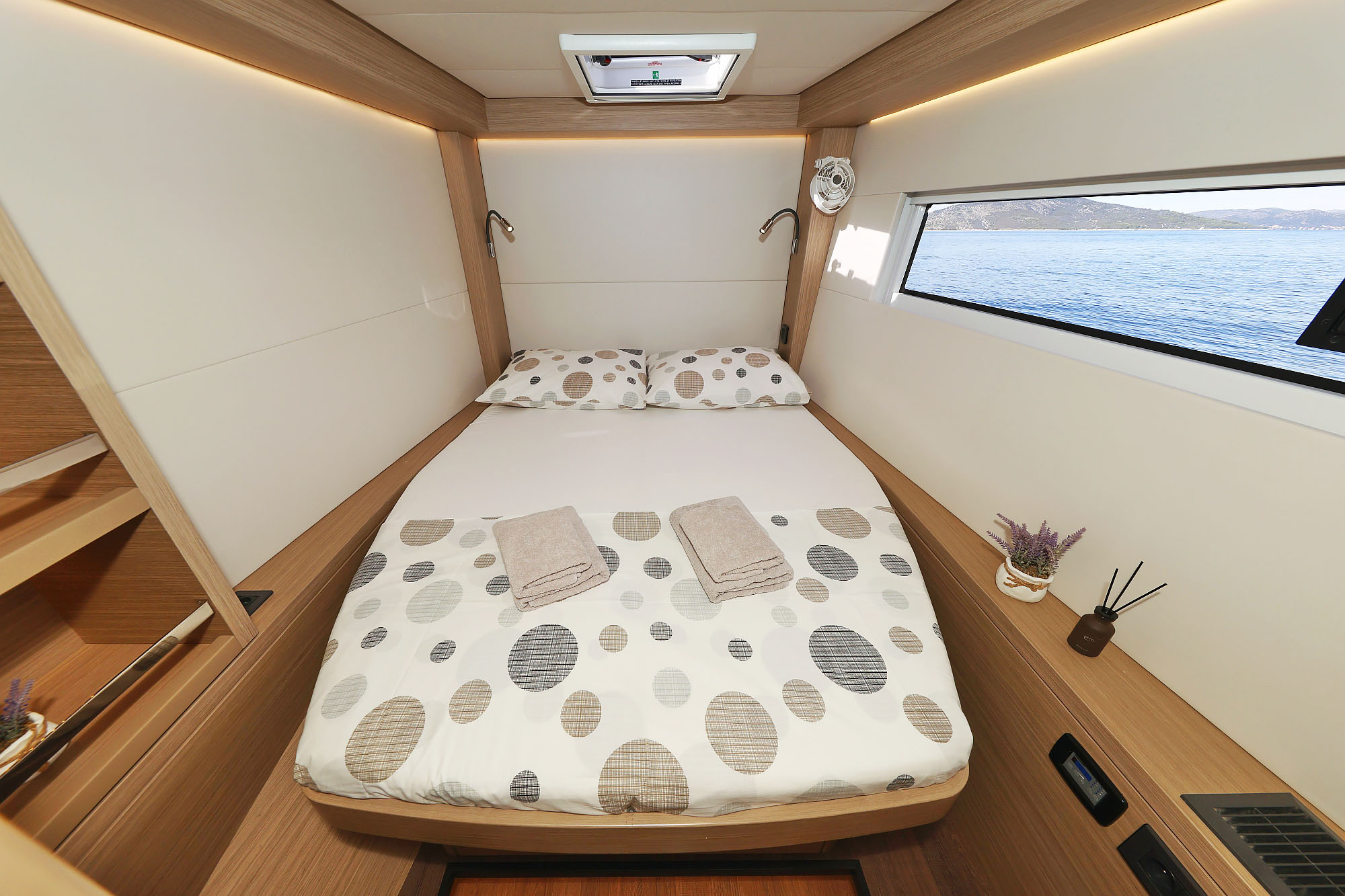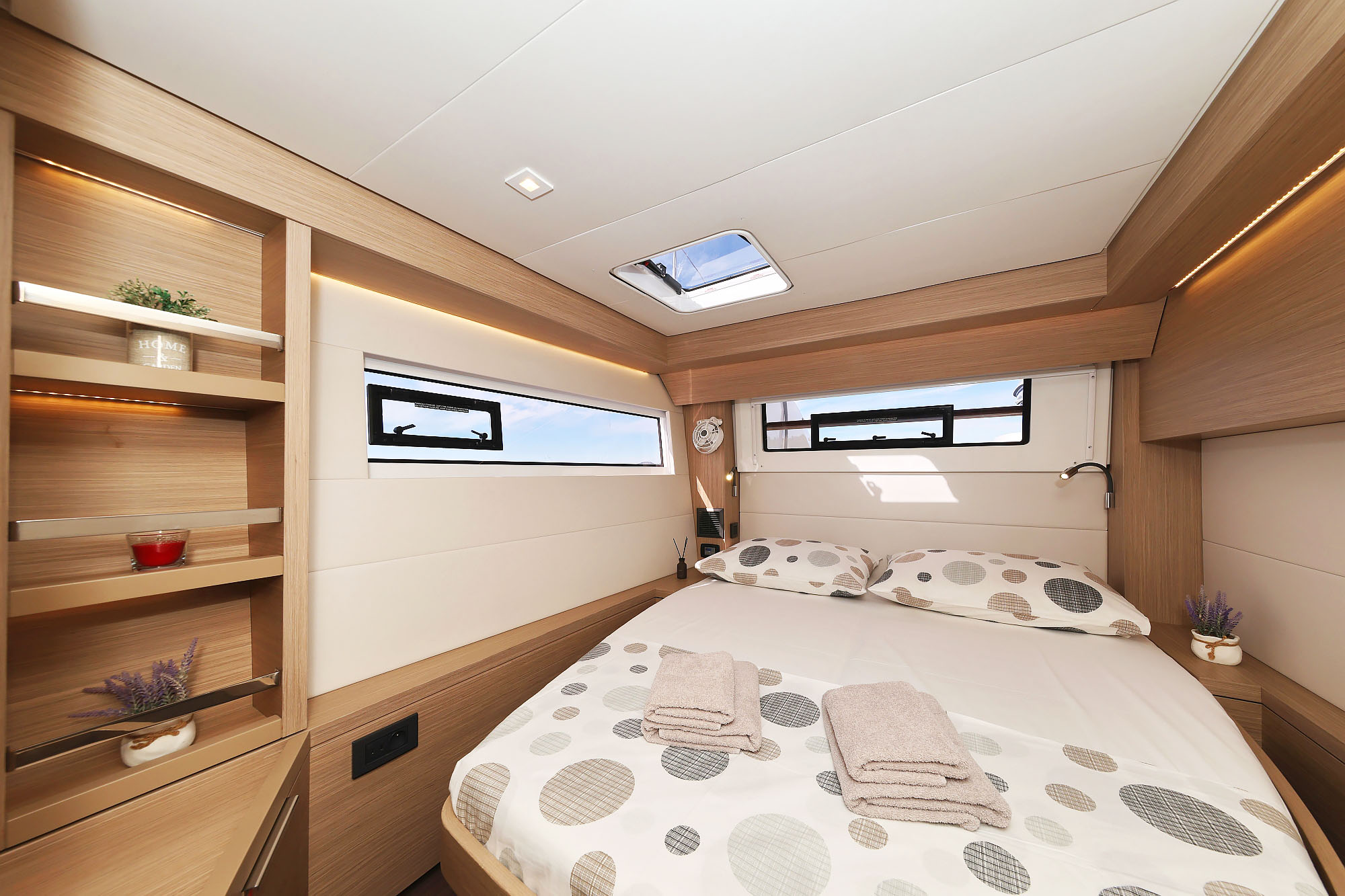 | Inside | 2nd refrigerator, Oven, Ice cube machine, Fusion sound system , Gas oven, Freezer, Generator, Dishwasher, Heating, Coffee machine, Airconditioning (independent from shore power), Refrigerator, Battery charger, Pantry equipment, Convertible salon table, TV, Cabin & dining area fan , Warm water, Watermaker, WC (electr.) |