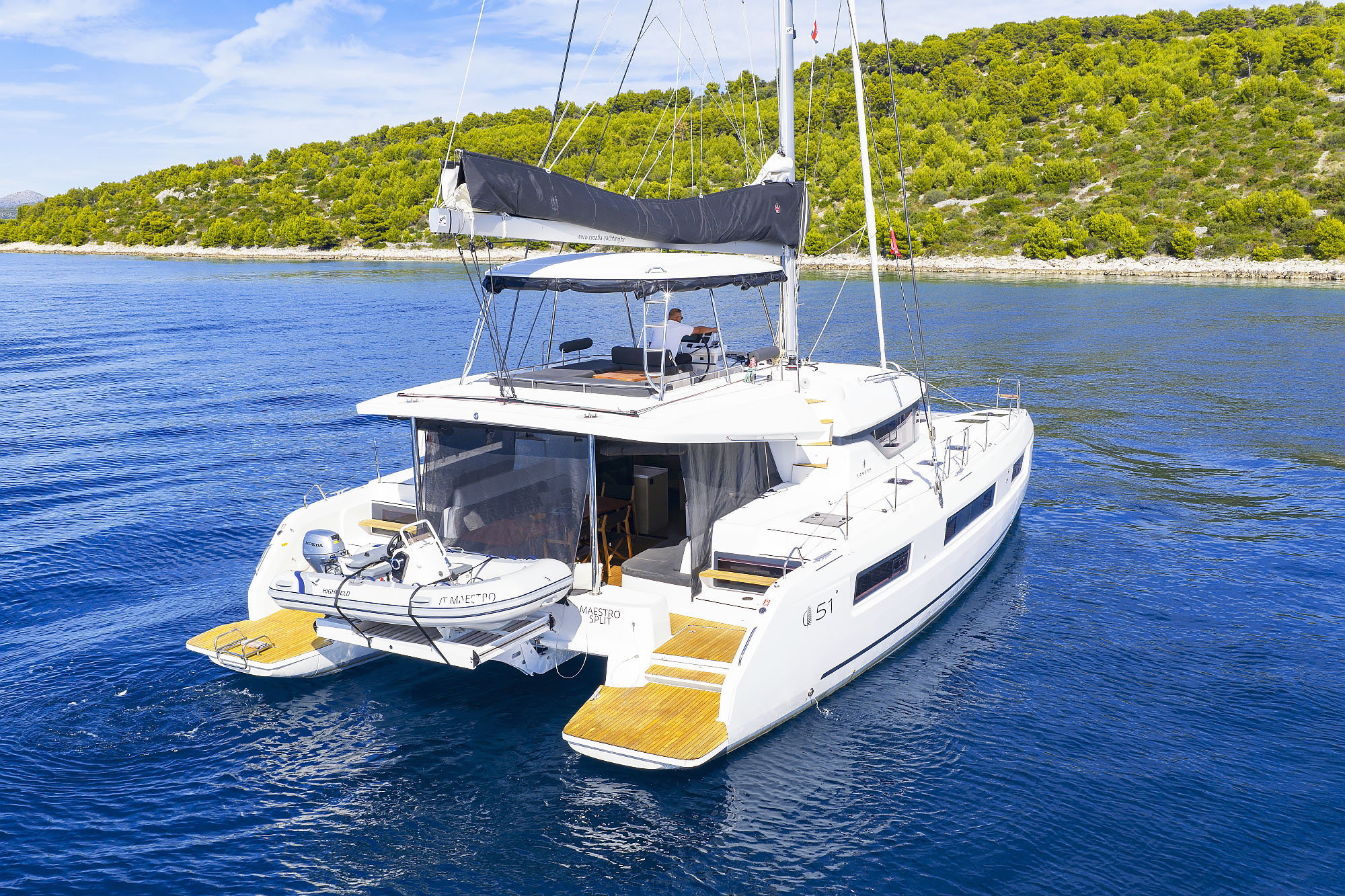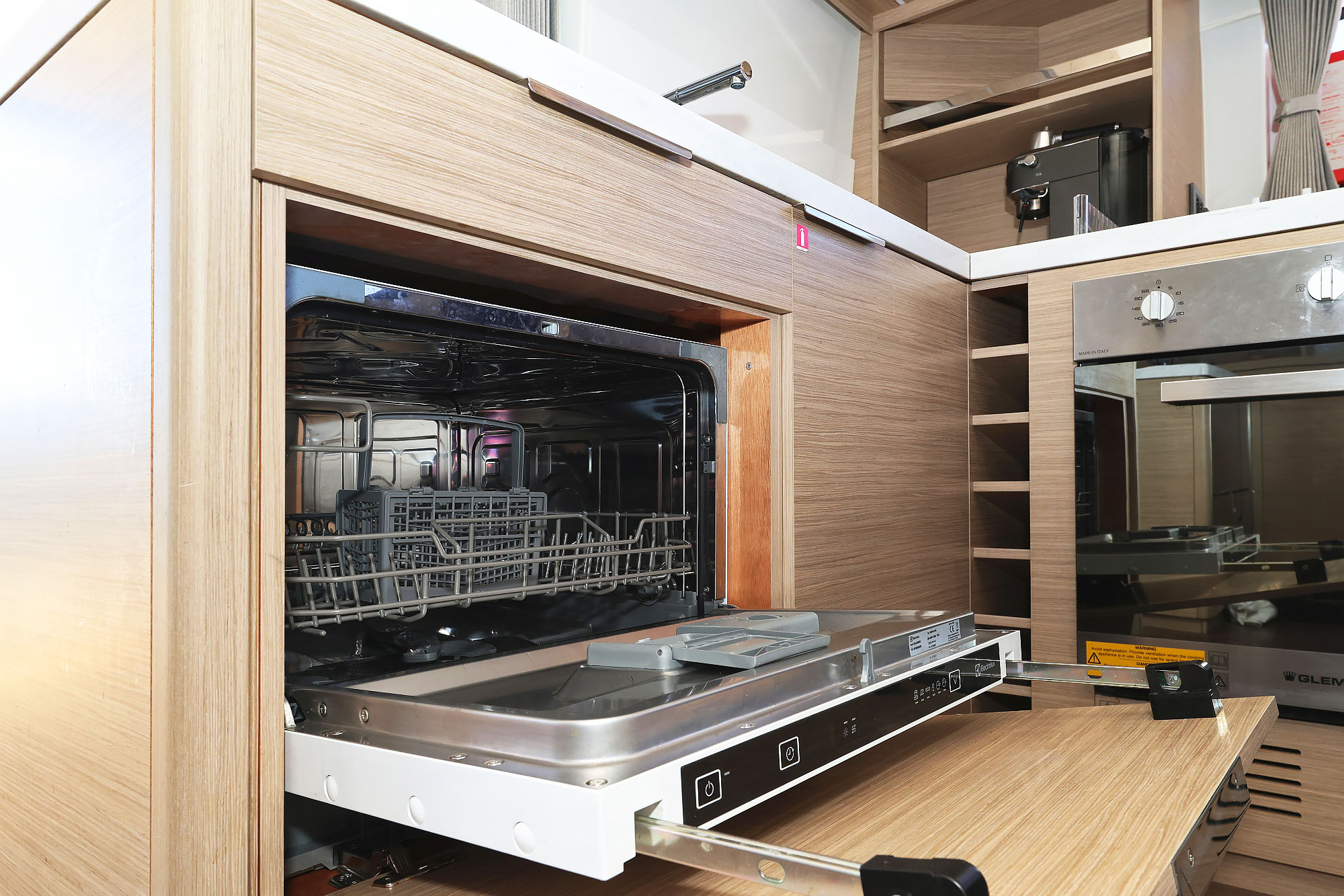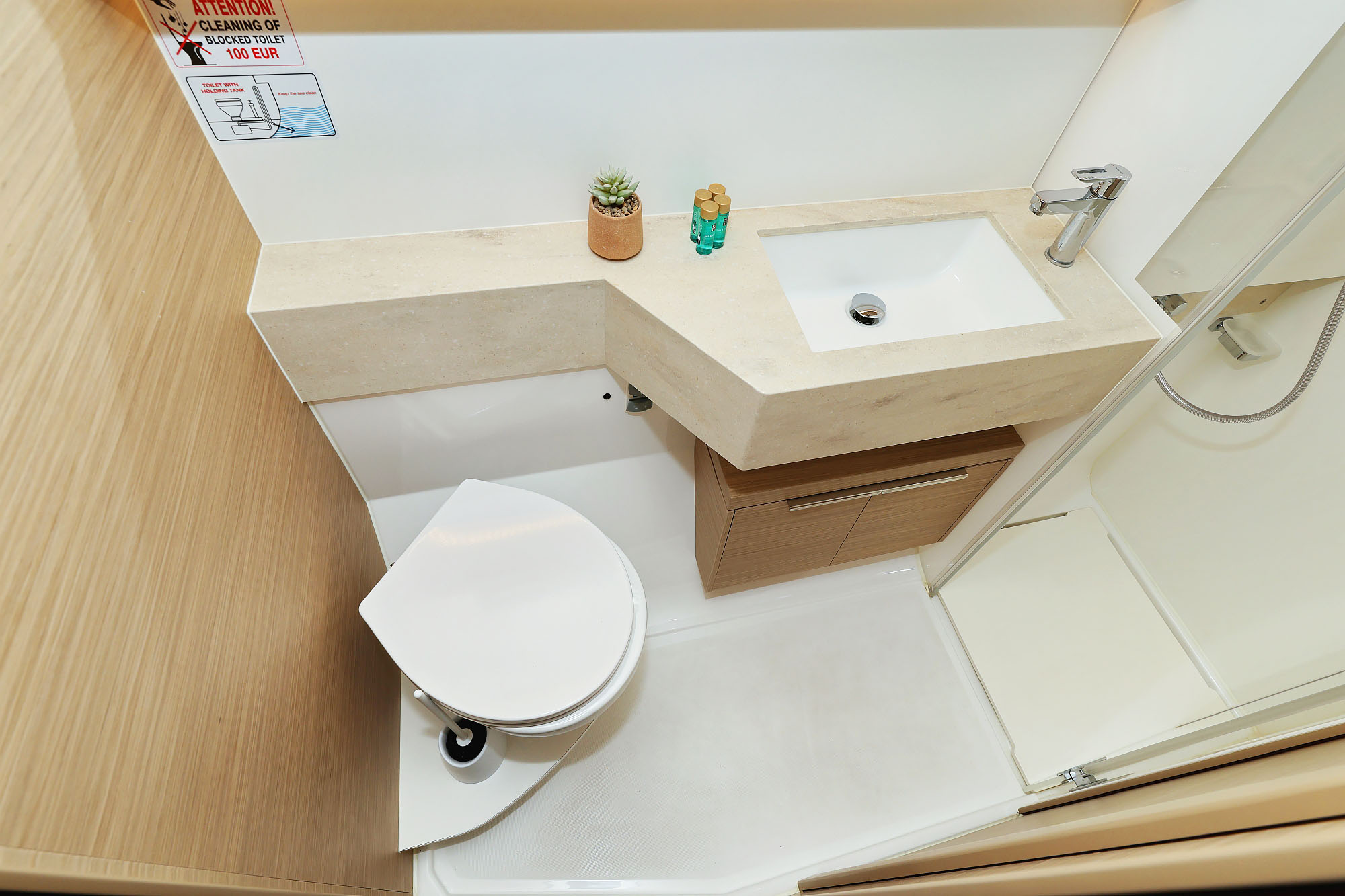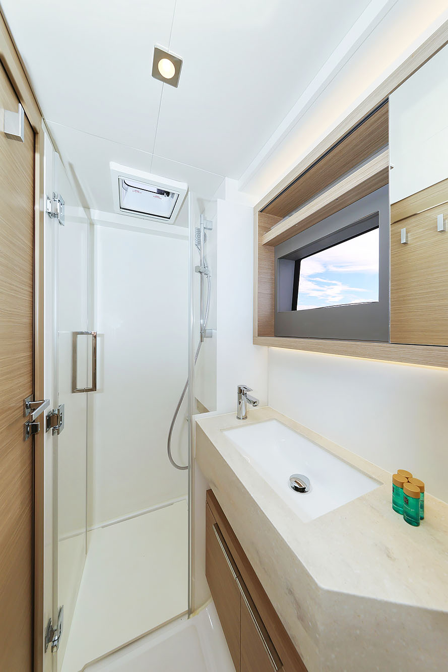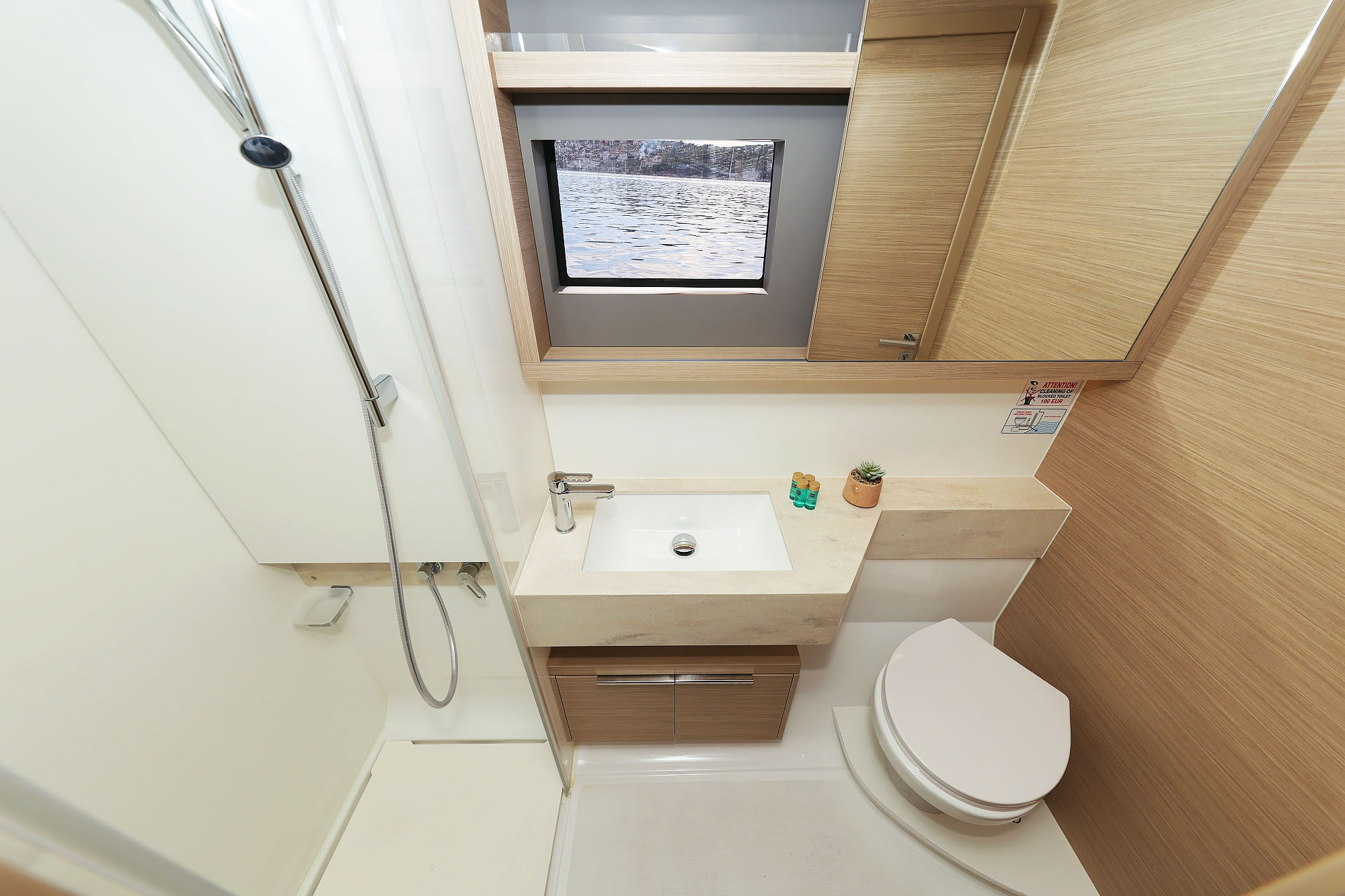 | Inside | 2nd refrigerator, Oven, Ice cube machine, Fusion sound system , Gas oven, Freezer, Generator, Dishwasher, Heating, Coffee machine, Airconditioning (independent from shore power), Refrigerator, Battery charger, Pantry equipment, Convertible salon table, TV, Cabin & dining area fan , Warm water, Watermaker, WC (electr.) |