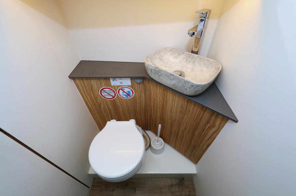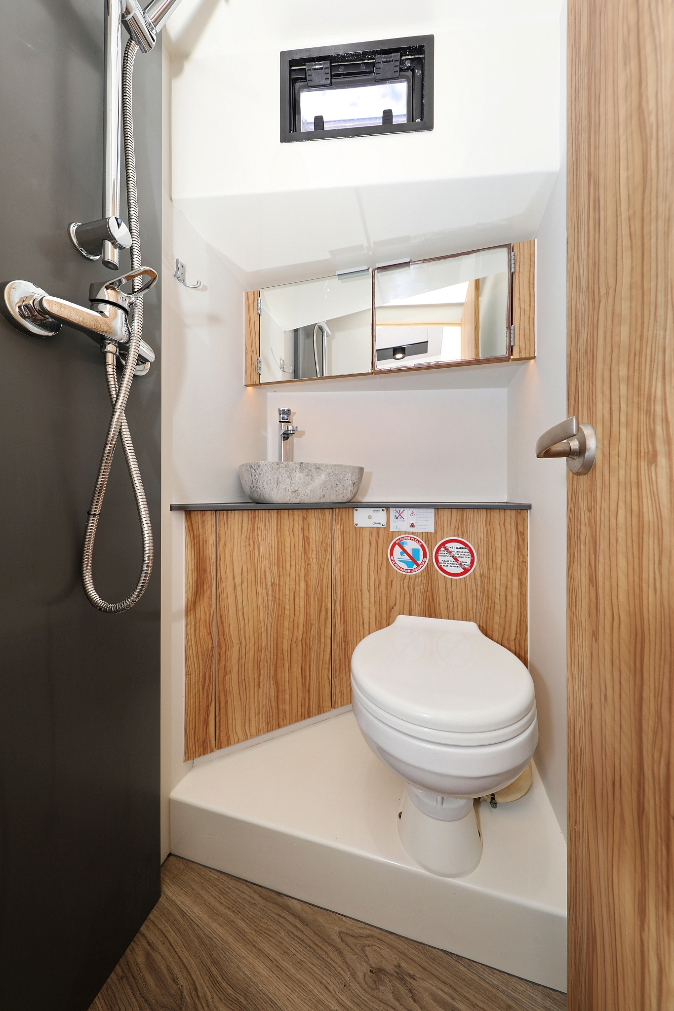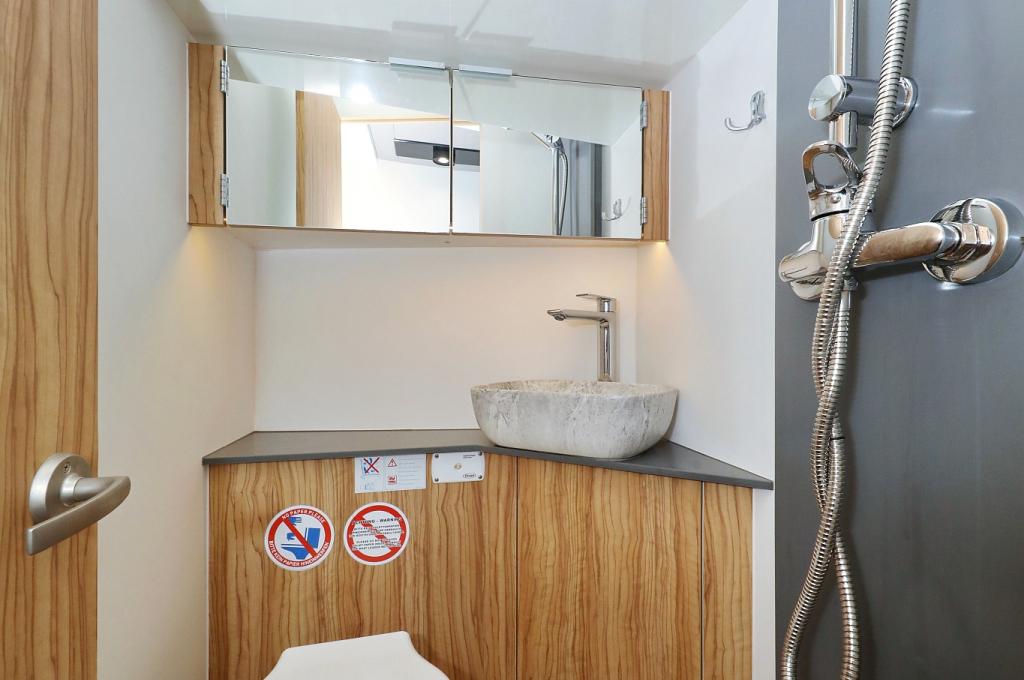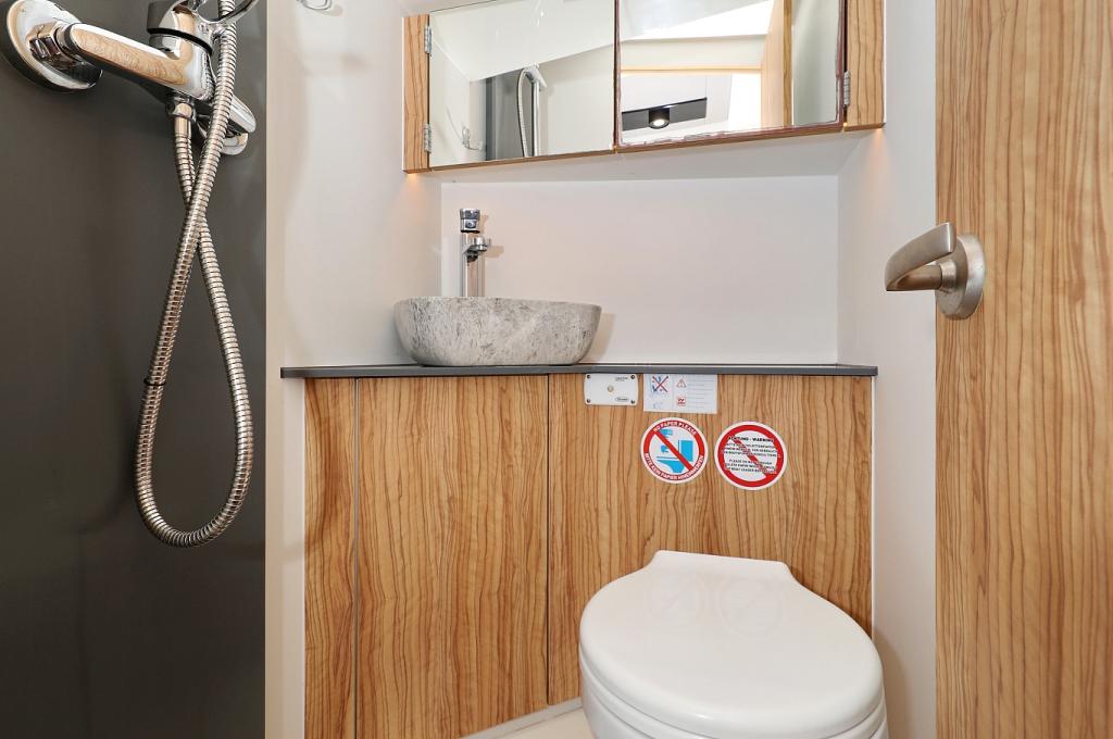 | Inside | 220V sockets, Black water tank, Gas oven, Heating, Inverter 12V/220V, Dock A/C 220V (cool&heat), Refrigerator, Battery charger, Shore power cable, Speakers in saloon, Moka pot, Pantry equipment, Radio with bluetooth, Sink, Kettle, WC (electr.) |