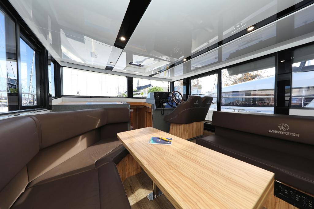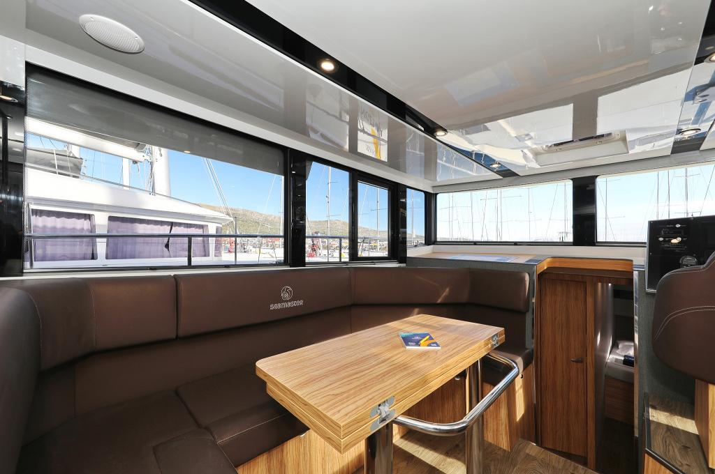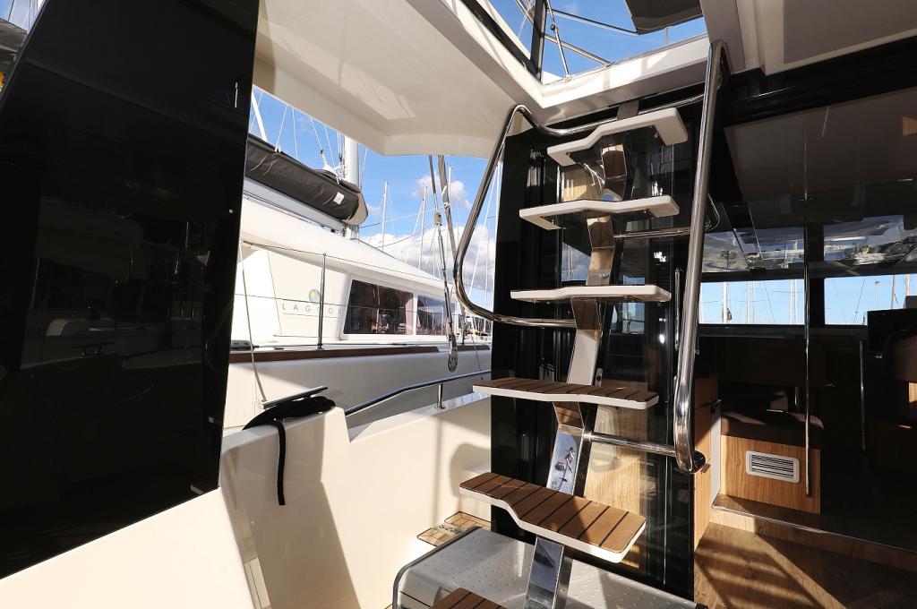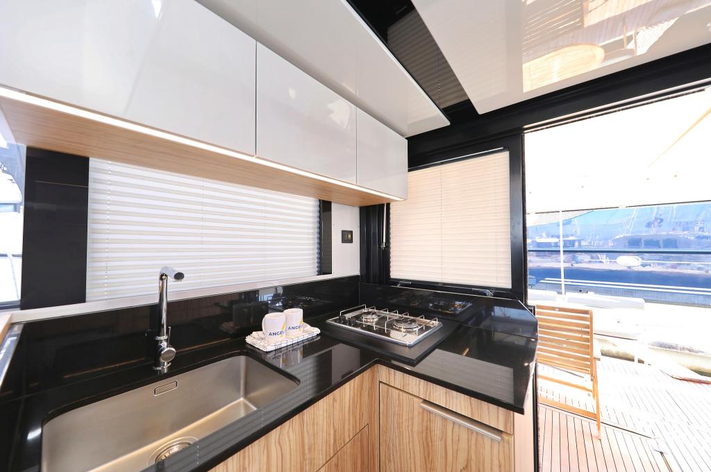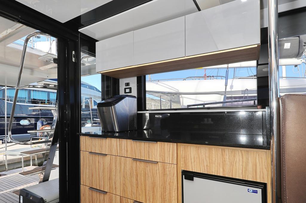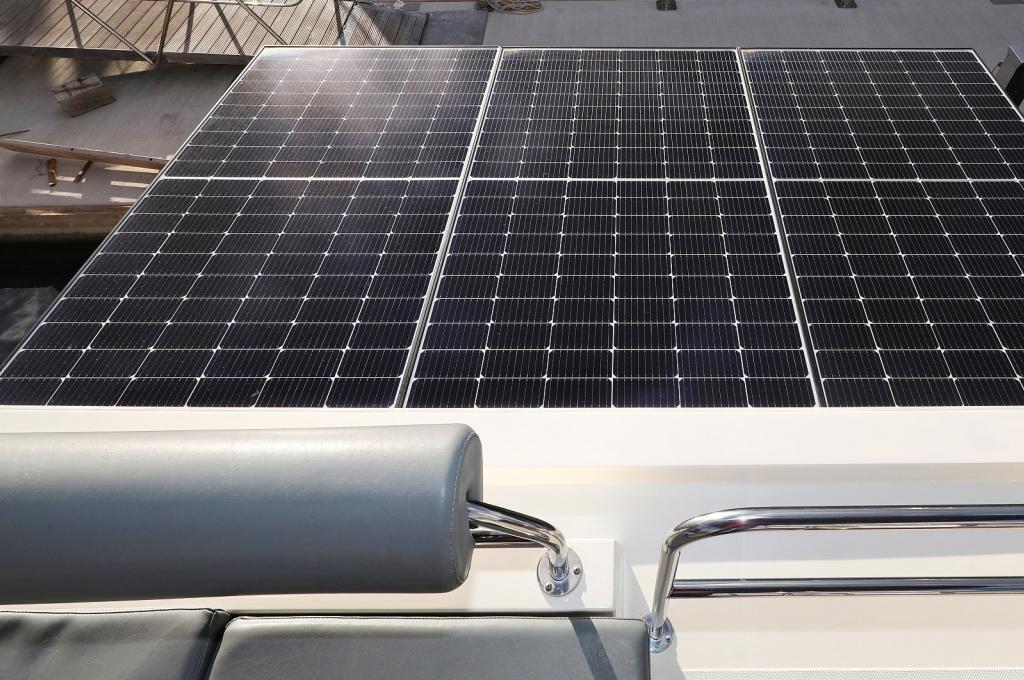 | Outside | Anchor with chain, Bathing ladder, Bathing platform, Bimini top, Boat hook, Cockpit shower, Refrigerator in cockpit, Cockpit speakers, Cockpit cushions, Cockpit table, Electr. anchor windlass, Fender, Mooring lines, Flybridge, Gangway, Solar panels, LED submarine lights, Water hose |