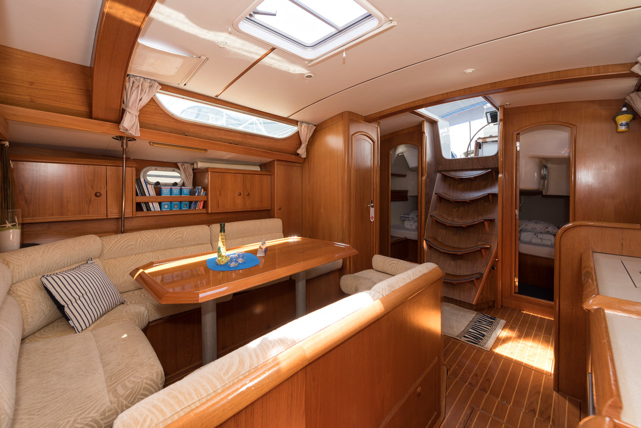 | Outside | 12V - connection, 220V shore connection, Bimini top, Boat hook, Cockpit shower, Cockpit speakers, Cockpit cushions, Cockpit table, Jerry cans for diesel, Electr. anchor windlass, Fender, Mooring lines, Gangway, Plastic bucket, Self-tailing winches, Solar panels, Sprayhood, Teak deck, Water hose, Windex |