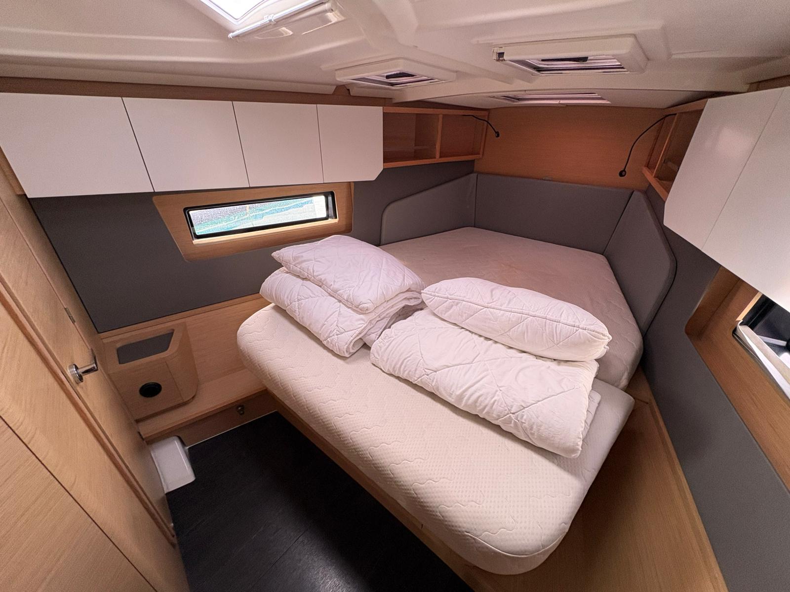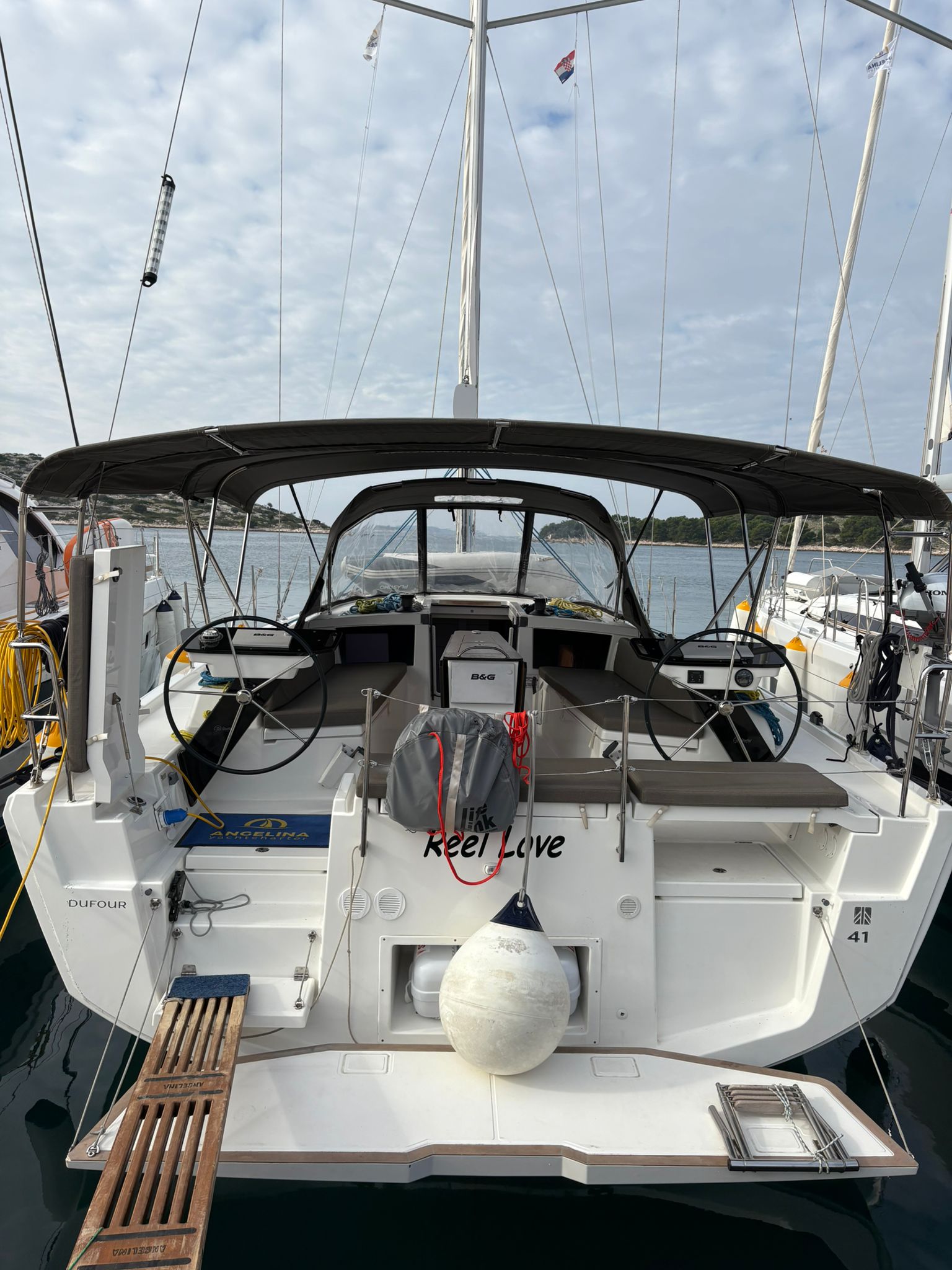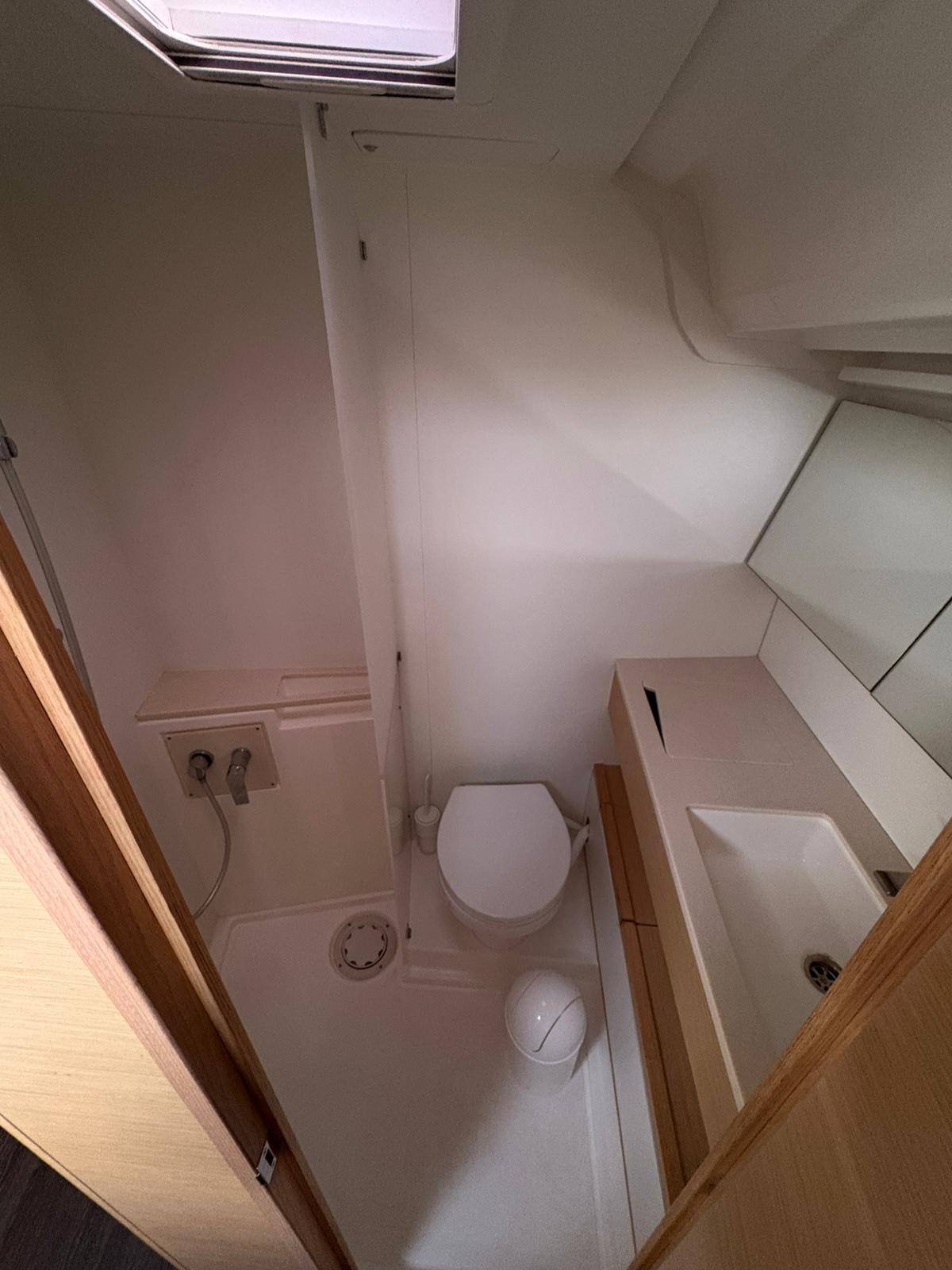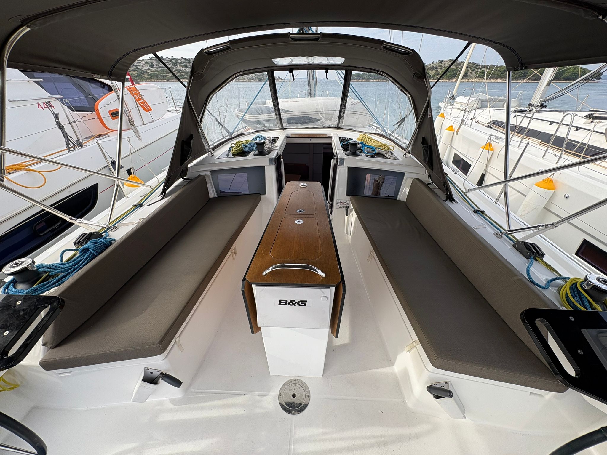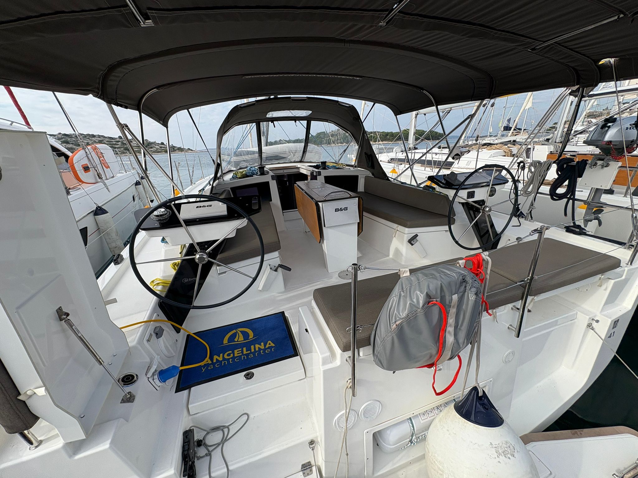 | Outside | 220V shore connection, Anchor with chain, Bathing platform, Bimini top, Boat hook, Cockpit shower, Cockpit speakers, Cockpit cushions, Cockpit table, Mooring lines, Gangway, BBQ, Solar panels, Sprayhood, Water hose, Windex, Winches |