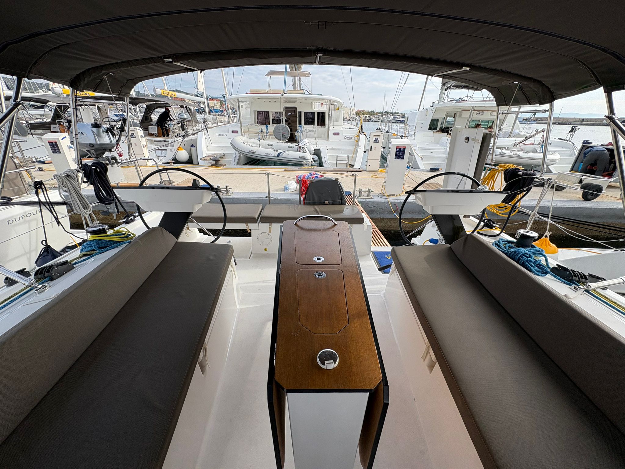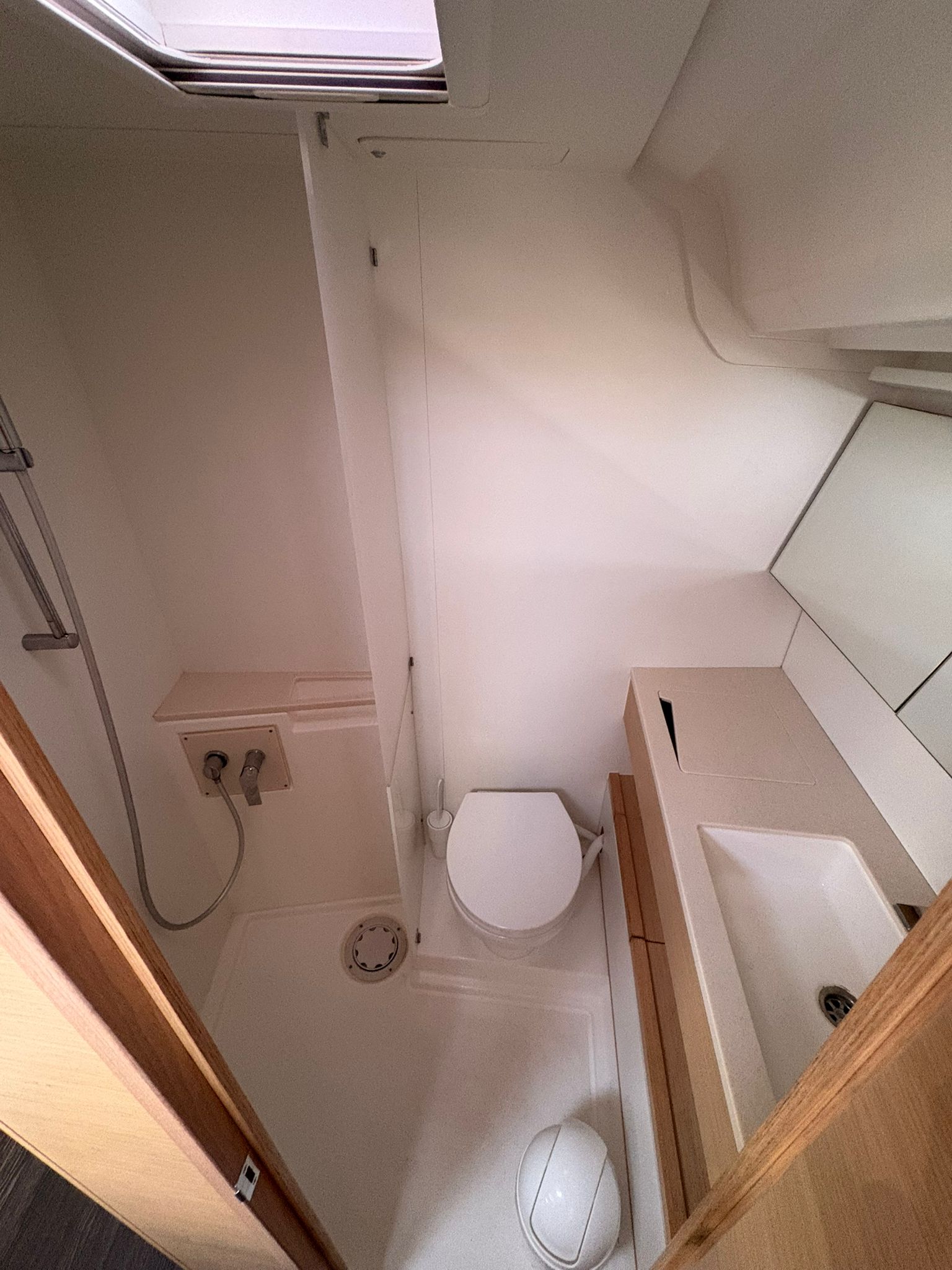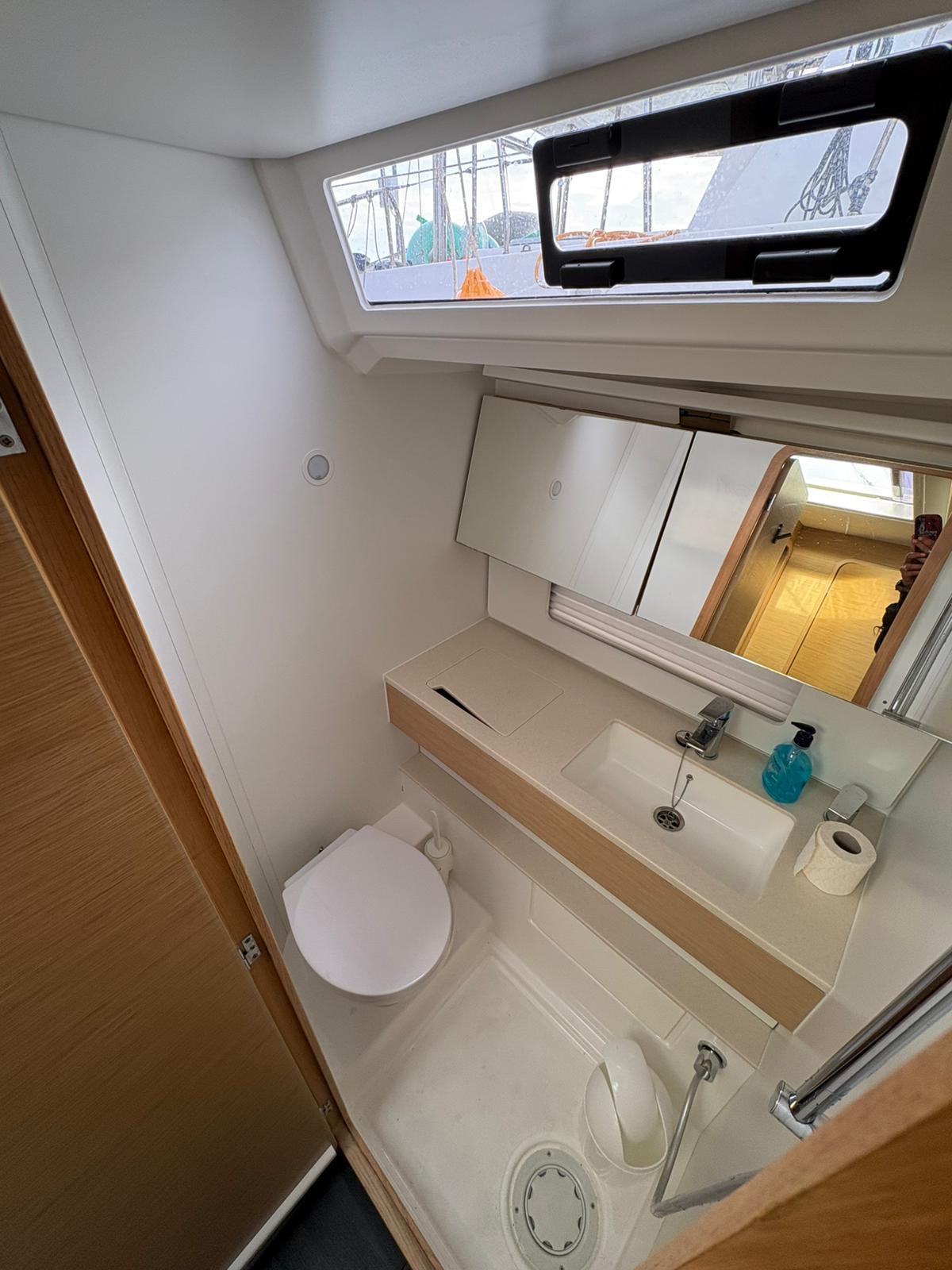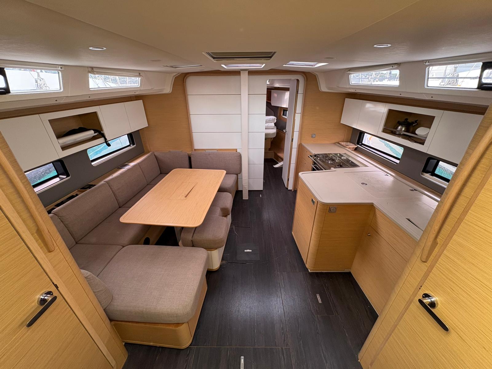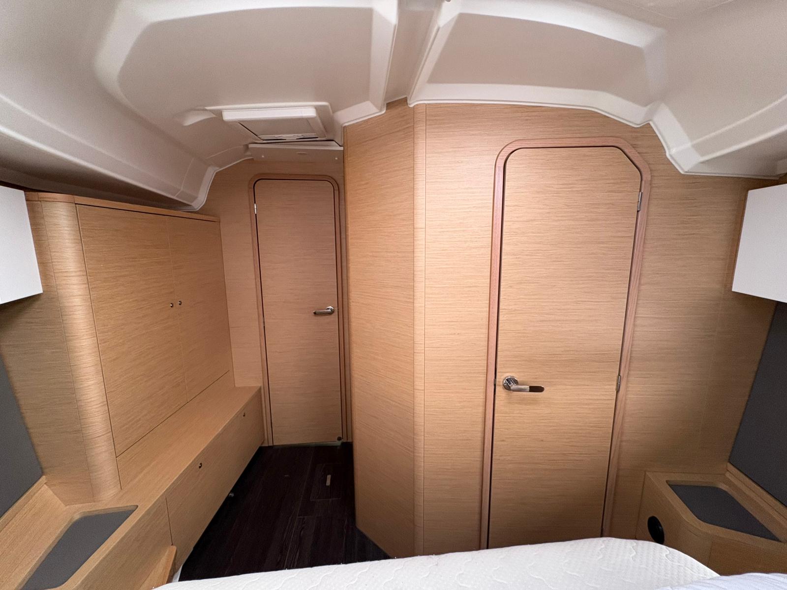 | Outside | 220V shore connection, Anchor with chain, Bathing platform, Bimini top, Boat hook, Cockpit shower, Cockpit speakers, Cockpit cushions, Cockpit table, Mooring lines, Gangway, BBQ, Solar panels, Sprayhood, Water hose, Windex, Winches |
