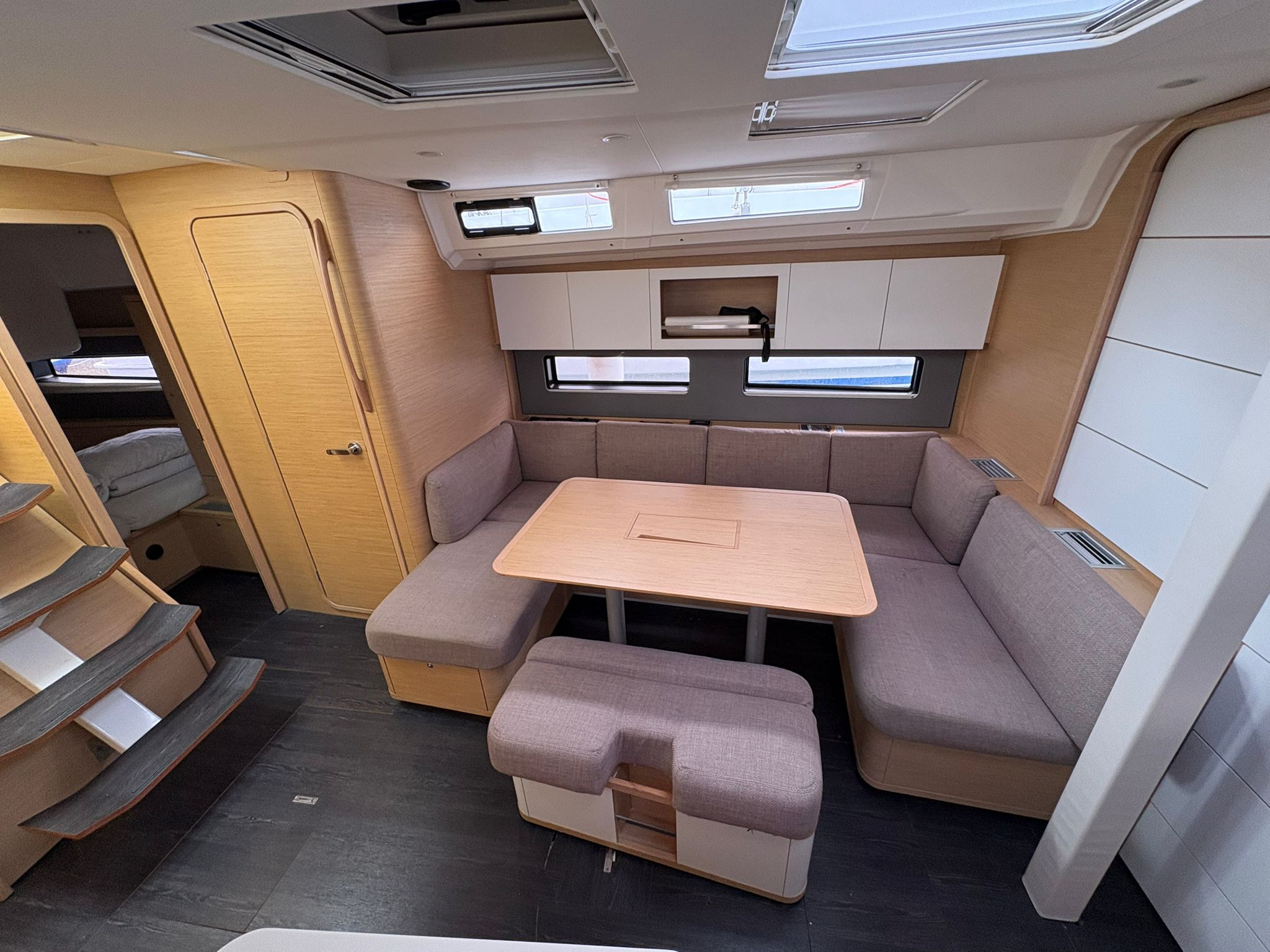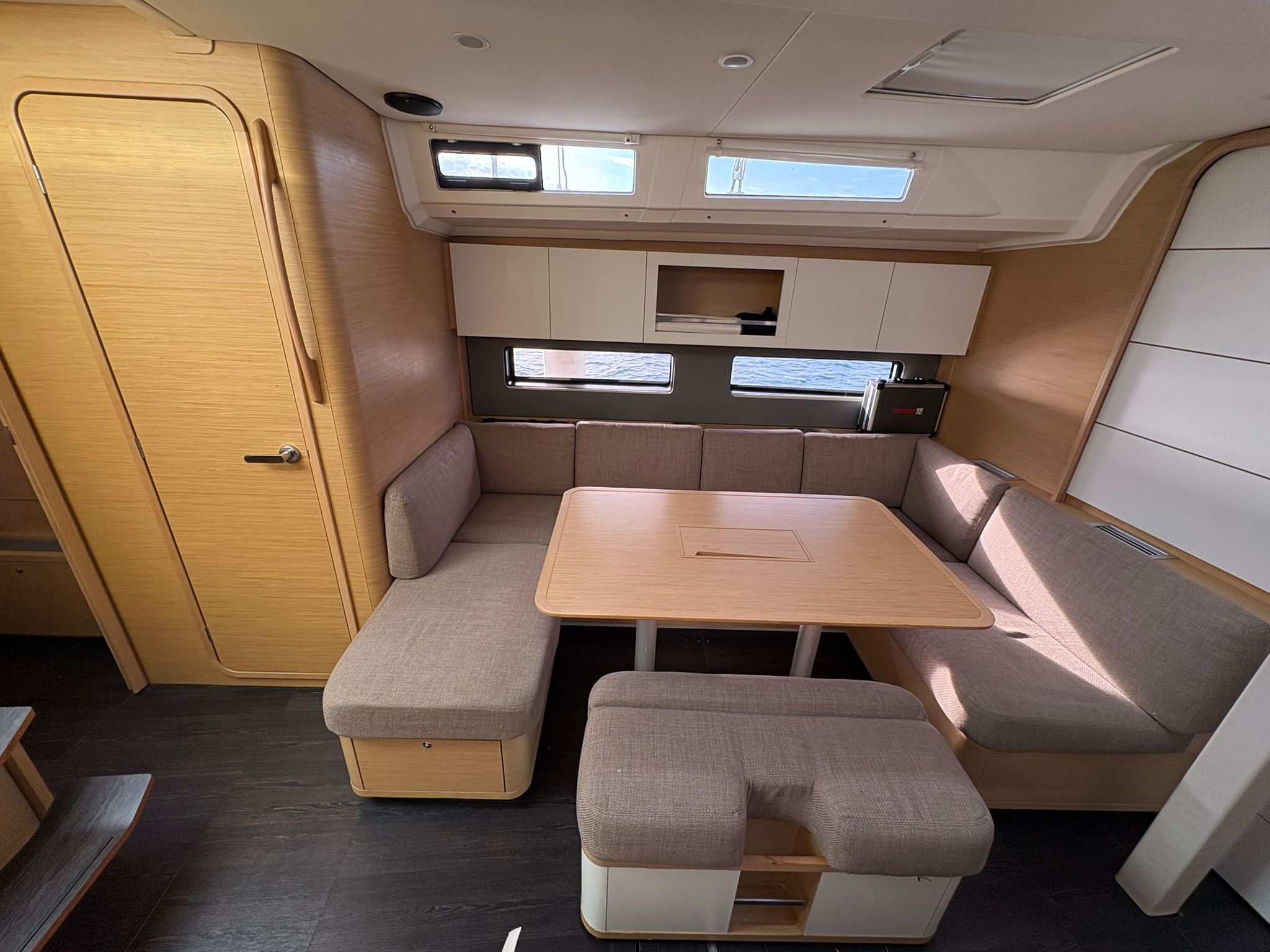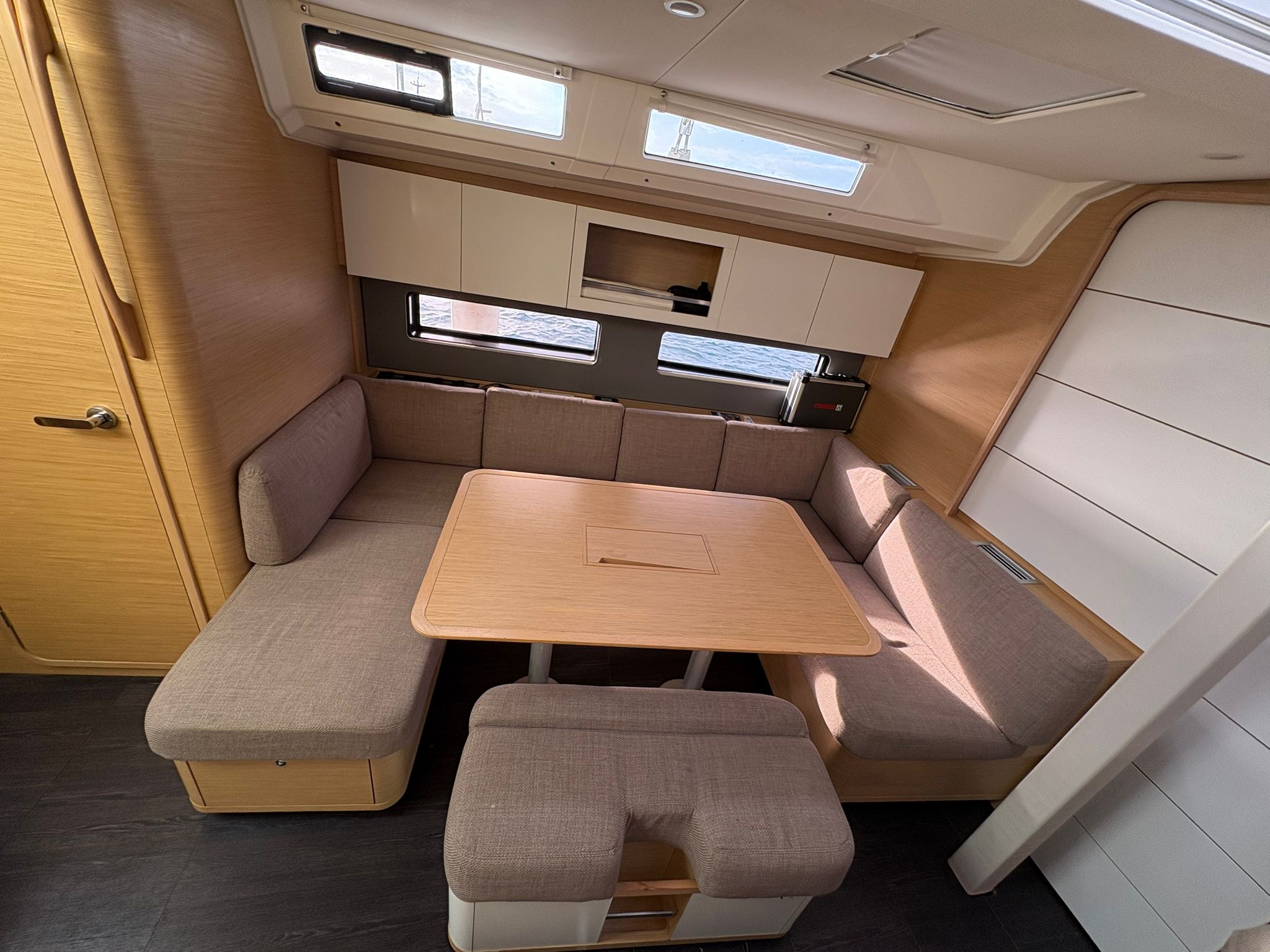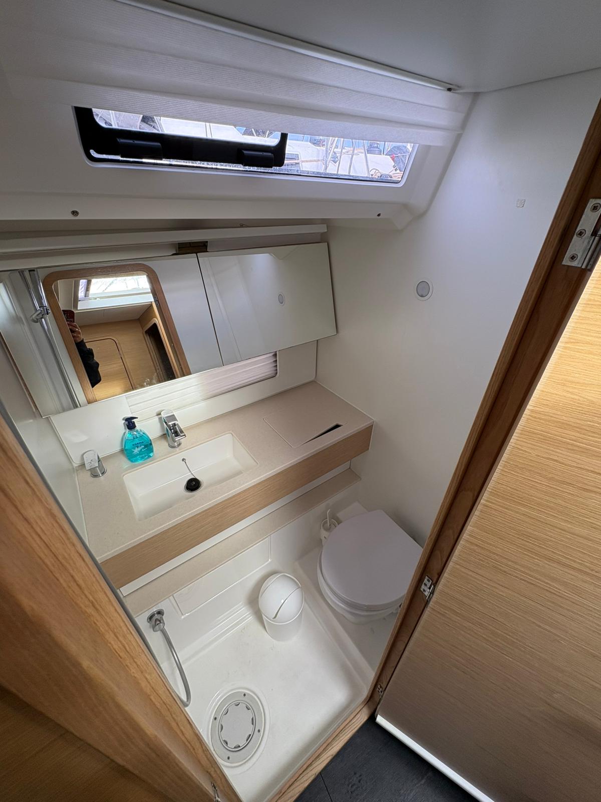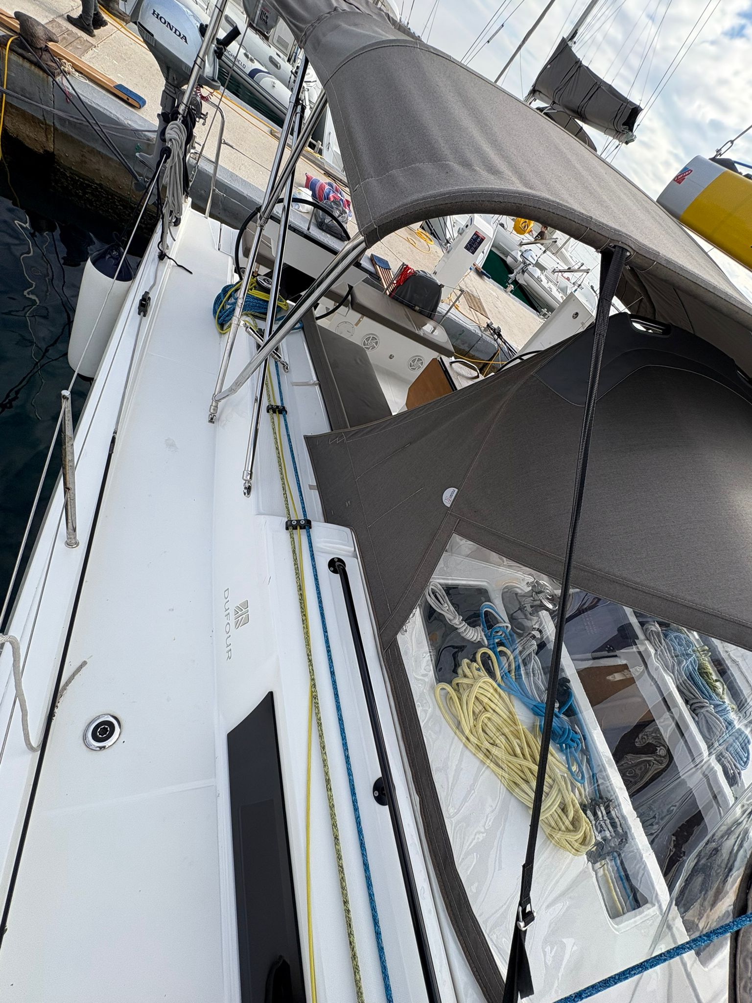 | Outside | 220V shore connection, Anchor with chain, Bathing platform, Bimini top, Boat hook, Cockpit shower, Cockpit speakers, Cockpit cushions, Cockpit table, Mooring lines, Gangway, BBQ, Solar panels, Sprayhood, Water hose, Windex, Winches |