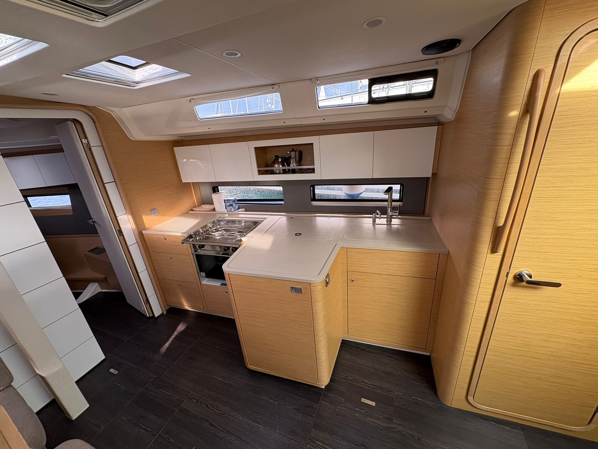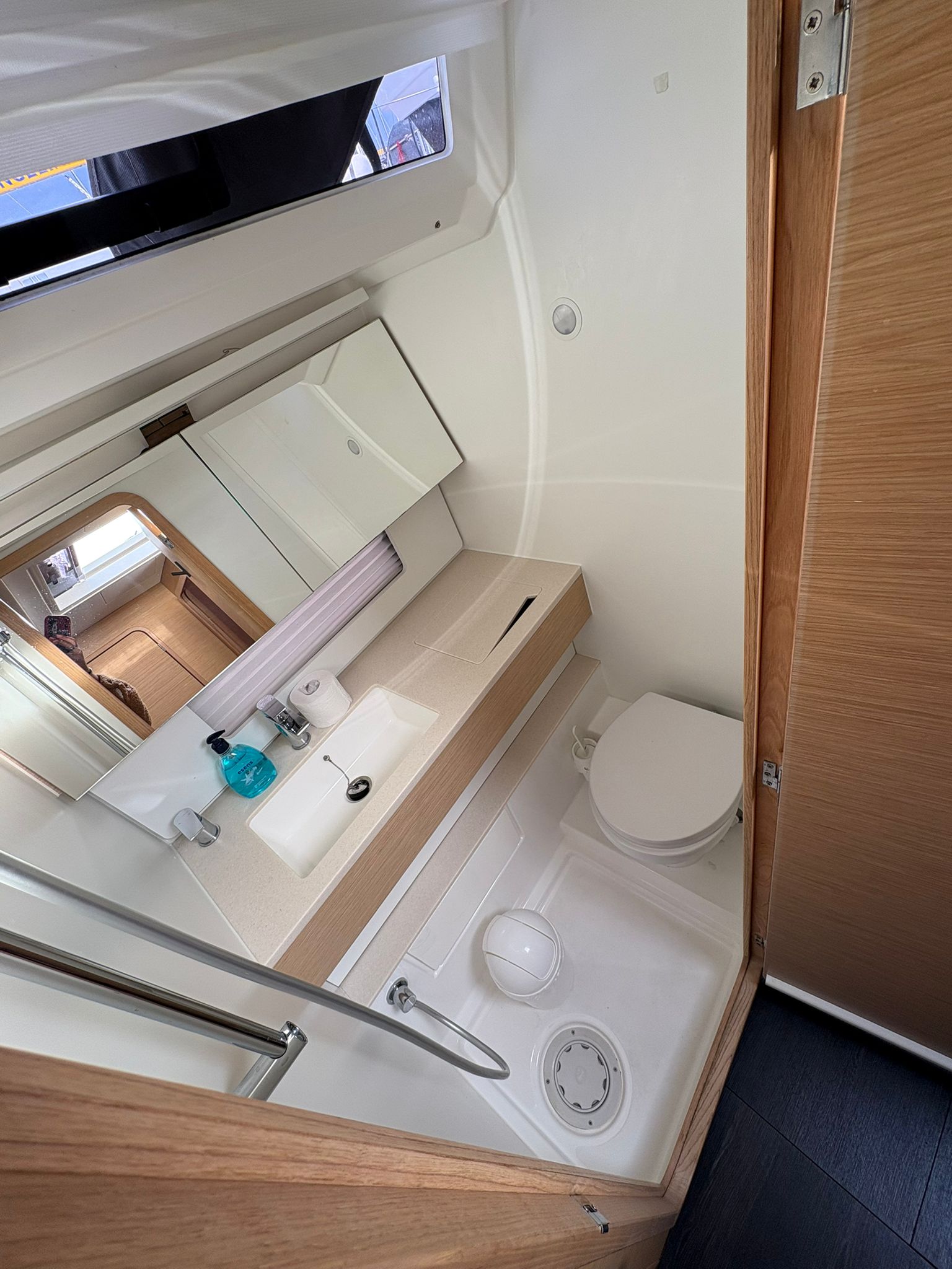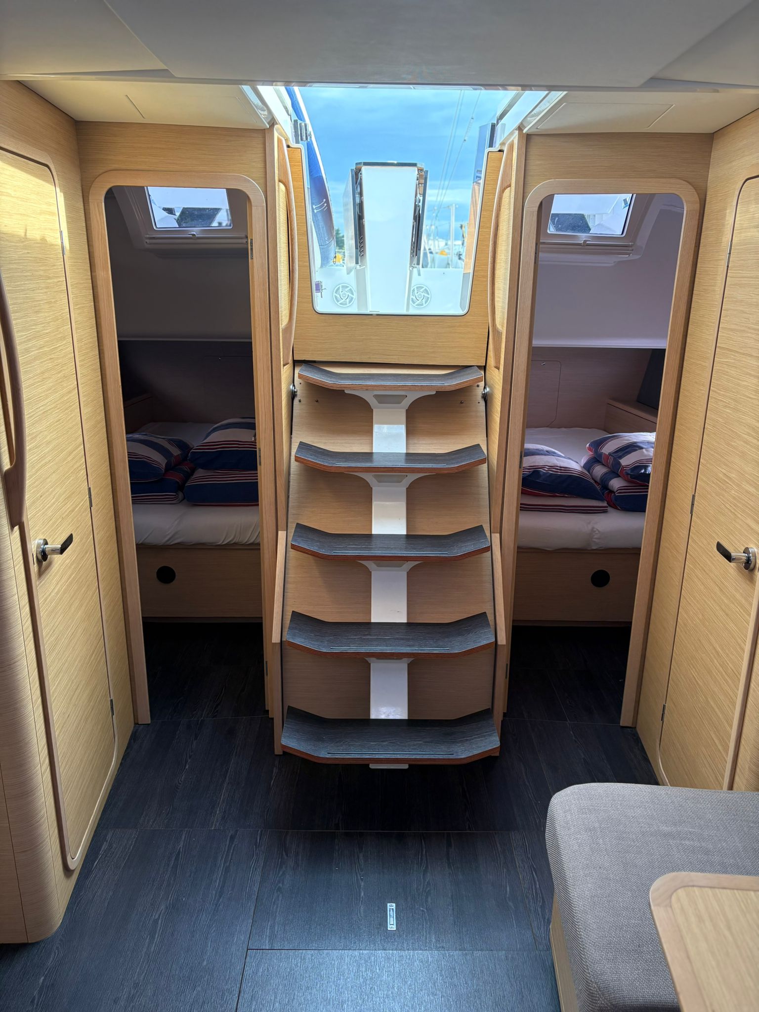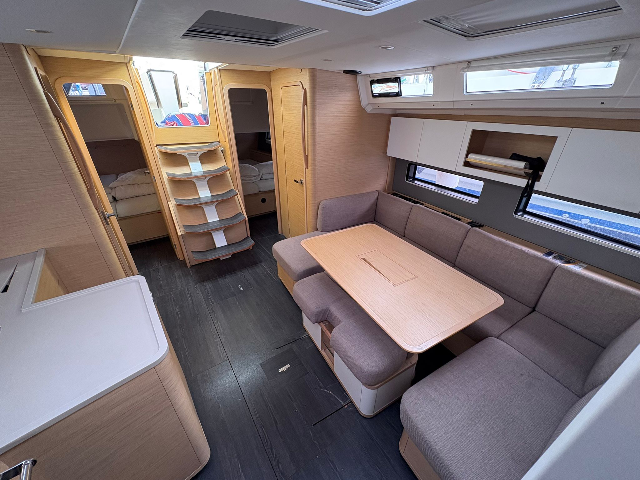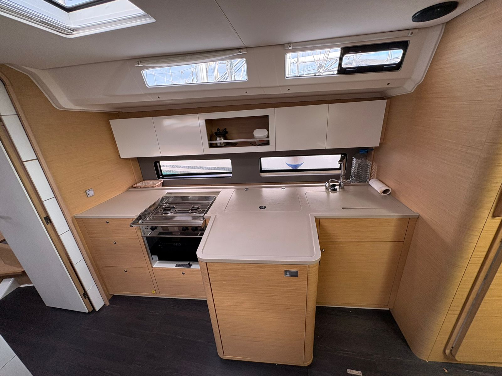 | Outside | 220V shore connection, Anchor with chain, Bathing platform, Bimini top, Boat hook, Cockpit shower, Cockpit speakers, Cockpit cushions, Cockpit table, Mooring lines, Gangway, BBQ, Solar panels, Sprayhood, Water hose, Windex, Winches |