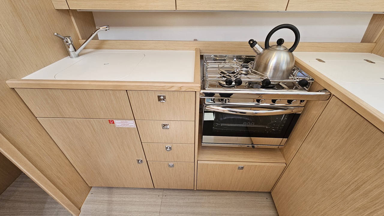 | Outside | 12V - connection, Bathing ladder, Bathing platform, Bimini top, Cockpit shower, Cockpit speakers, Cockpit table, Electr. anchor windlass, Gangway, Solar panels, Sprayhood, LED submarine lights, Windex |