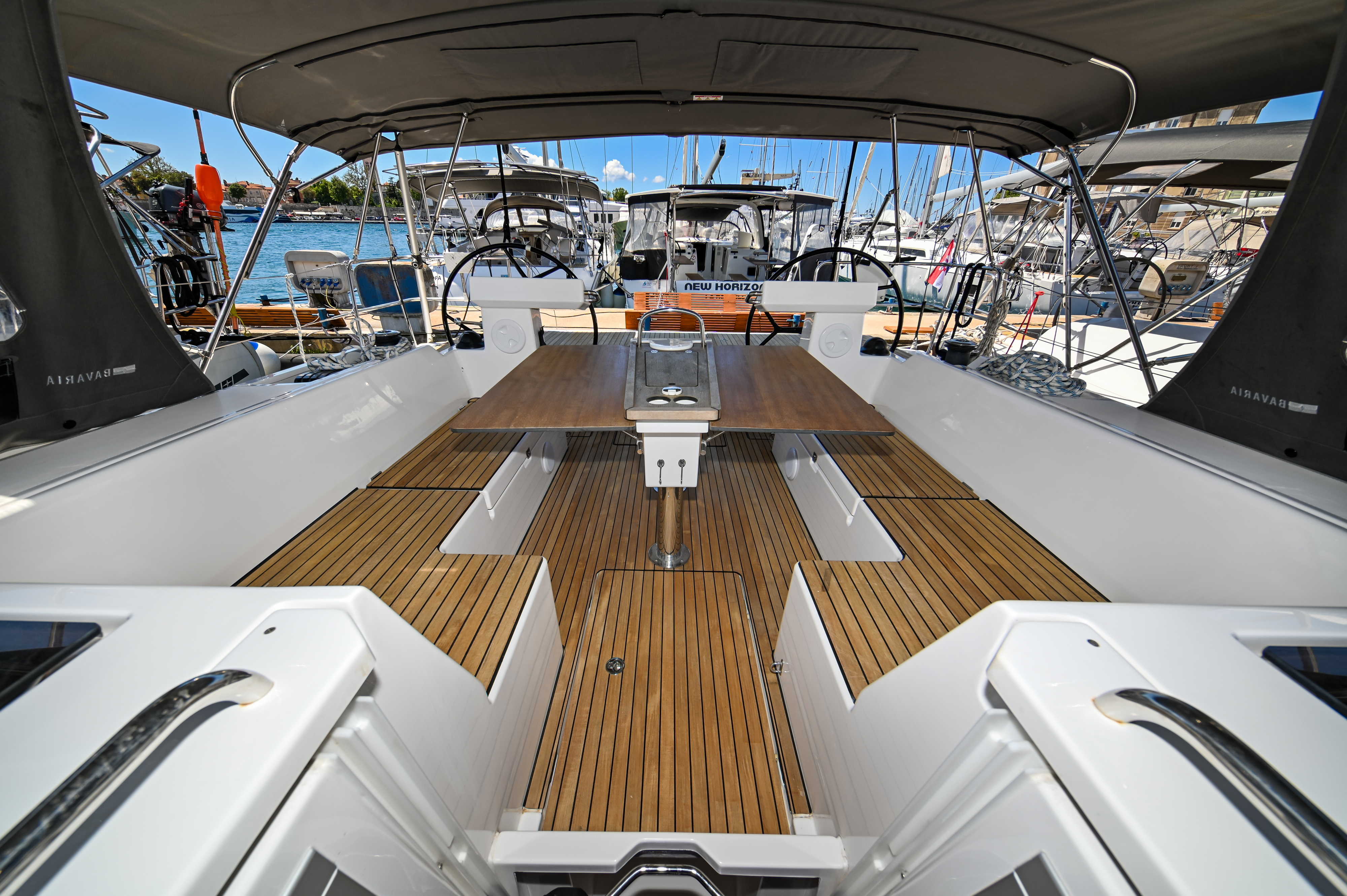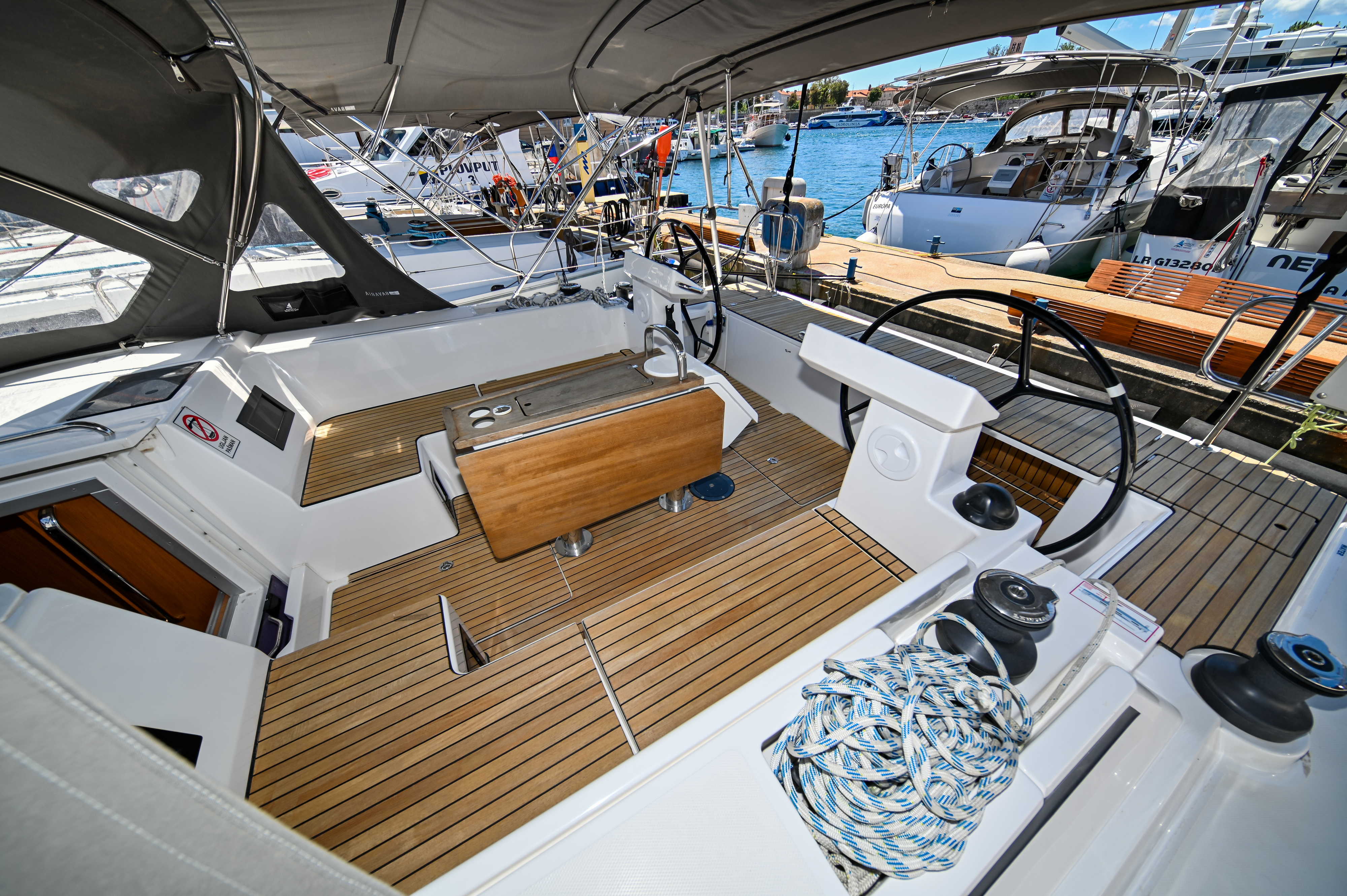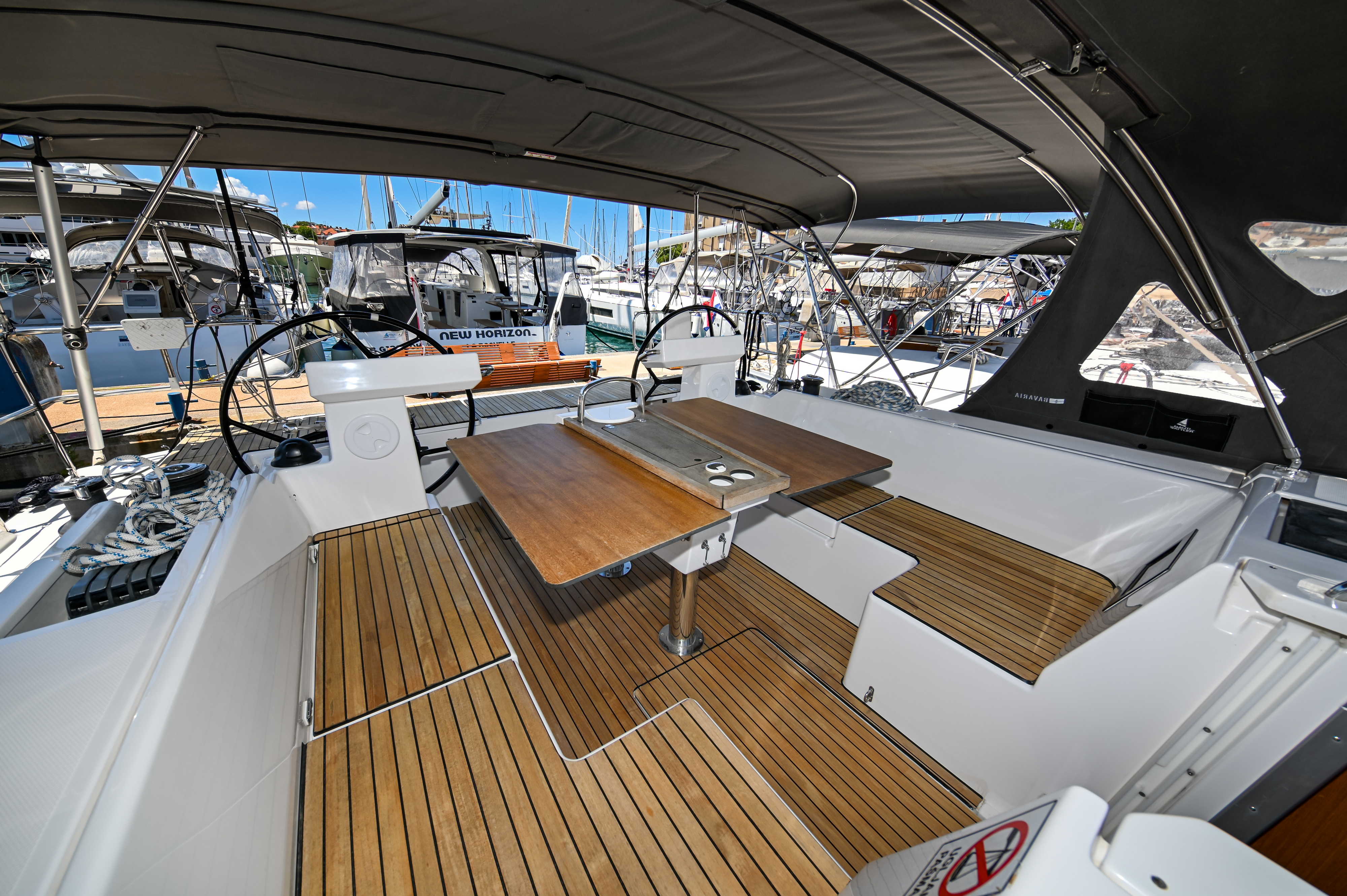 | Outside | Bathing platform, Bimini top, Boat hook, Cockpit shower, Cockpit speakers, Cockpit cushions, Cockpit table, Electr. anchor windlass, Fender, Mooring lines, Railing, Solar panels, Sprayhood, Teak in cockpit, Windex |