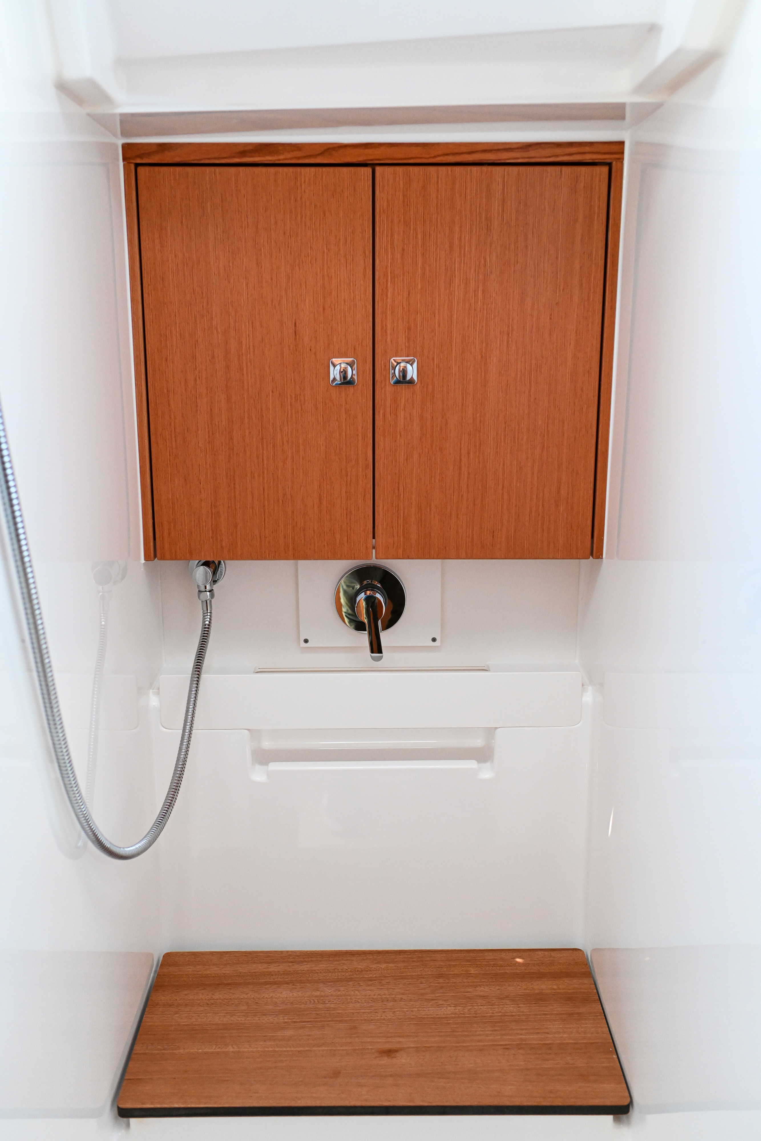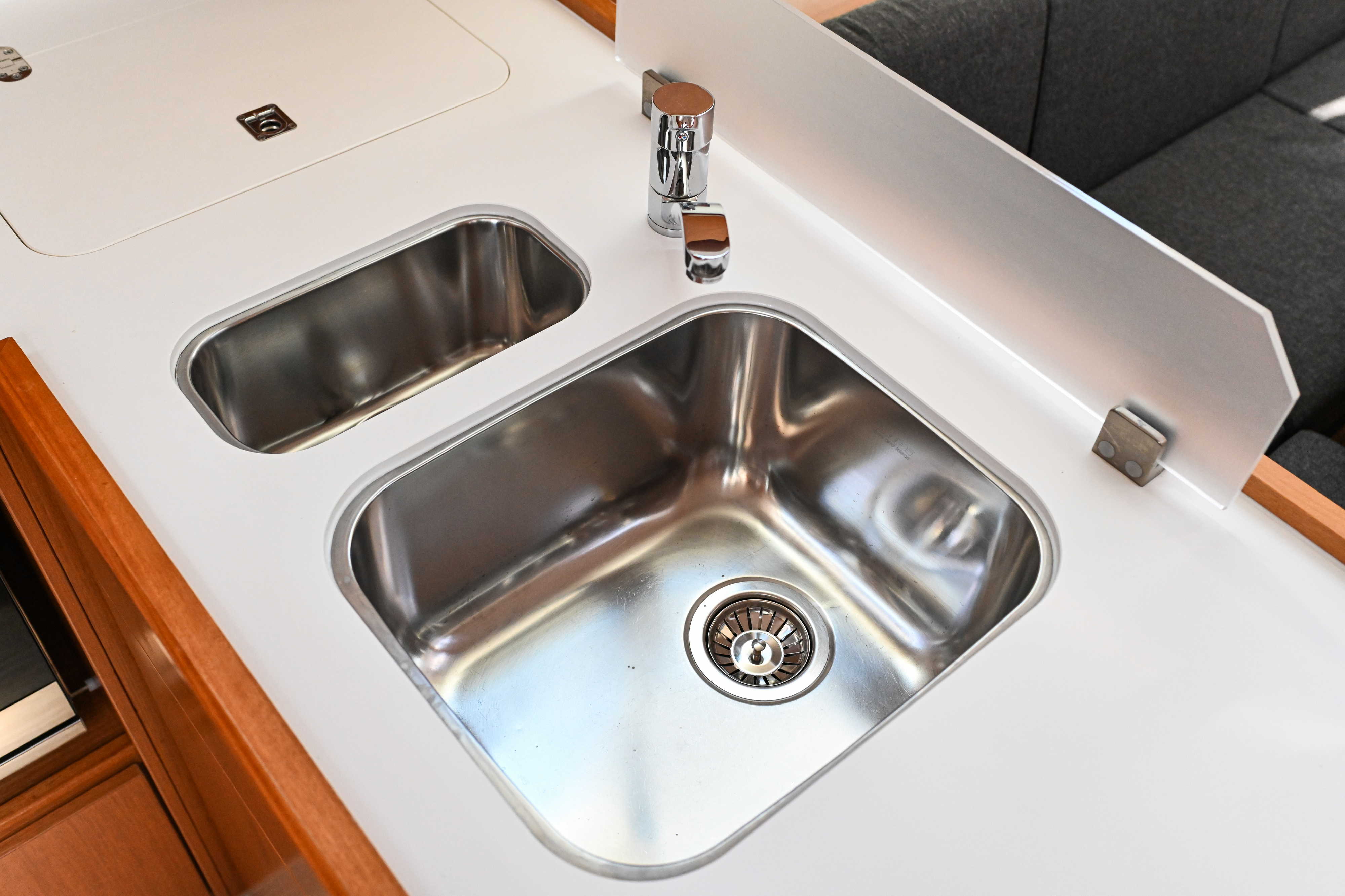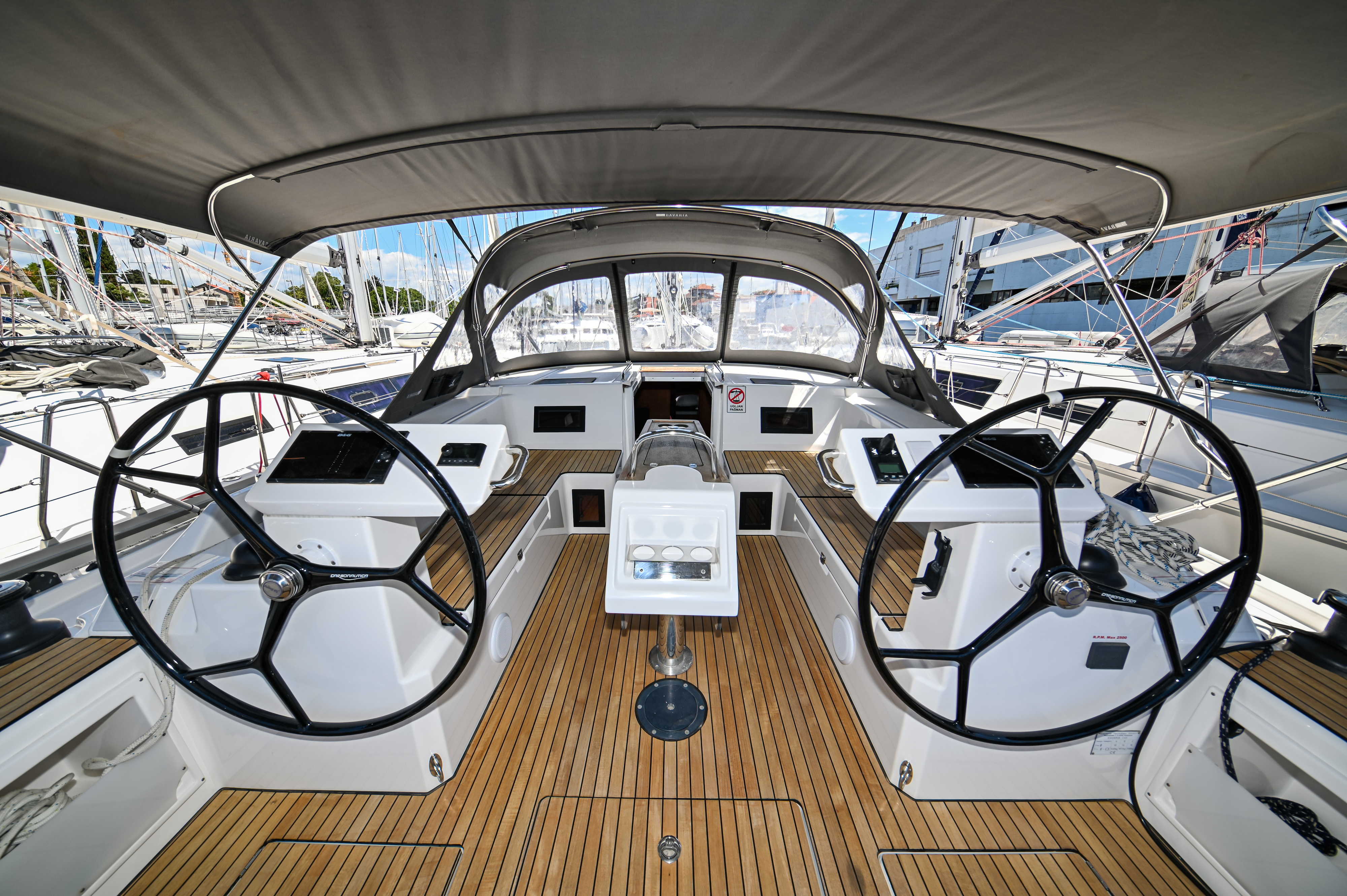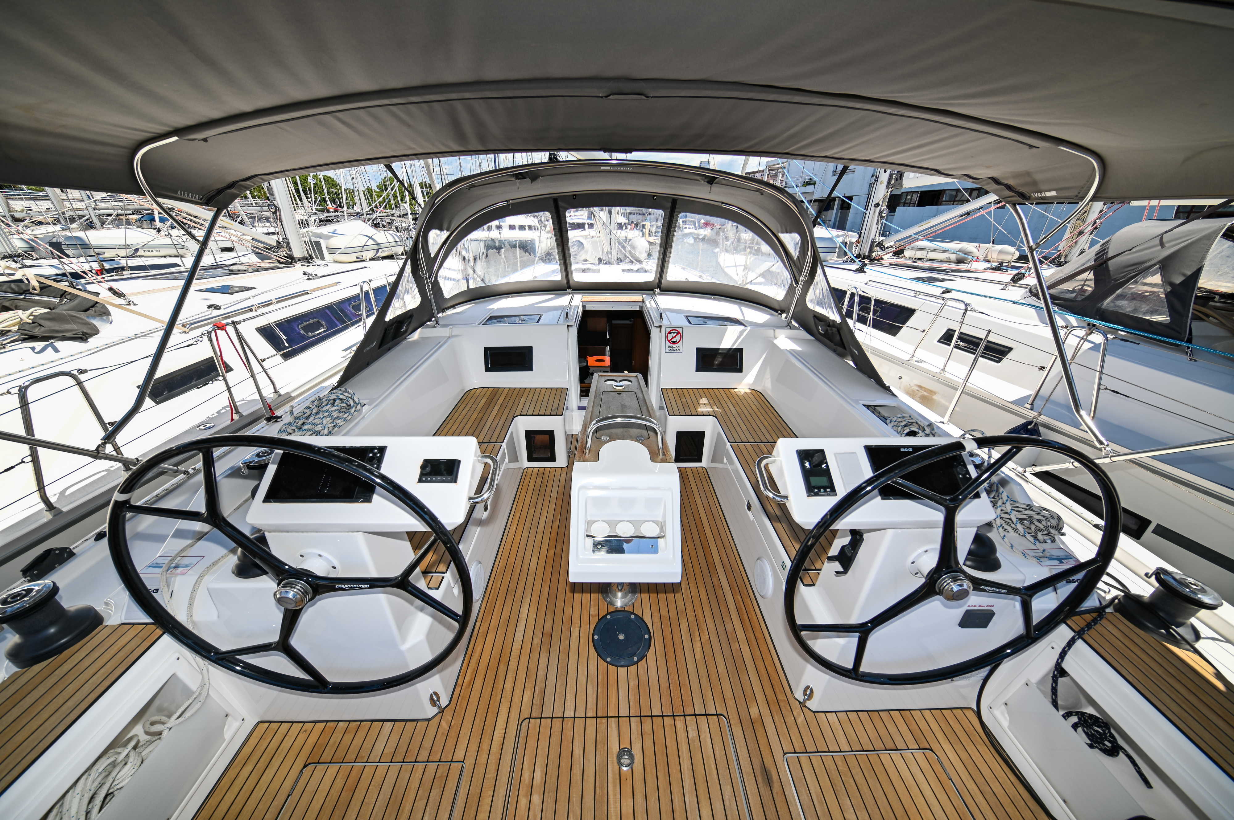 | Outside | Bathing platform, Bimini top, Boat hook, Cockpit shower, Cockpit speakers, Cockpit cushions, Cockpit table, Electr. anchor windlass, Fender, Mooring lines, Railing, Solar panels, Sprayhood, Teak in cockpit, Windex |