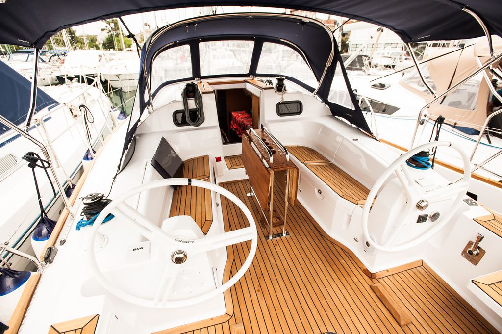 | Outside | Anchor with chain, Bathing ladder, Bathing platform, Bimini top, Boat hook, Cockpit shower, Cockpit speakers, Cockpit cushions, Cockpit table, Electr. anchor windlass, Folding propeller, Fender, Mooring lines, Gangway, Sprayhood, Teak in cockpit, LED submarine lights, Water hose, Windex |