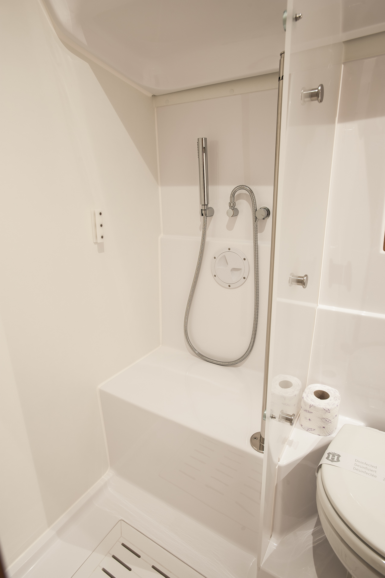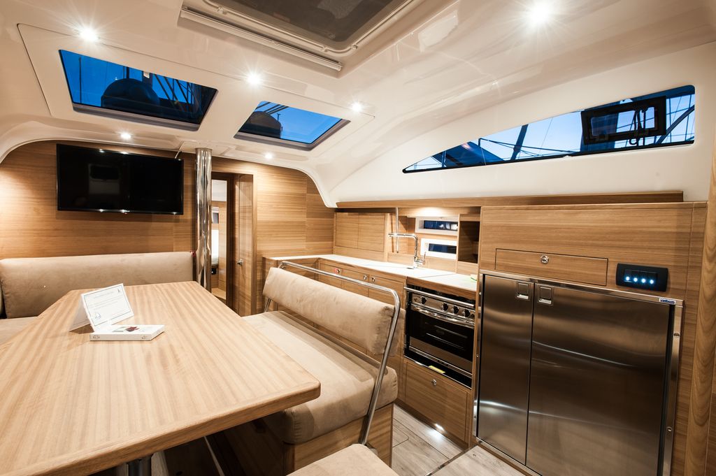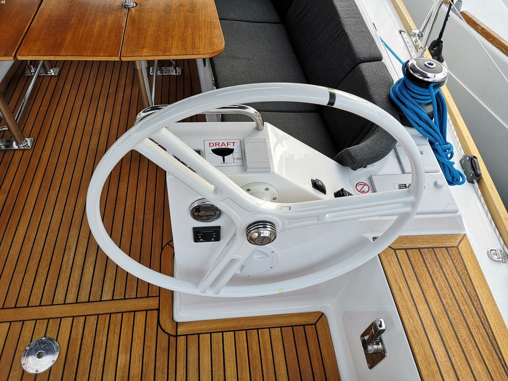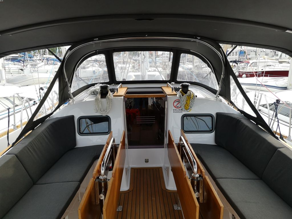 | Outside | Anchor with chain, Bathing ladder, Bathing platform, Bimini top, Cockpit shower, Refrigerator in cockpit, Cockpit speakers, Cockpit cushions, Cockpit table, Electr. anchor windlass, Fender, Mooring lines, Gangway, BBQ, Sprayhood, Water hose, Windex |