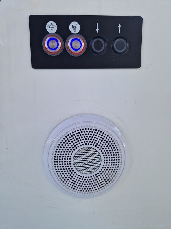 | Outside | 220V shore connection, Anchor with chain, Bathing ladder, Bathing platform, Bimini top, Cockpit shower, Refrigerator in cockpit, Cockpit speakers, Cockpit cushions, Cockpit table, Electr. anchor windlass, Fender, Mooring lines, Gangway, Solar panels, Sprayhood, Water hose, Windex |