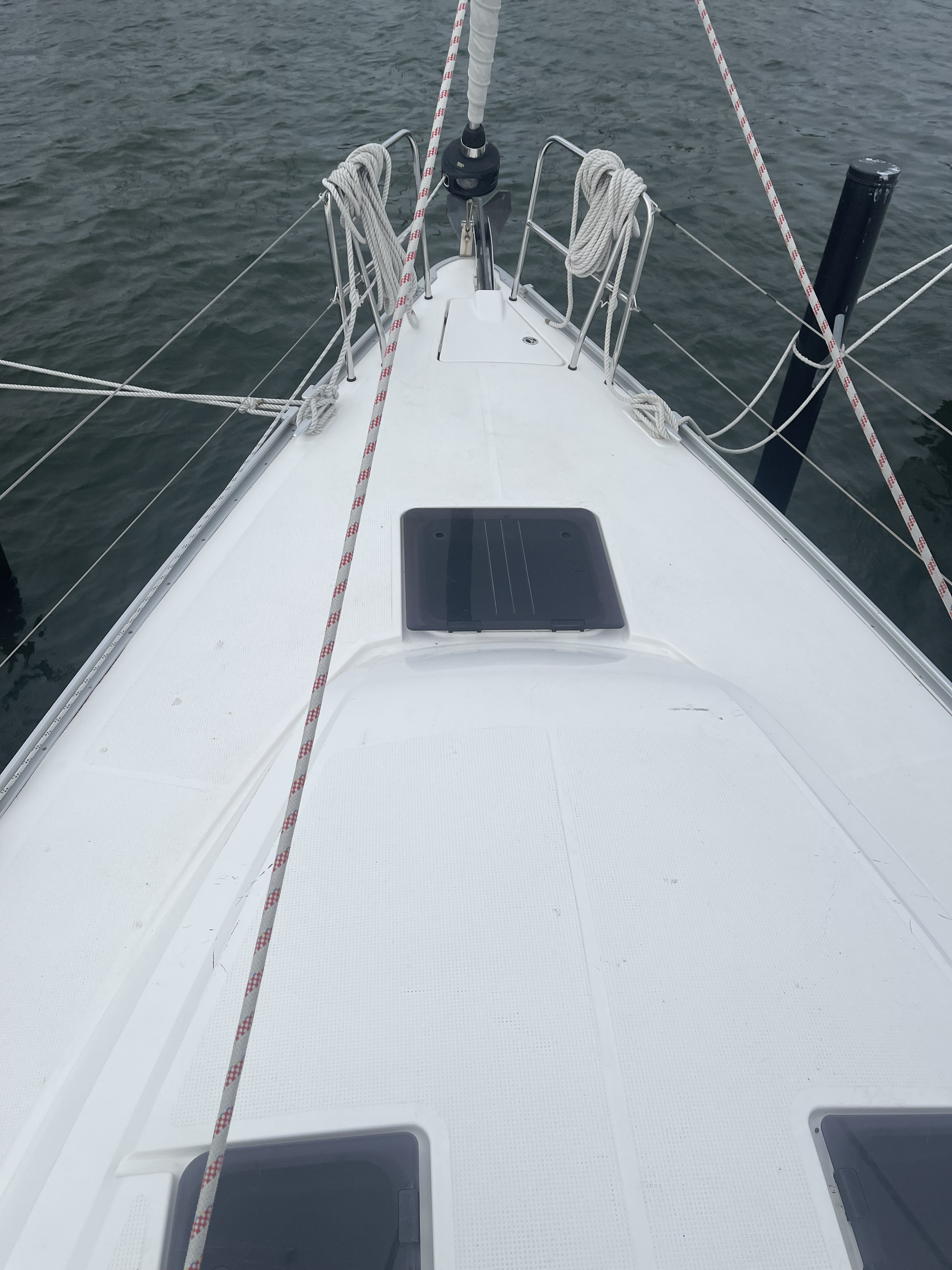 | Outside | 220V shore connection, Boat hook, CQR anchor, Electr. anchor windlass, Halyard winches, self-tailing, Fender, Mooring lines, Genoa pinches, self-tailing, Stern anchor, Sprayhood, Windex |