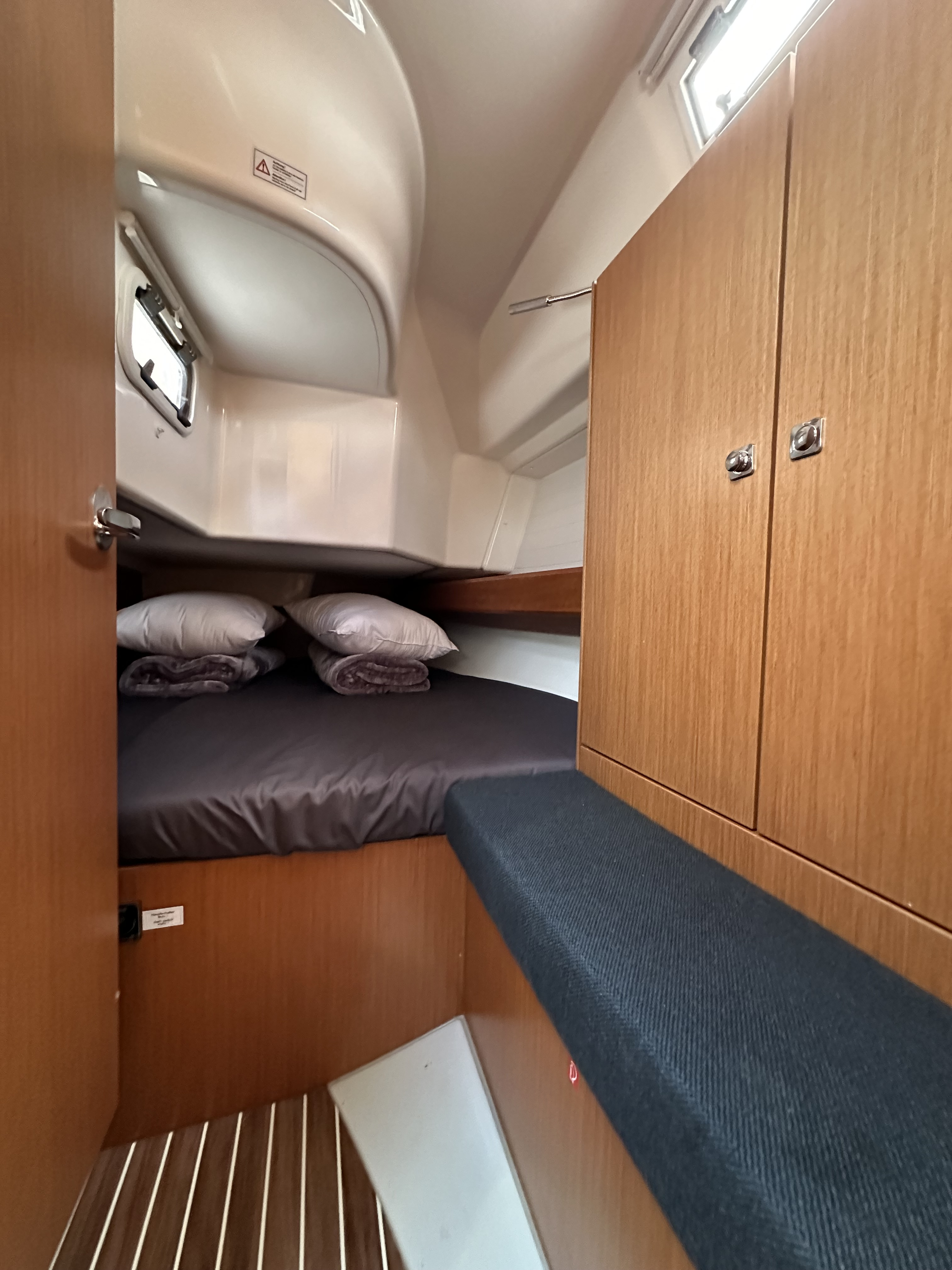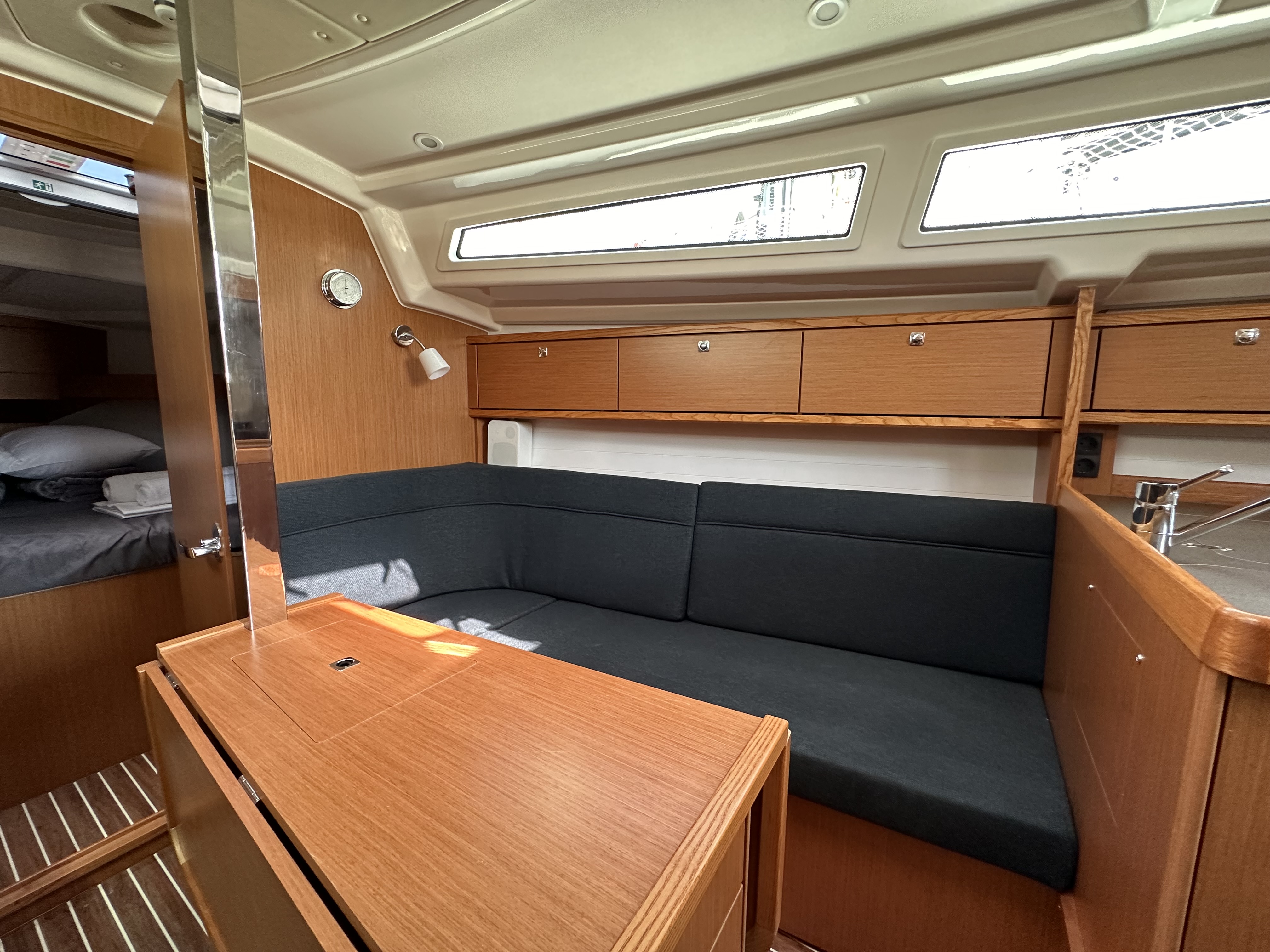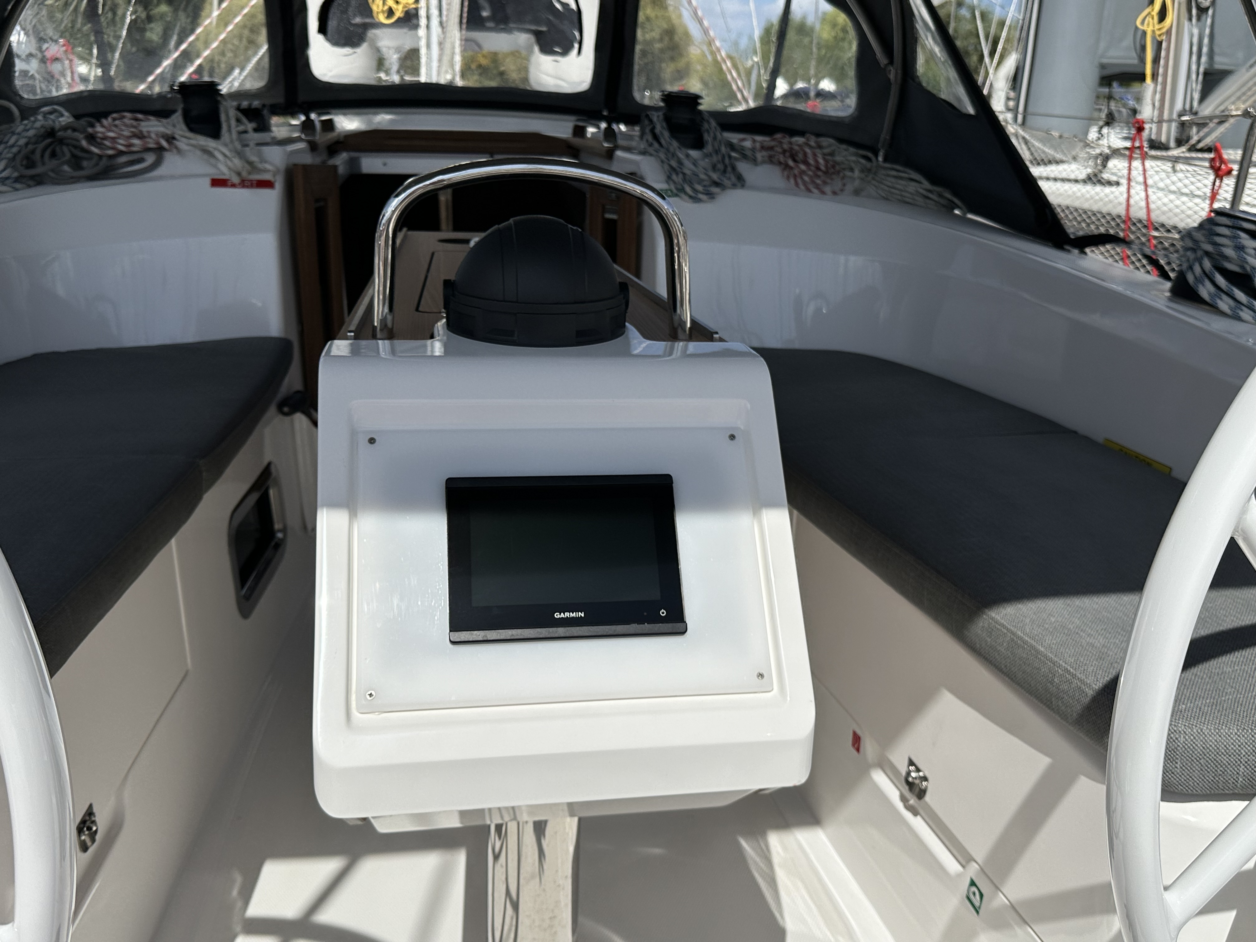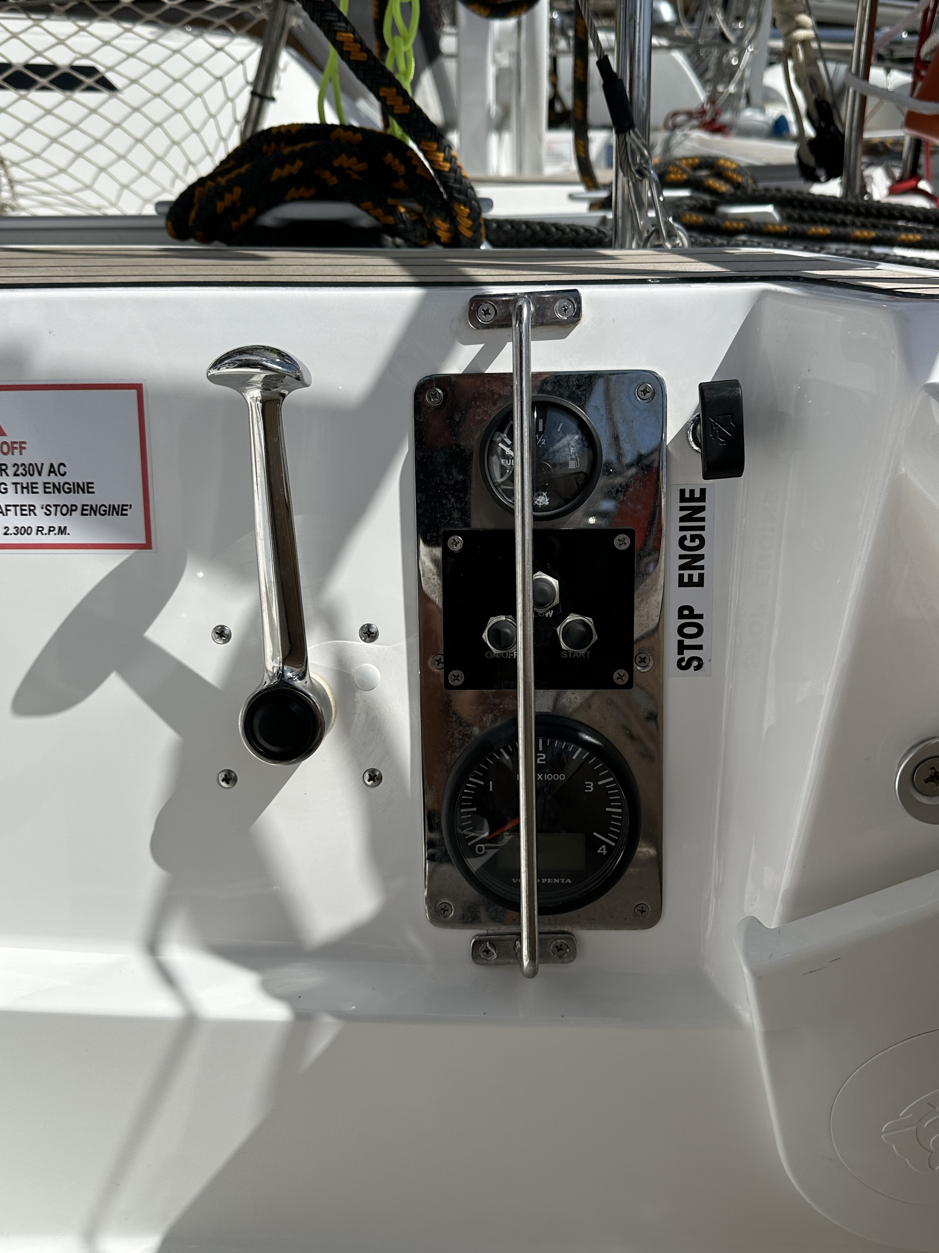 | Outside | Anchor with chain, Bathing ladder, Bathing platform, Bimini top, Boat hook, Cockpit shower, Cockpit speakers, Cockpit cushions, Electr. anchor windlass, Mooring lines, Gangway, Solar panels, Sprayhood, Wire (shroud) cutter |