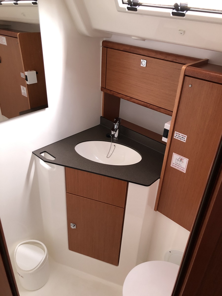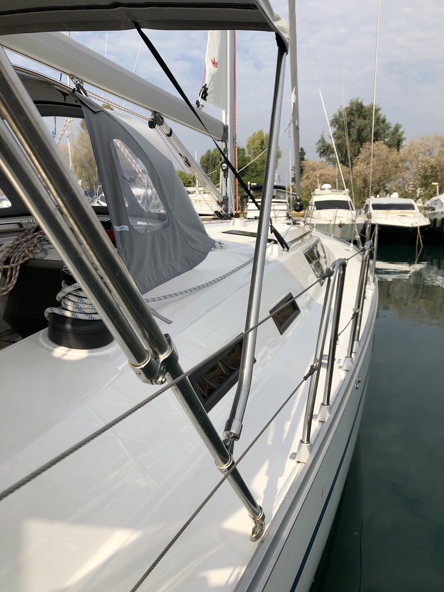 | Outside | Anchor with chain, Bathing platform, Bimini top, Boat hook, Cockpit shower, Cockpit speakers, Cockpit cushions, Electr. anchor windlass, Mooring lines, Gangway, Solar panels, Sprayhood, Wire (shroud) cutter |