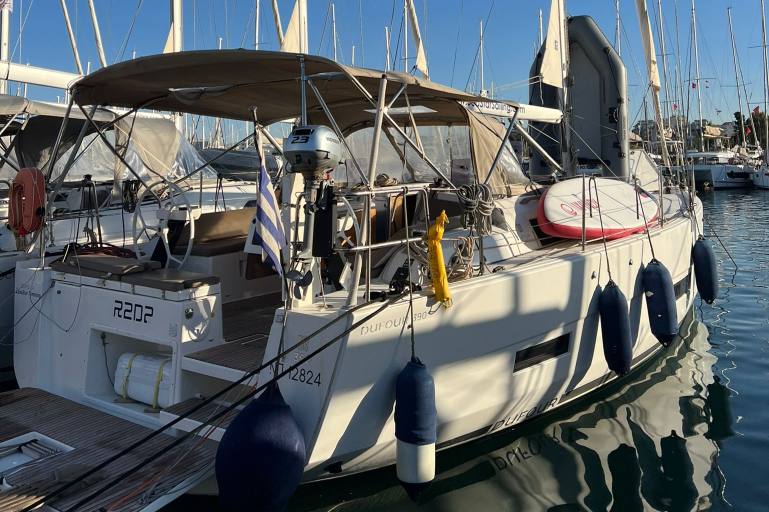 | Outside | 220V shore connection, Anchor with chain, Anchor winch, Bathing ladder, Bathing platform, Bimini top, Cockpit shower, Cockpit speakers, Cockpit cushions, Cockpit table, Electr. anchor windlass, Fender, BBQ, Snorkeling gear, Solar panels, Sprayhood, Teak on bathing platform, Teak in cockpit |