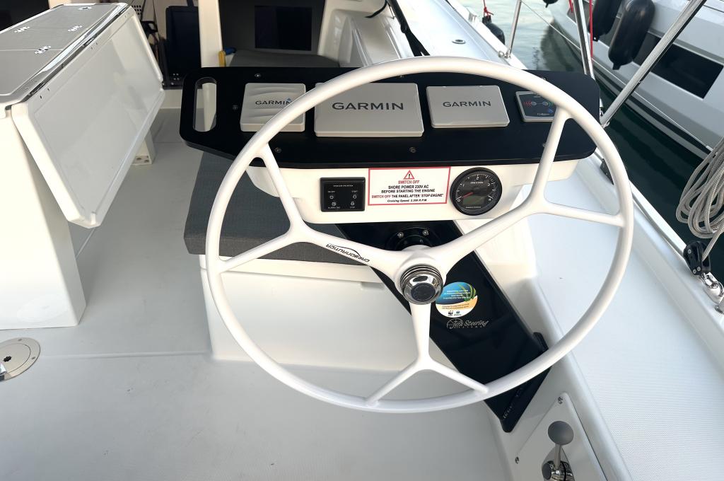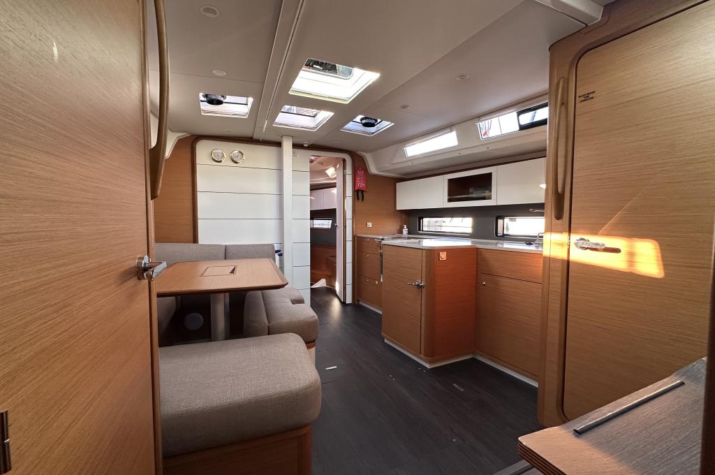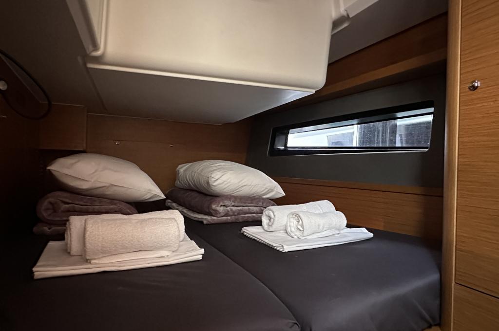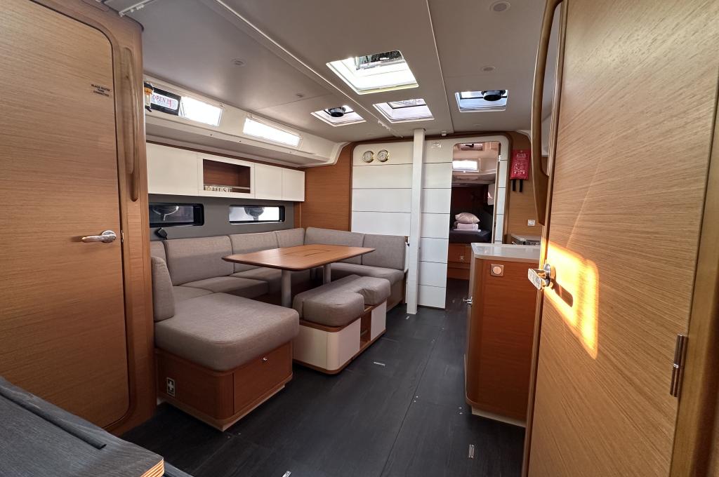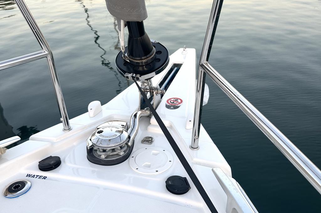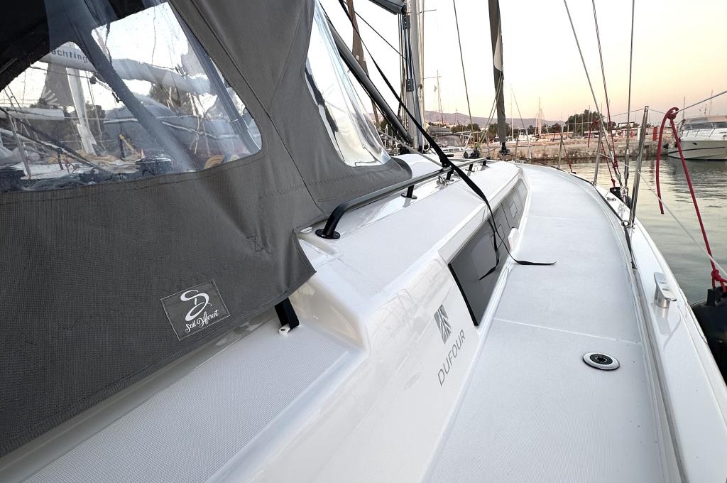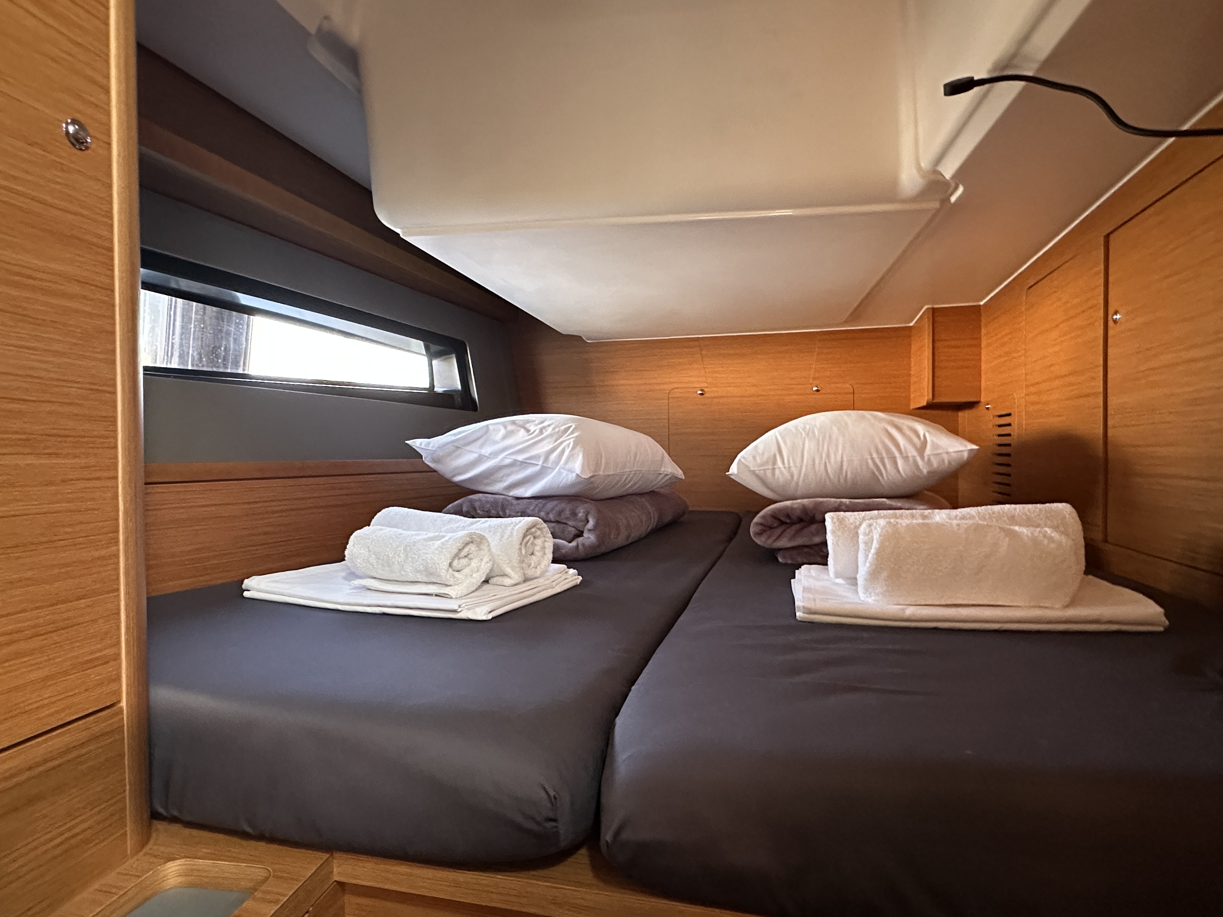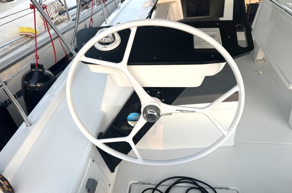 Die Doufor 41.8 aus 2025 st eine sehr geräumige Yacht, speziell die el. Toiletten haben uns überzeugt. Allerdings ist das Rigg auf Grund der Auslegung (Selbstwendefock, kein Traveller am Gross) nur eingeschränkt trimmbar. Auch hatte der Autopilot einige Macken. Der Verchartere sagte allerdings eine Neujustierung zu. Der Elektromotor für das Dinghi war eine neue, durchaus positive Erfahrung.