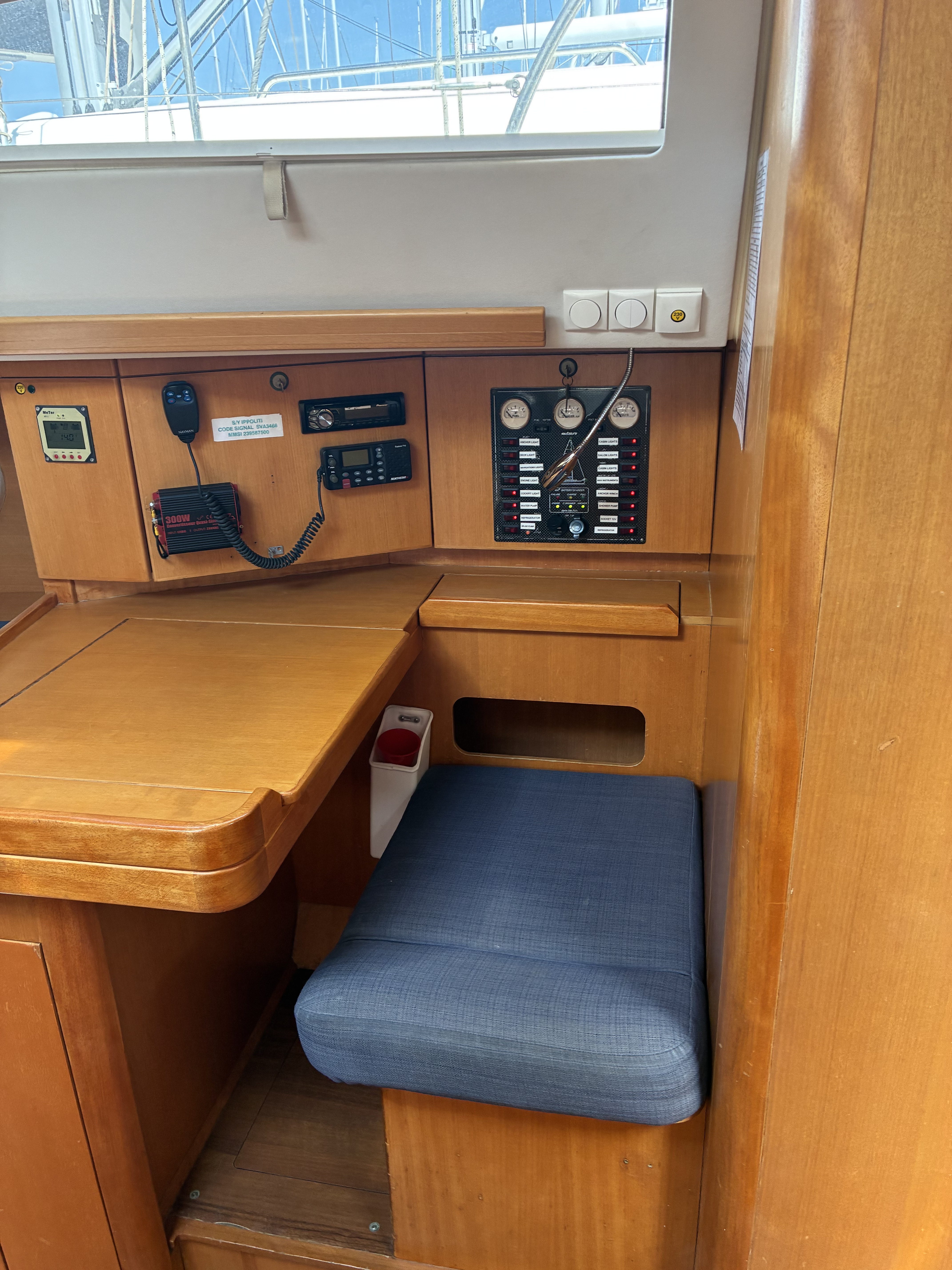 | Navigation | Echo sounder, GPS with chart plotter in cockpit, Harbour books, Navigation set, Nautical charts, Log, Anemometer |