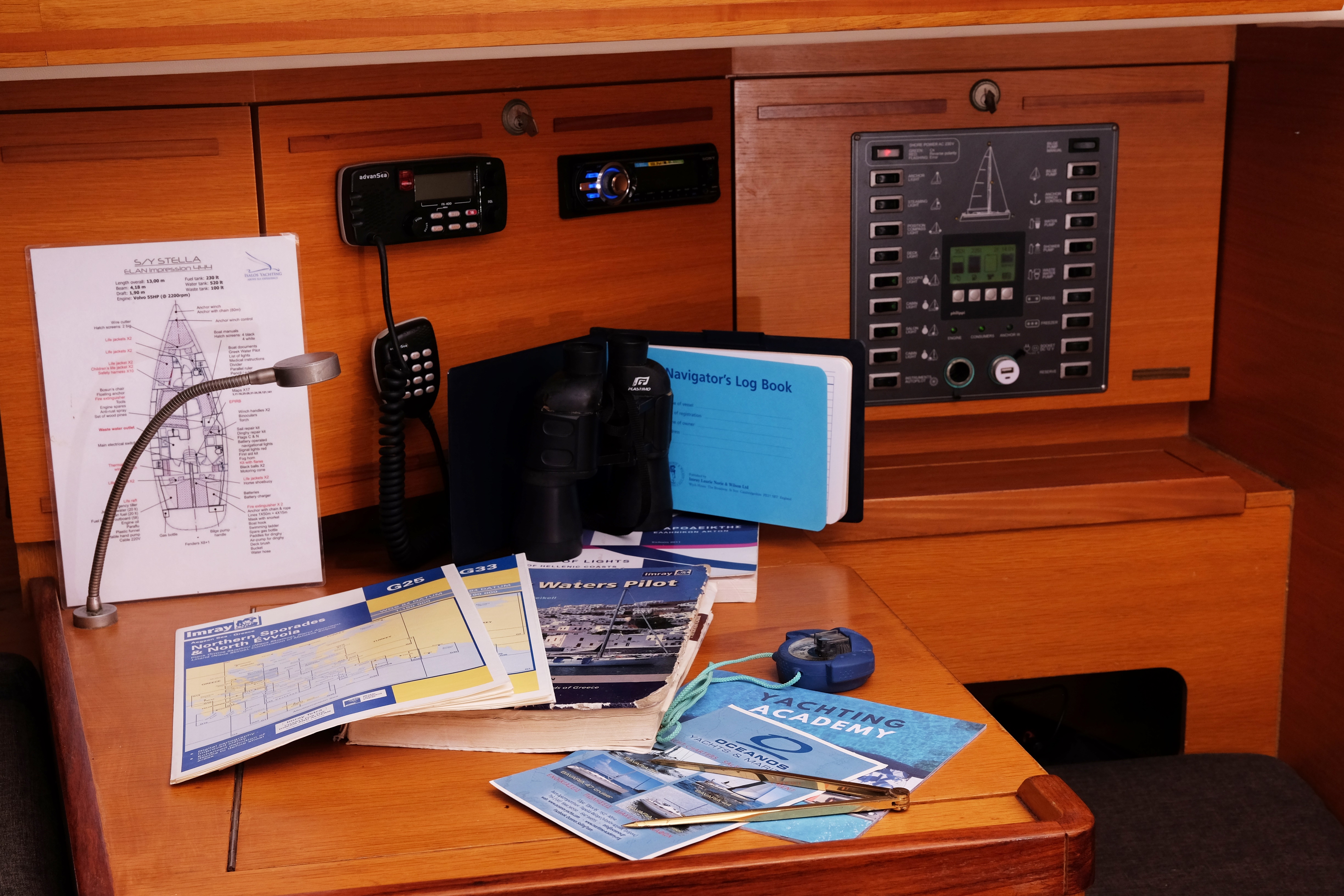 | Navigation | Echo sounder, Harbour books, Compass, Radar, Nautical charts, Anemometer |