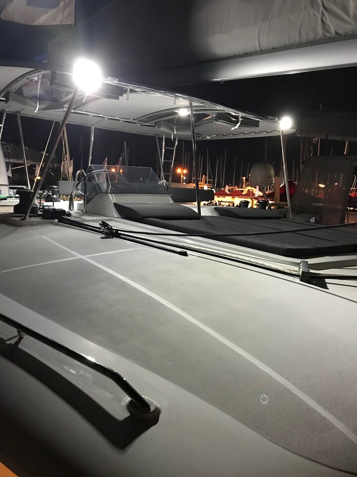 | Outside | Anchor with chain, Bathing ladder, Jerrycan of petrol, Bimini top, Boat hook, Cockpit cushions, Cover brush, Electr. anchor windlass, Fender, Mooring lines, hydraul. Gangway, Plastic bucket, Sprayhood, Wire (shroud) cutter, Winches |
