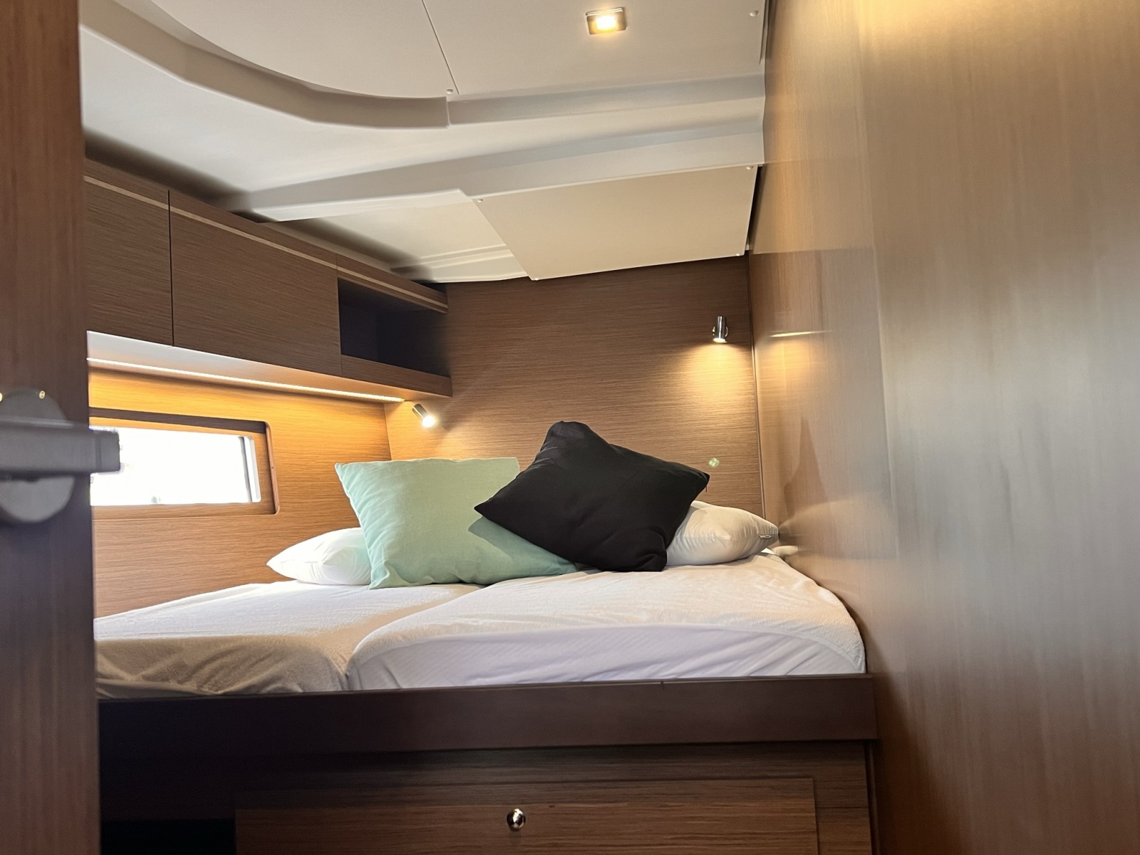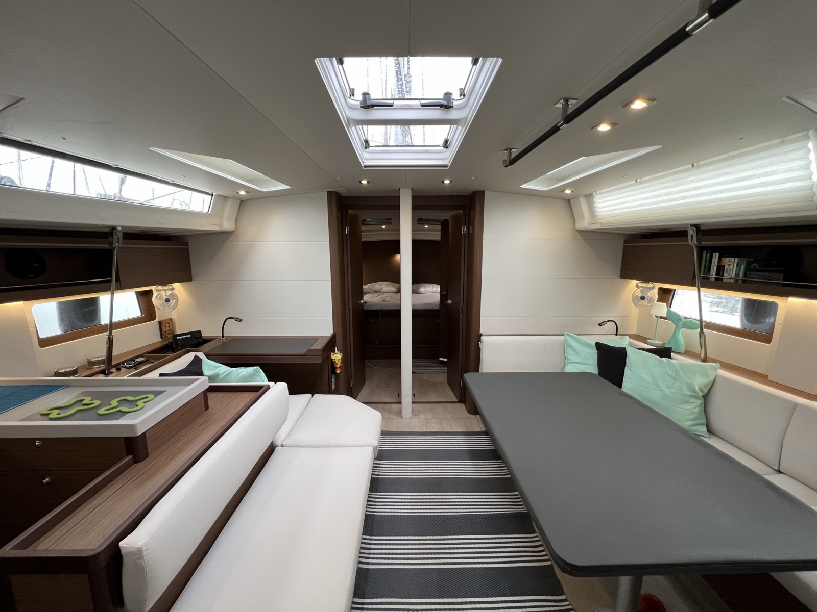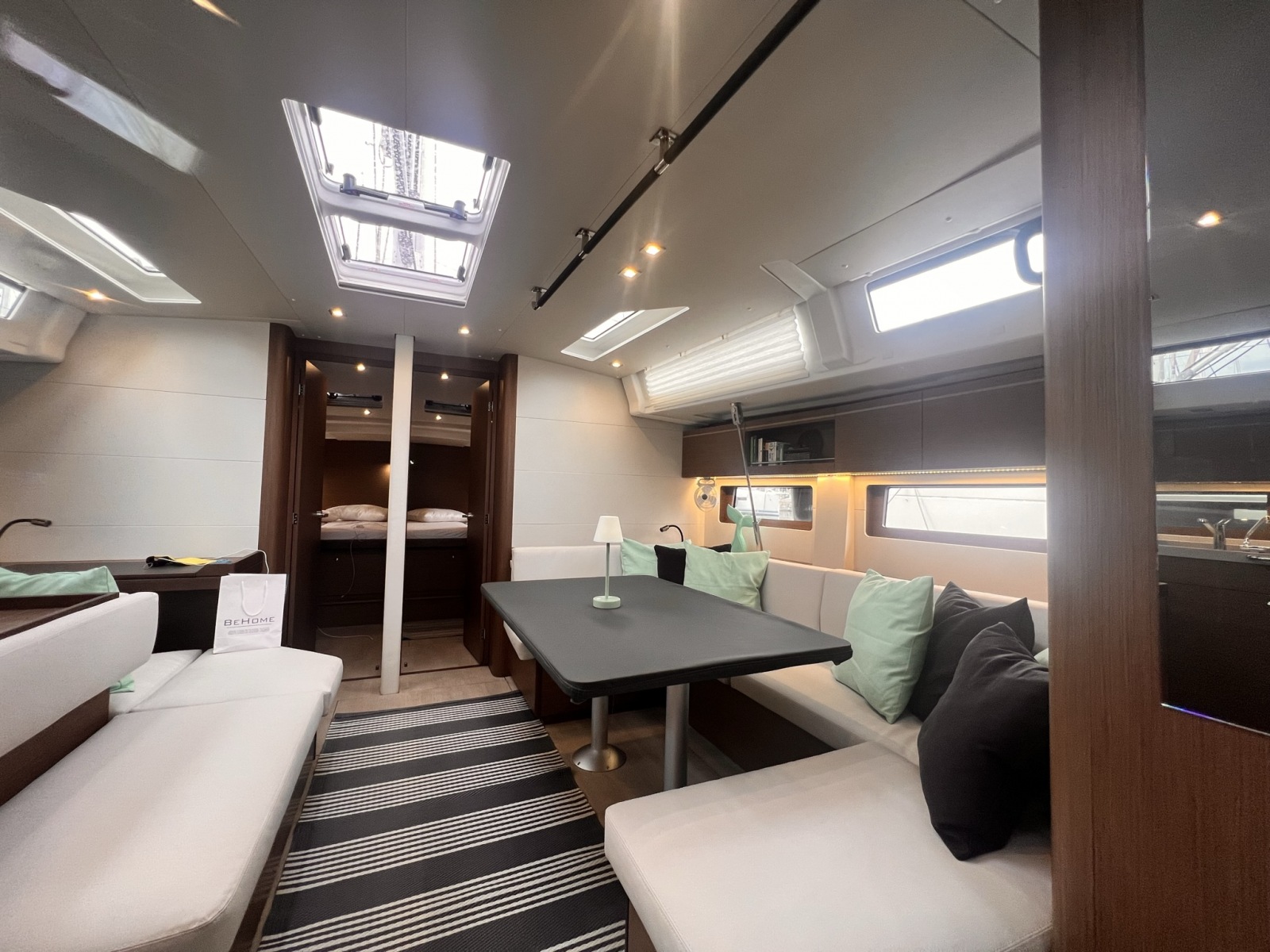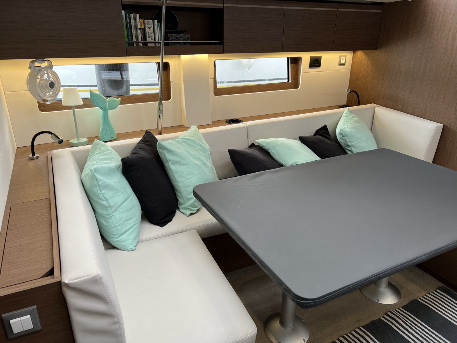| Inside | Freshwater pump, Fusion sound system , Freezer, Generator, Airconditioning (independent from shore power), Cool box, Refrigerator, Battery charger, Speakers in saloon, LED interior lights, Mosquito nets, Radio, Convertible salon table, Cabin & dining area fan |